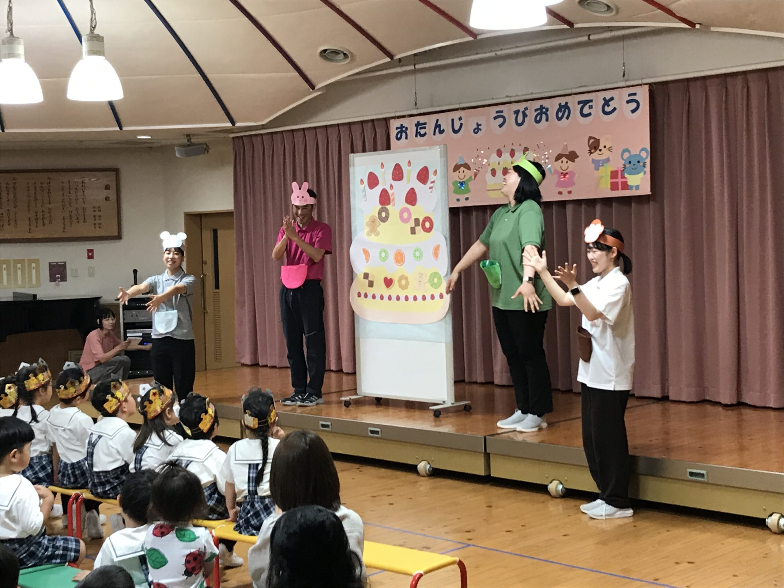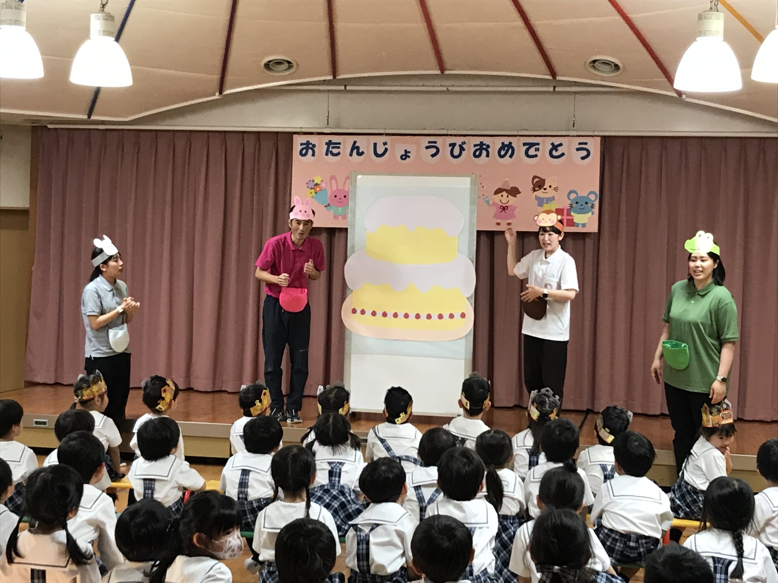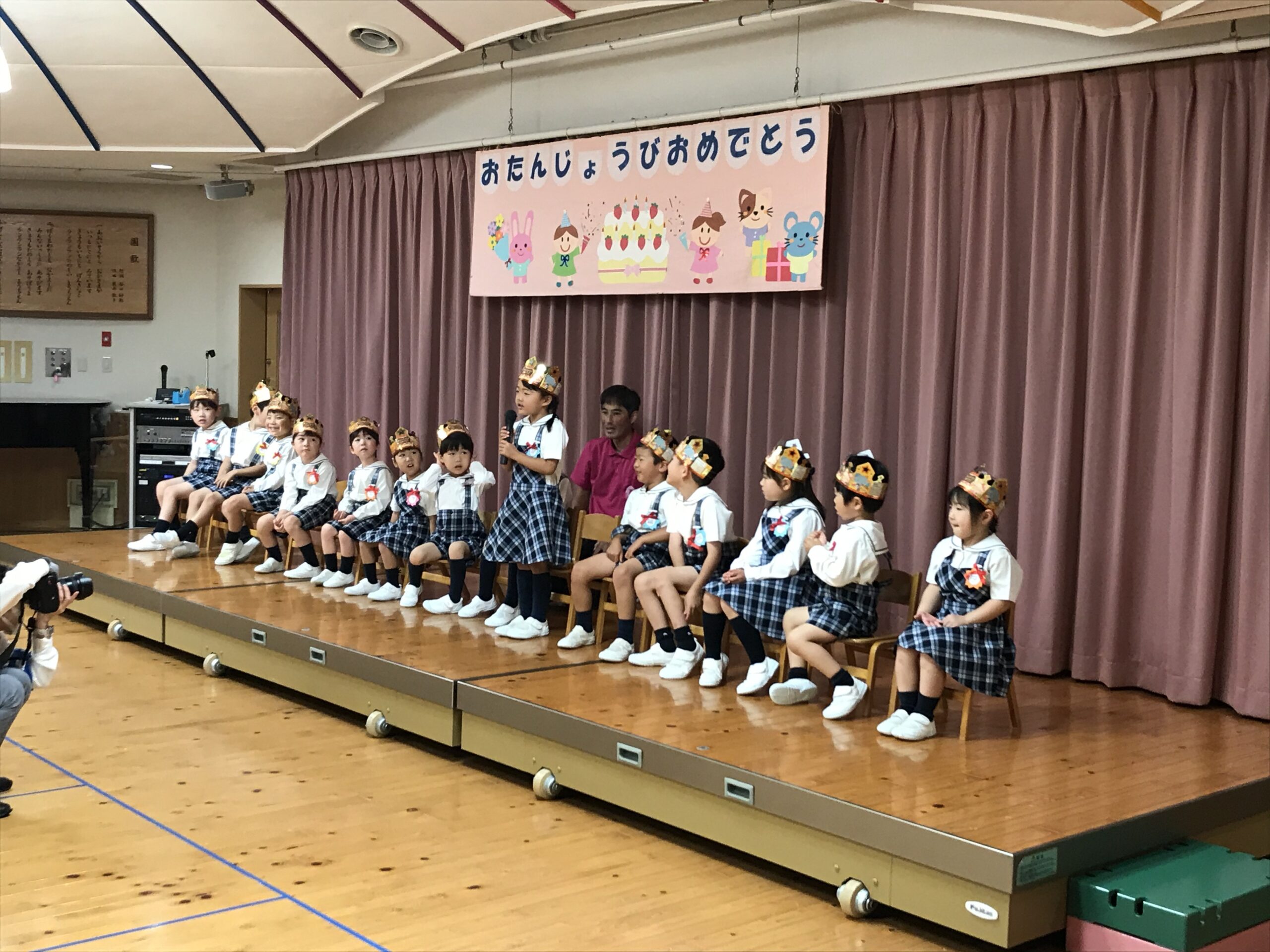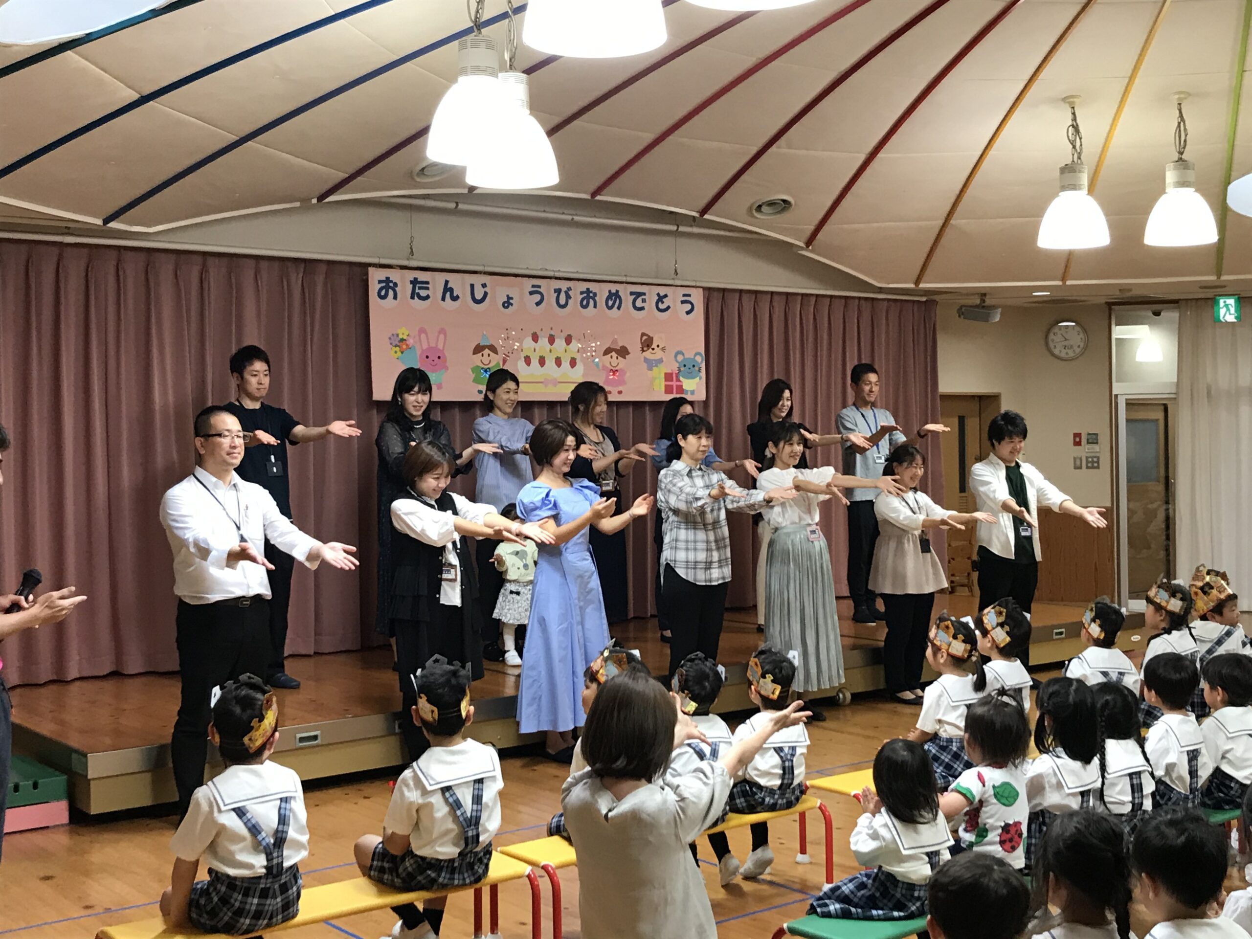 まず初めに、王冠をかぶって舞台上に並んだ4・5月生まれのお友達が、自己紹介をしてくれました。「ハッピーバースデー」の歌をみんなで歌い、園長先生のあいさつの後には、「うきうきバースデイ」の歌で「おめでとう」の気持ちを伝えました。