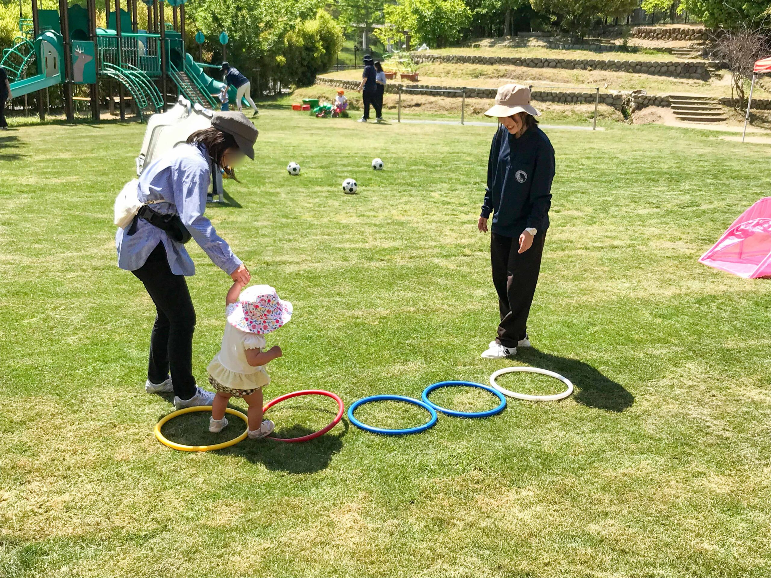 最初は保育室や園庭にご案内して、自由に遊んでいただきました。子どもたちは、芝生の園庭での遊びを、特に気に入ってくれた様子でした。