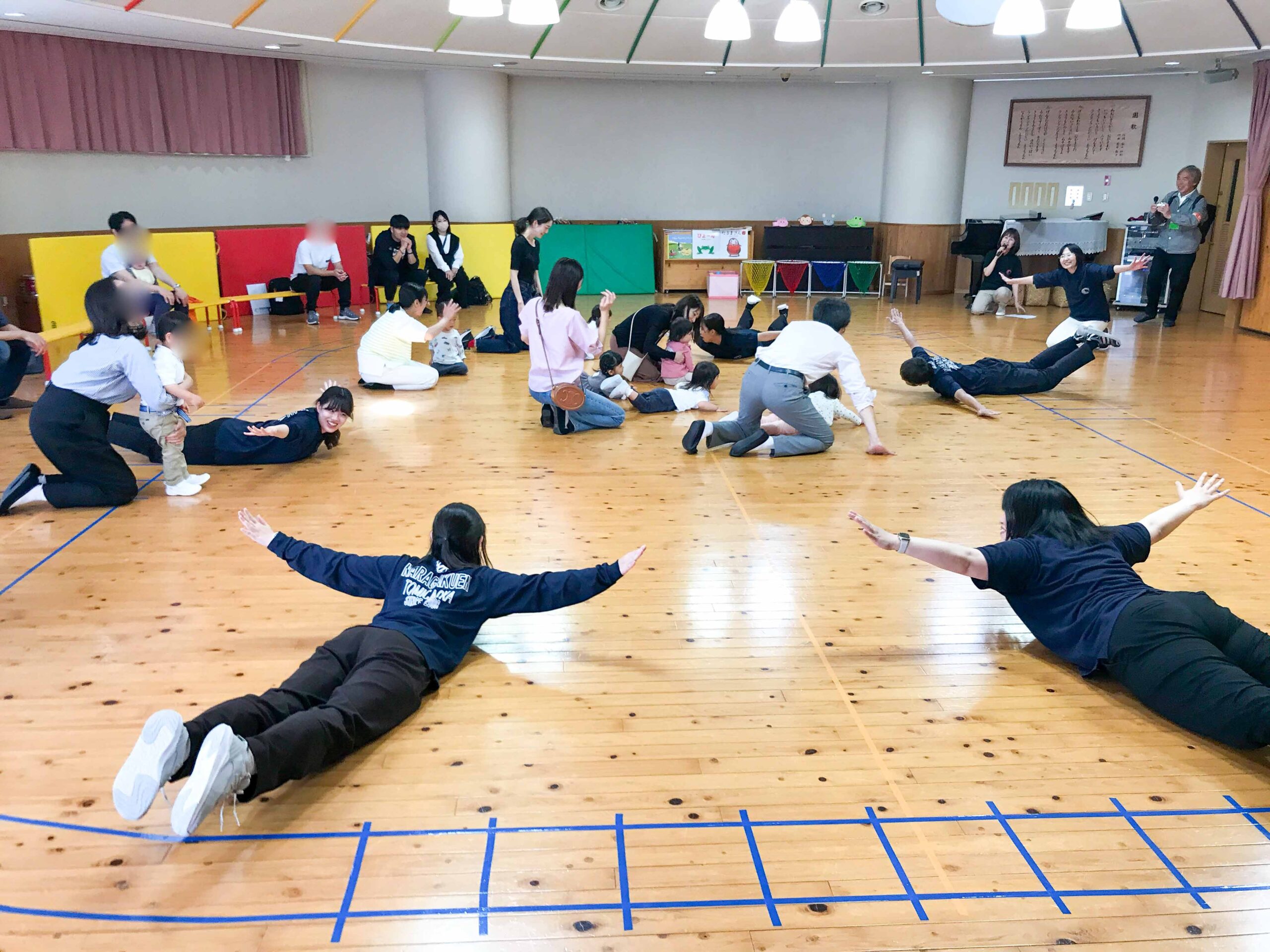 まずは、「ピカピカブー」の体操や「ふわふわちょうちょ」のふれあい遊びなどで、心と体をほぐす軽い運動遊びを。続いて動物にへんしんして楽しむ動物列車の遊びや、カラーボールを使った低床玉入れなどを、保護者の皆さんにも一緒に参加いただいて楽しく行いました。
