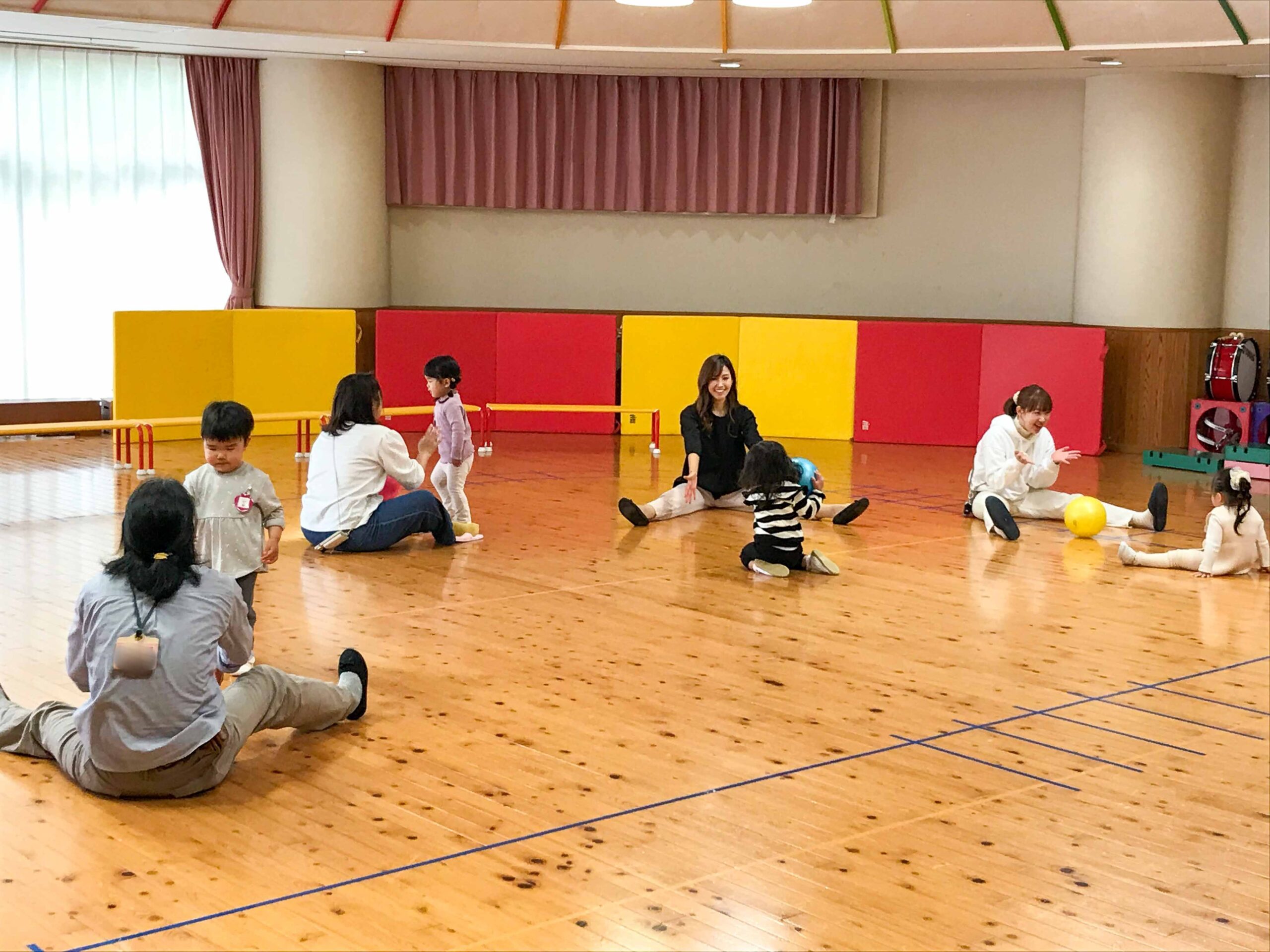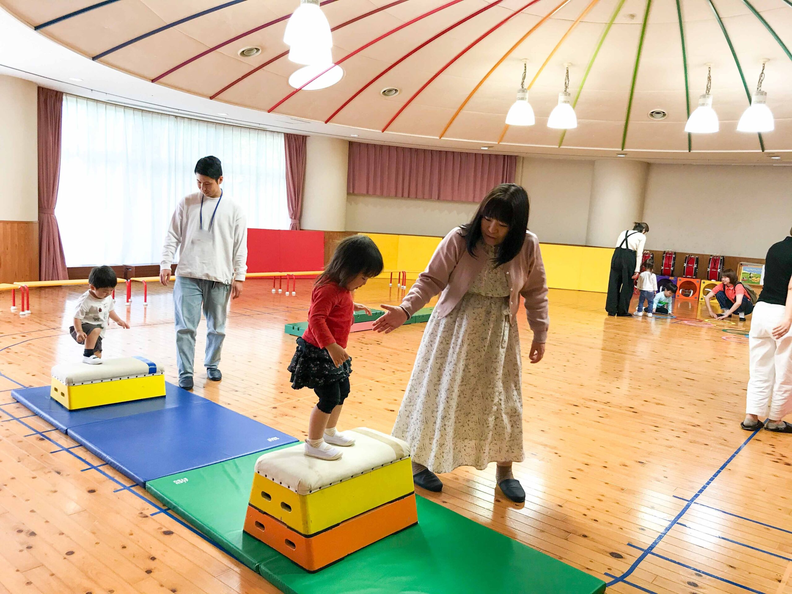 その後、場所を遊戯室に移し、体を使った表現遊びや、跳び箱・マットなどを使った運動遊びを体験しました。