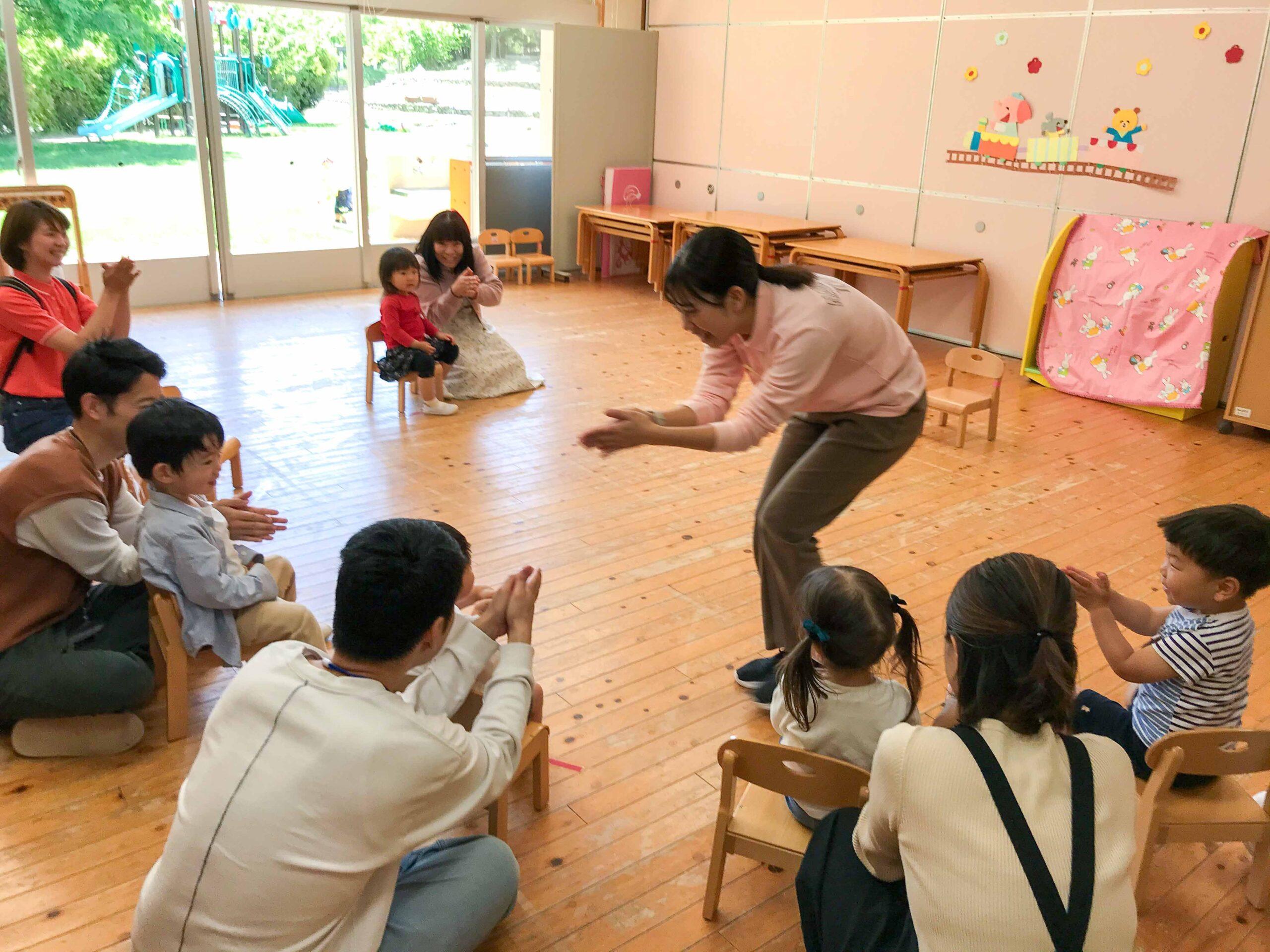 登園後、お部屋や園庭で自由遊びを楽しんでから、お部屋に戻ってごあいさつや手遊びを、お家の方と一緒に行いました。