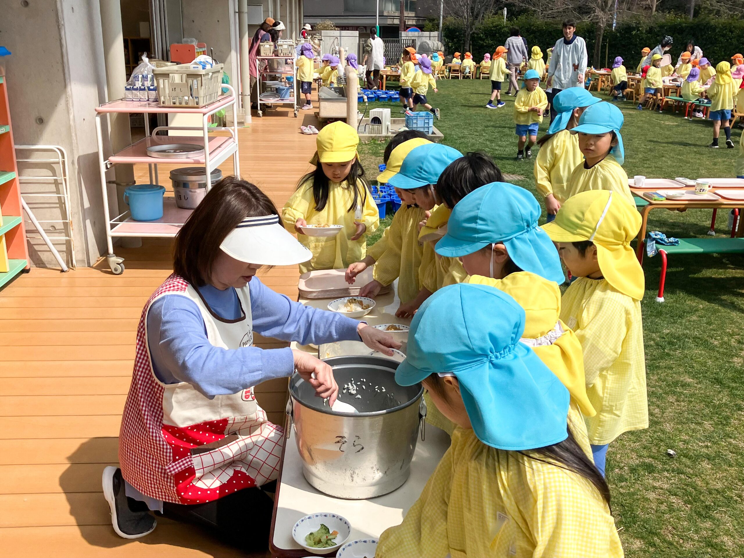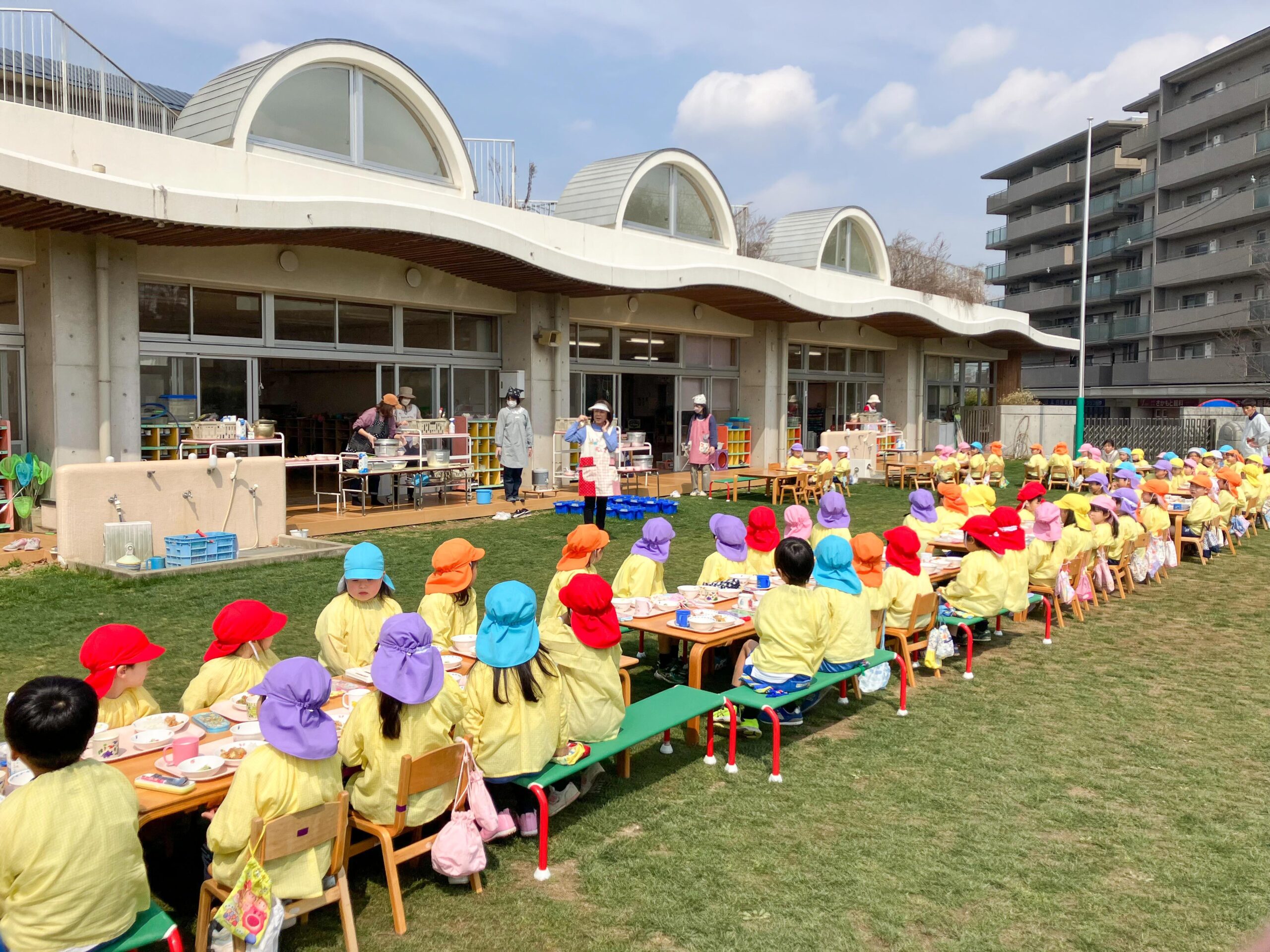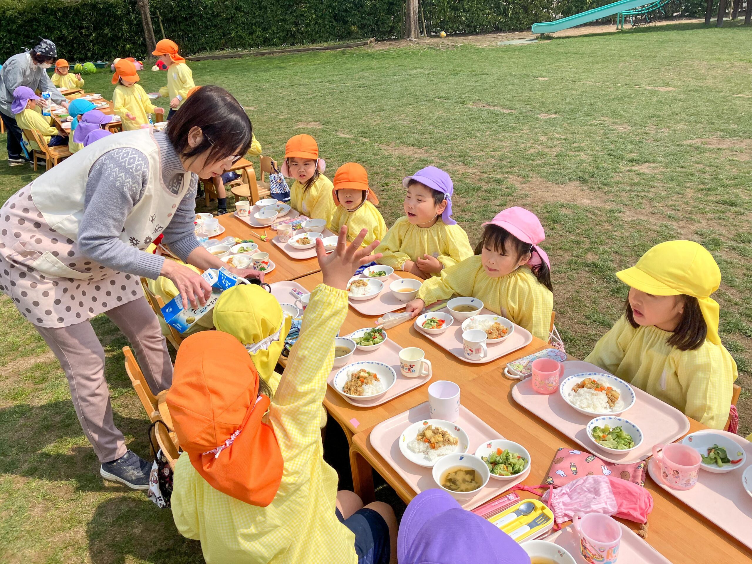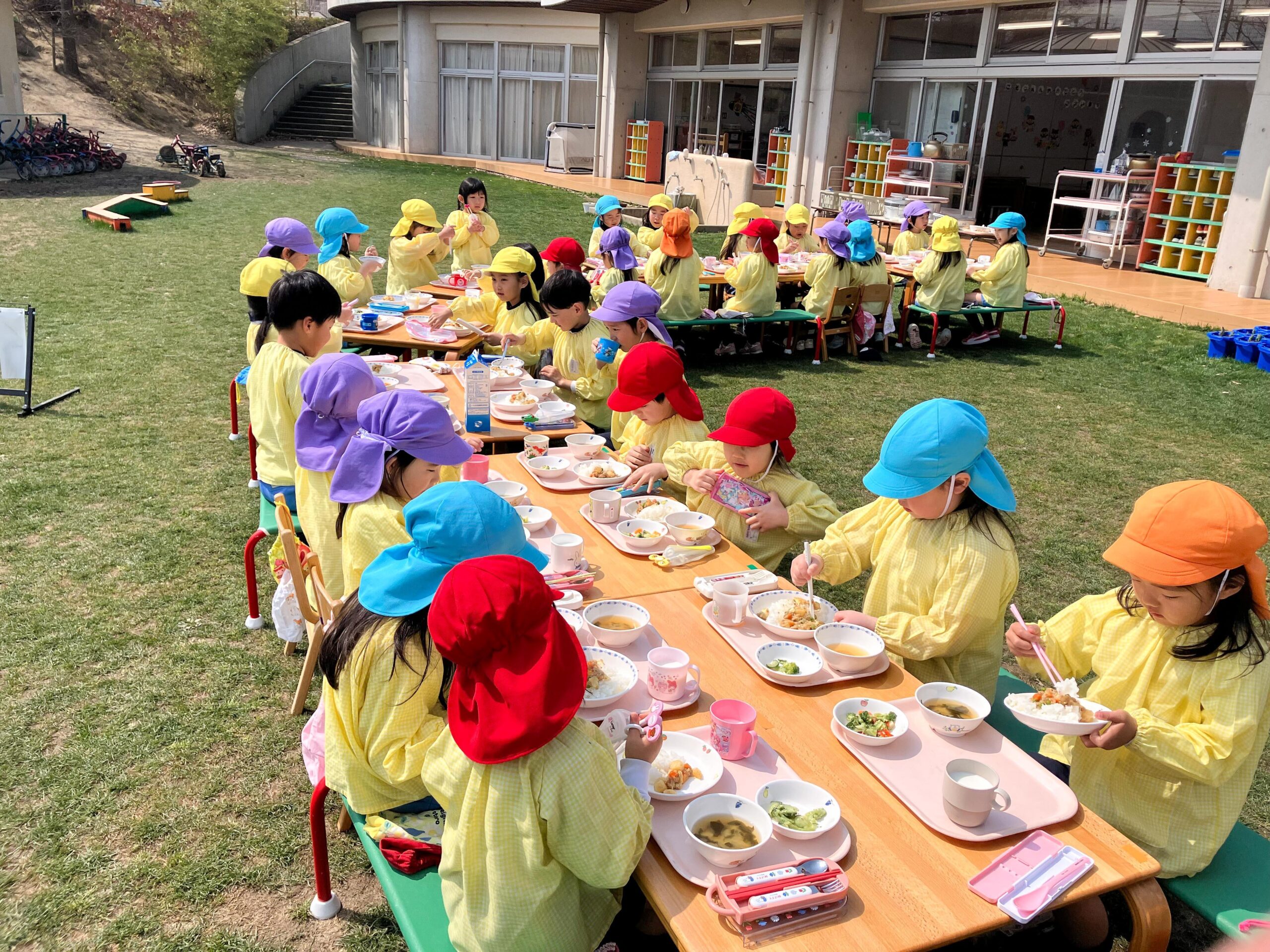 園庭で最後の給食 2024.03.15(金) Post 3月14日(木)が、今年度最後の給食の日。年長組の子どもたちにとっては、幼稚園生活最後の給食の時間でもあります。 幸い春らしい好天に恵まれたので、全園児が園庭に出て、給食をいただくことにしました。 3学年6クラスが混ざり合い、外に机・椅子を出して昼食をとっている姿は、本当に微笑ましいものでした。 年長児の幼稚園生活は、卒園式当日を含めて残すところあと2日間。最後まで楽しんでくれることを願っています。 « お別れ会 第14回卒園式 »