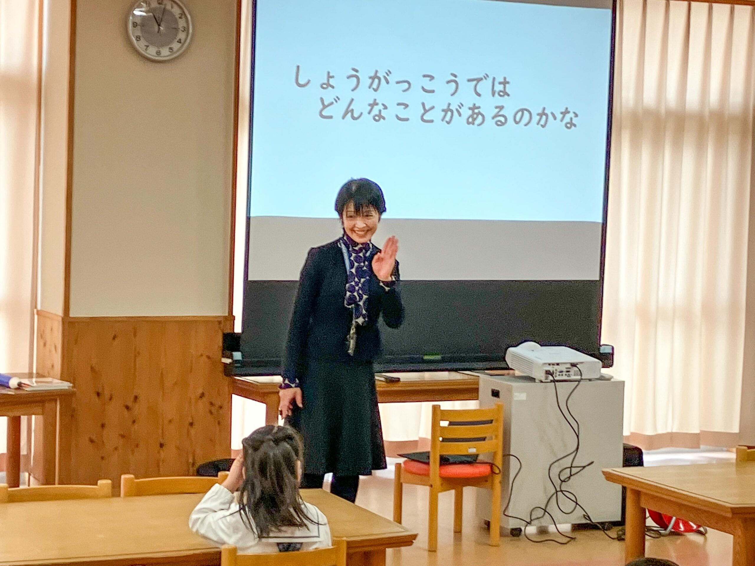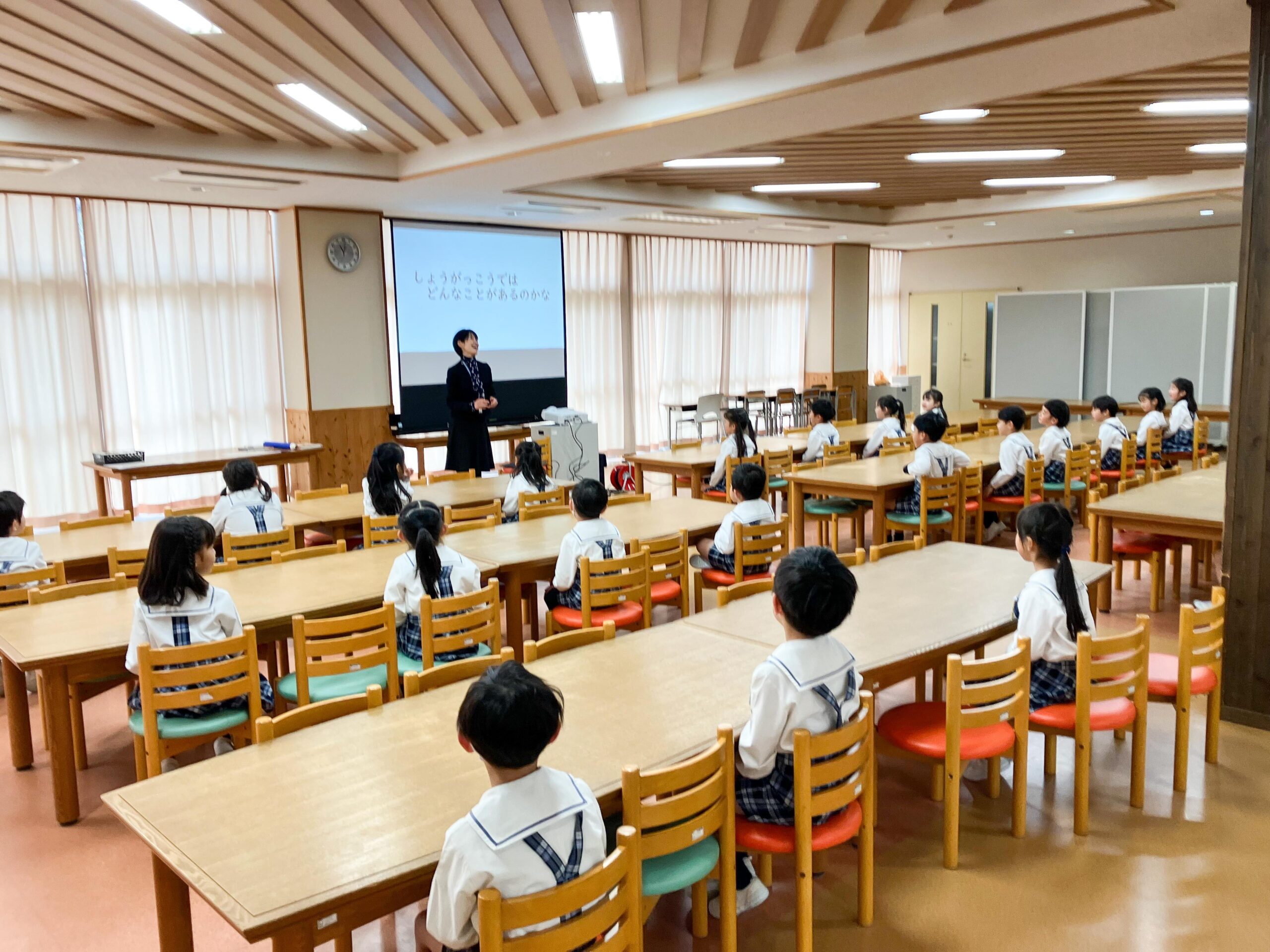 楽しい学習活動(教科書も見せていただきました)や学校行事、遊び時間の過ごし方など、どの小学校でも行われている内容を中心に、わかりやすく説明してくださいました。