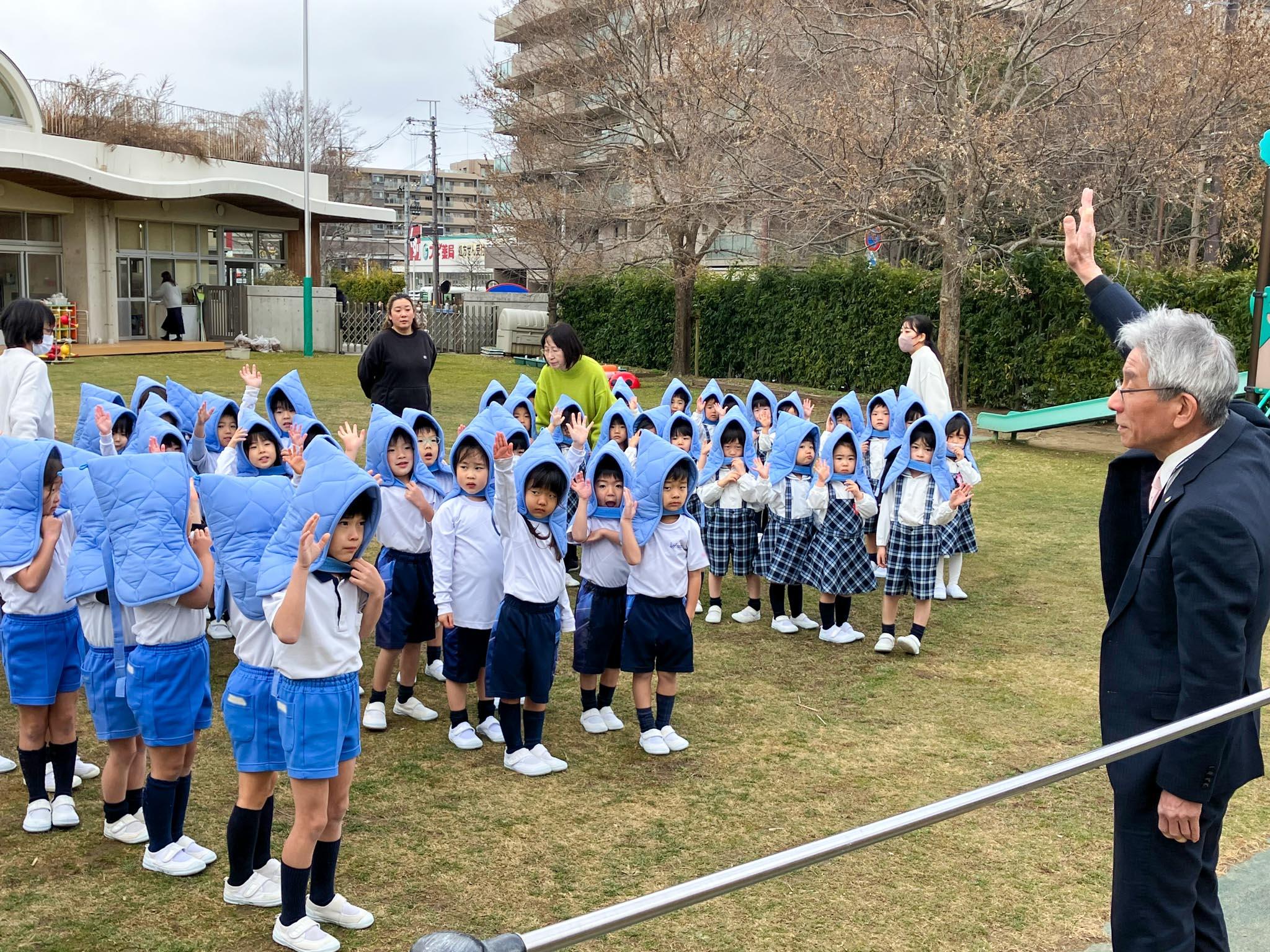 全園児による避難訓練では、そんな一連の動きを確認し、いざという時の心構えについてもお話ししました。
