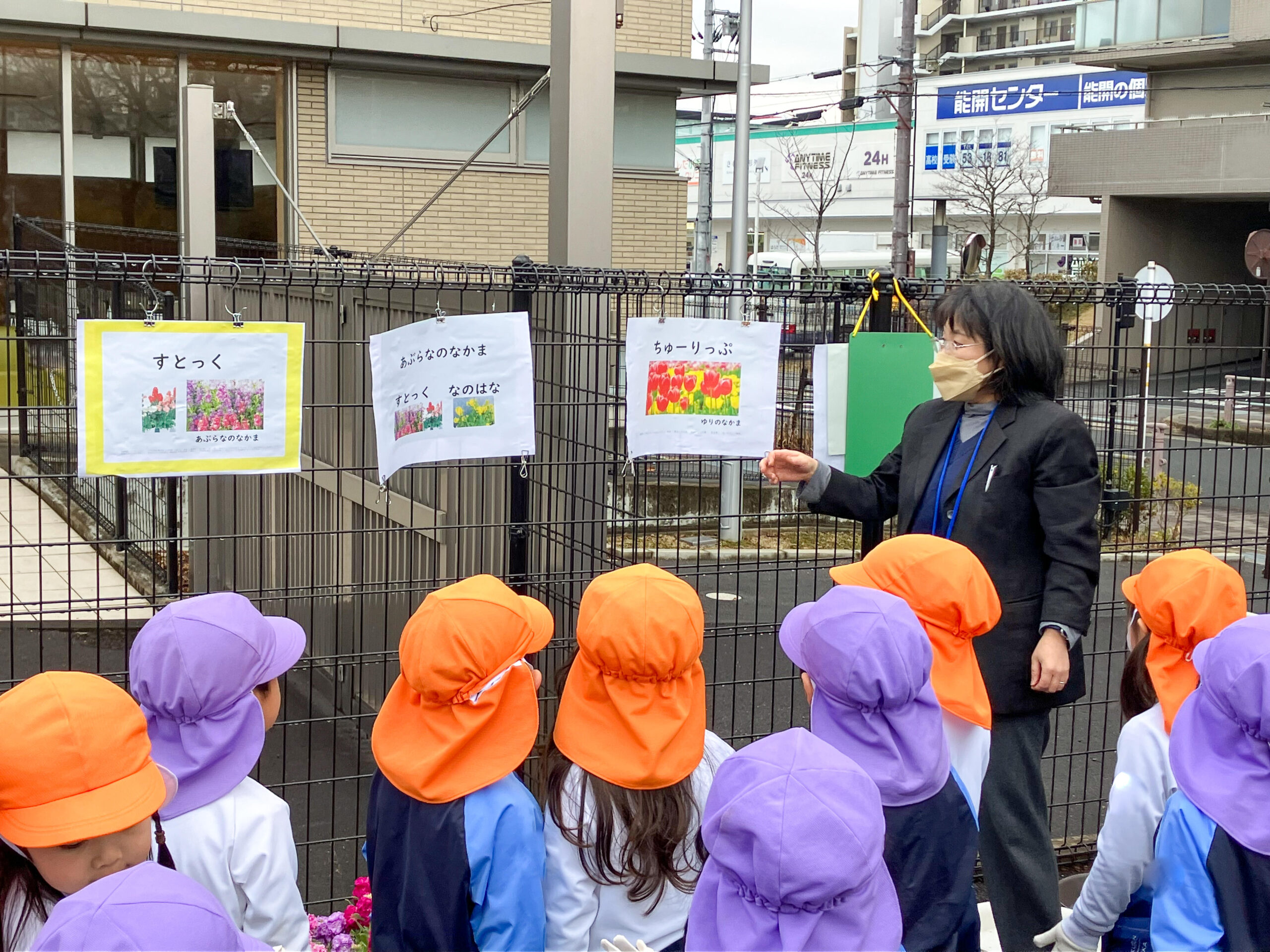 奈良学園大学 人間教育学部の高岡昌子先生が、共同研究の一環として、昨年度から幼稚園玄関前のフェンスそばの一角に、年中組の子どもたちと交流しながらお花を育ててくださっています。