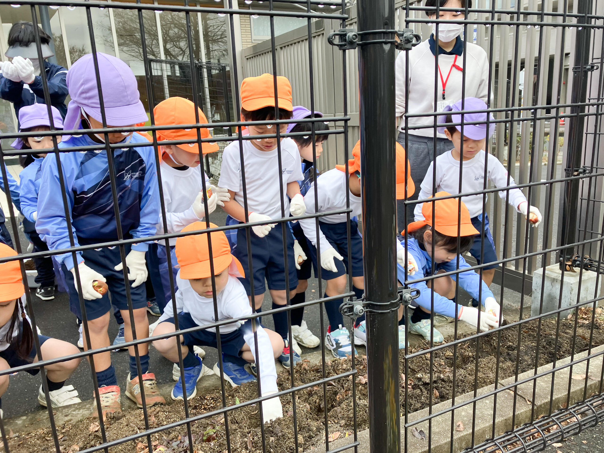植えるのは、チューリップの球根とパンジー・ビオラ・ストックの花苗です。最初にチューリップの球根を植えました。穴に球根を埋め、上からそっと土をかぶせました。花苗はスコップで穴を掘り、そこに植えていきました。