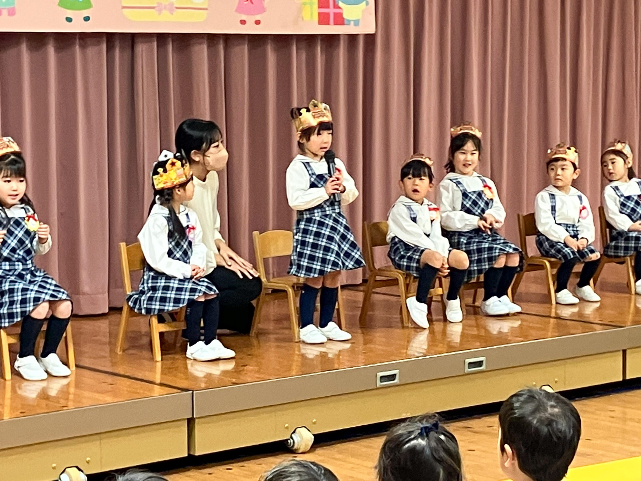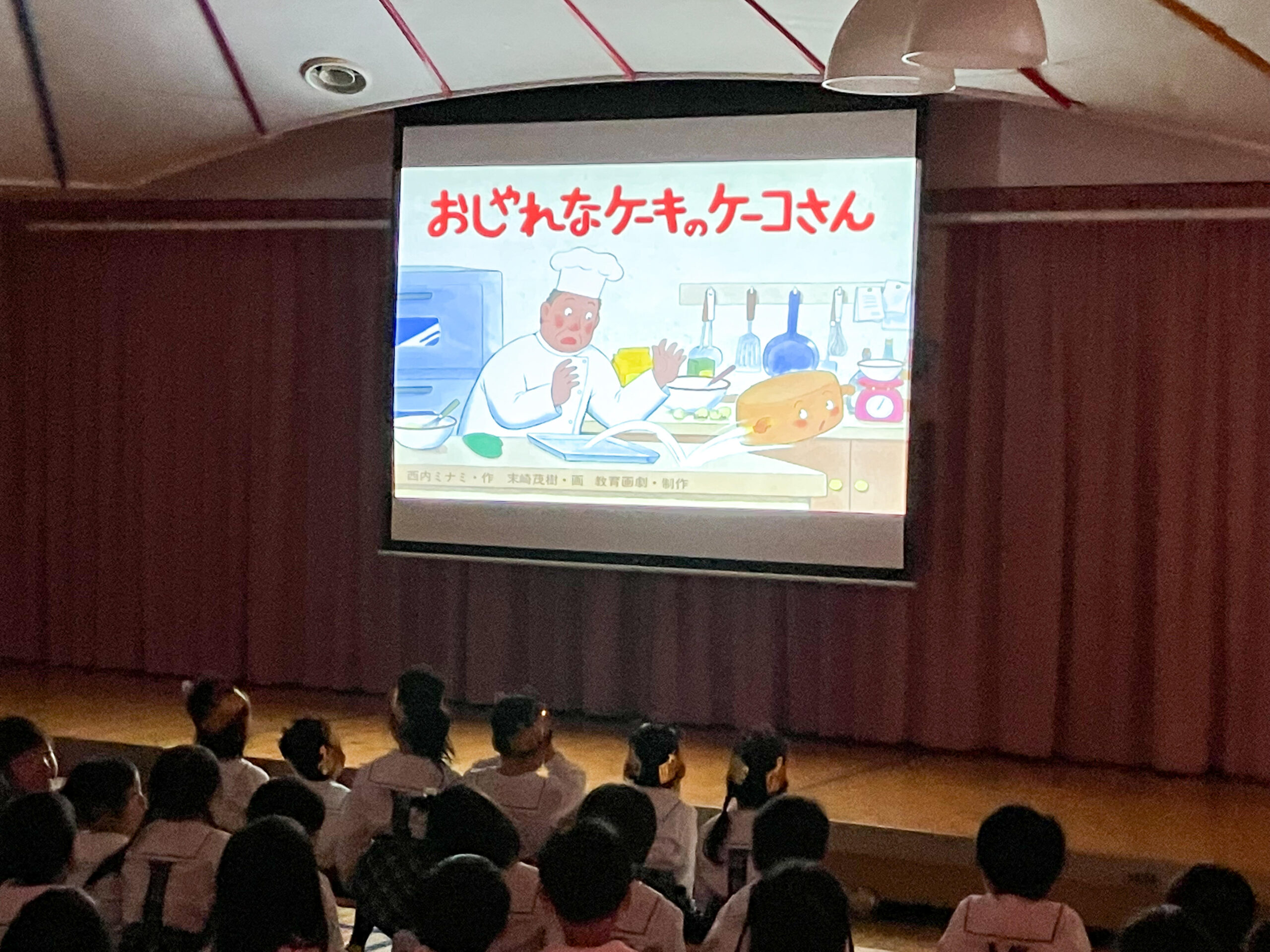 先生方からの出し物は「おしゃれなケーキのケーコさん」のお話です。大きなスクリーンに映し出された紙芝居。先生方の熱演で、子どもたちも最後までお話に集中していました。お話が終わると、「おめでとう!」の言葉とともにクラッカーが鳴り響きました。
