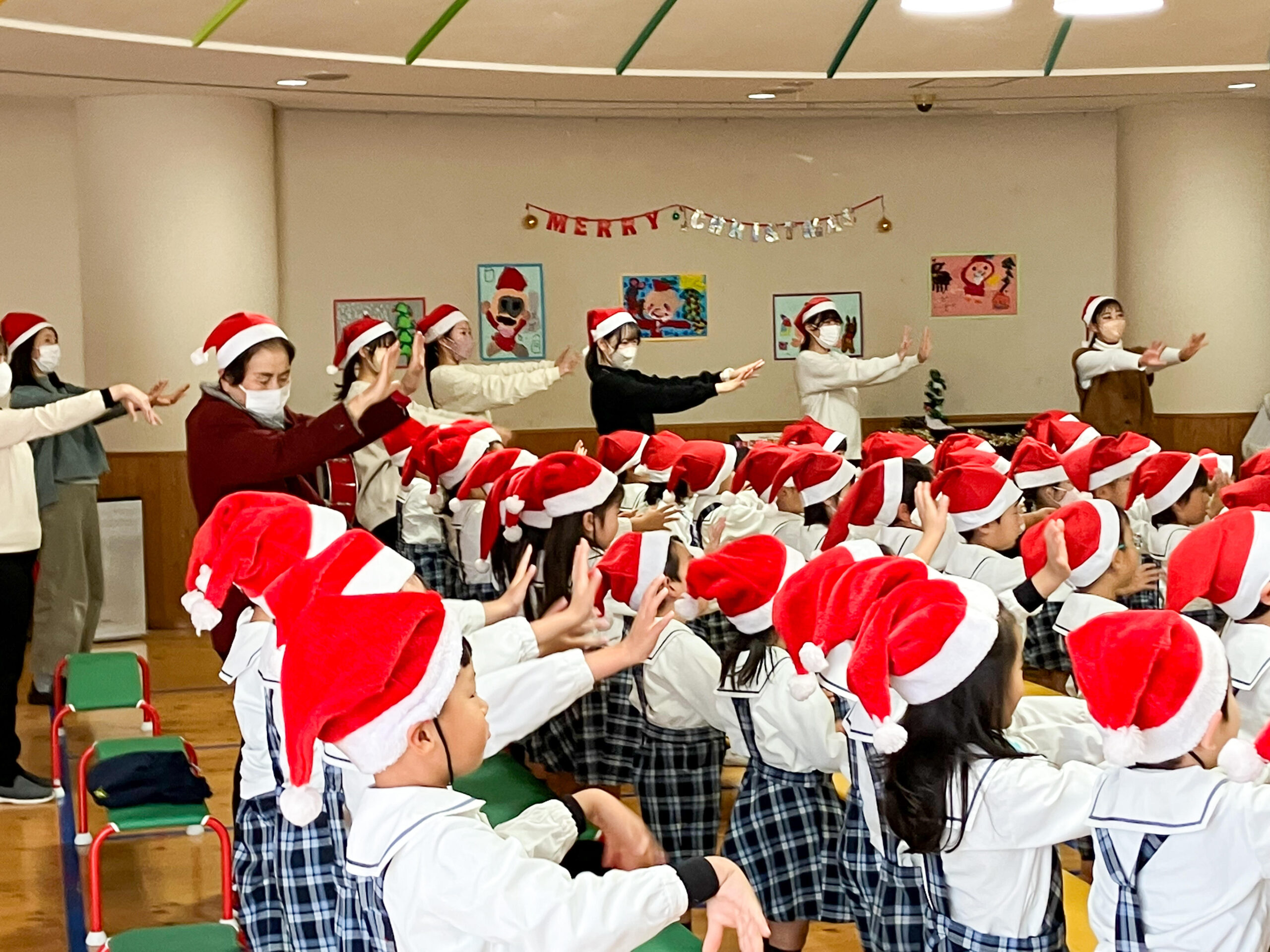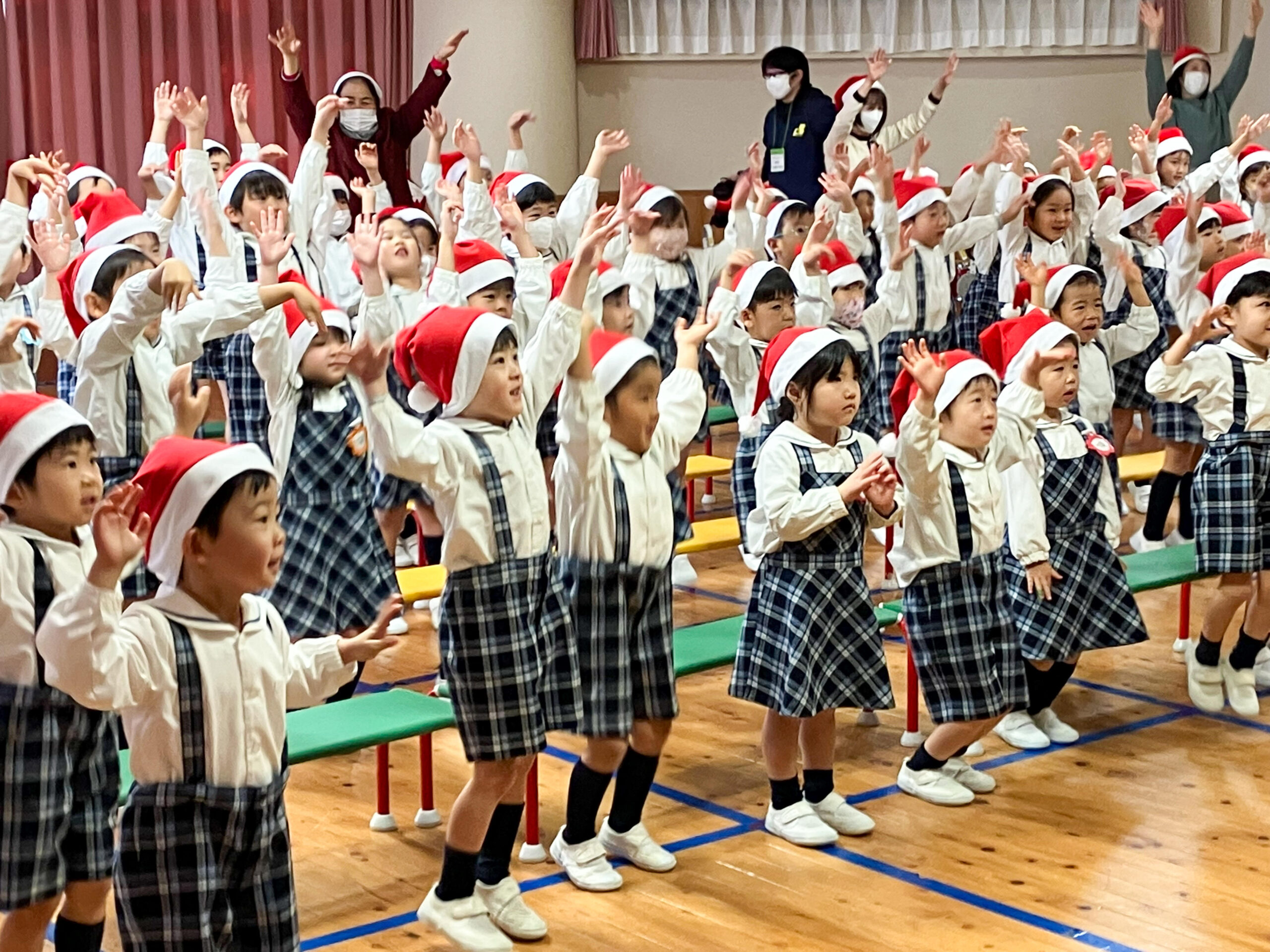 次は、先生方によるパネルシアター。サンタさんにちなんだお話が、クリスマスソングに乗って繰り広げられていきます。そんなお話が終わる頃、ついに本物のサンタさんが登場しました。先生の質問にも答えてくれたサンタさん。最後に子どもたちへ1人ずつプレゼントを渡してくれました。