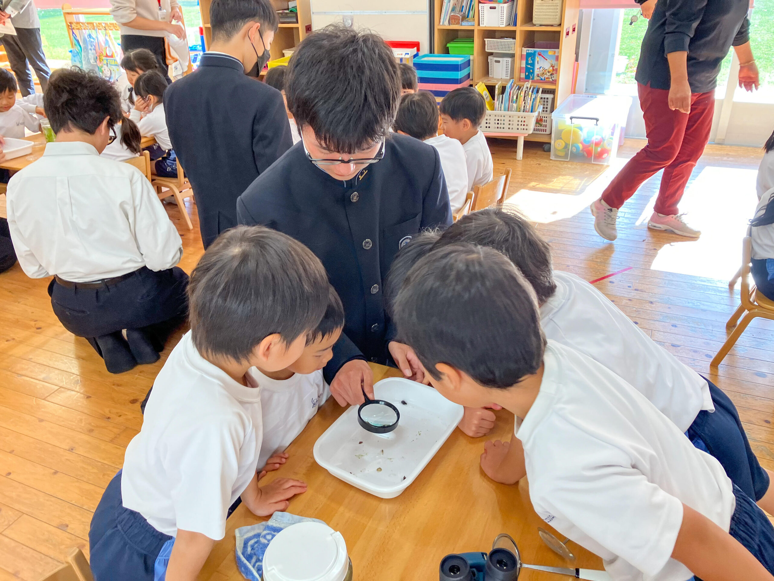 次は、総合門前のビオトープまで出かけ、研究会の皆さんが掬い取ってくれた生き物の観察です。ヌマエビやカワニナの他に、「どんこ」というお魚も見ることができて、子どもたちは大喜び。
