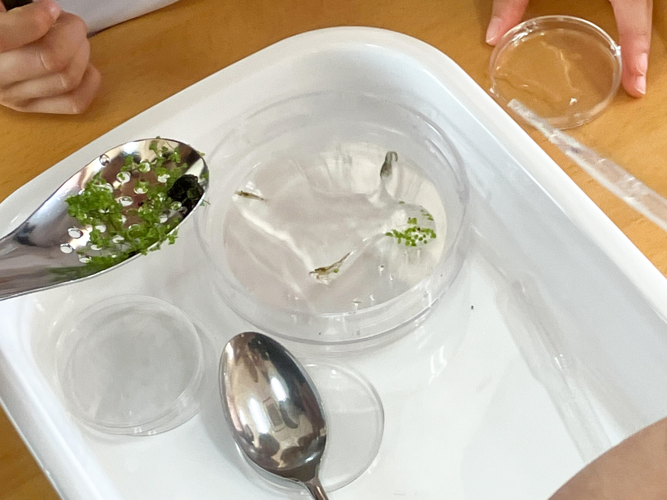 まずお部屋で、研究会の皆さんが総合門前のビオトープで採取してきてくれたヌマエビを、虫眼鏡を使ってじっくり観察しました。交代しながら双眼顕微鏡で、さらに拡大して見ることもできました。また、透き通った体の真ん中に見える黒い線が、ヌマエビの腸であることも高岡先生から教えてもらいました。