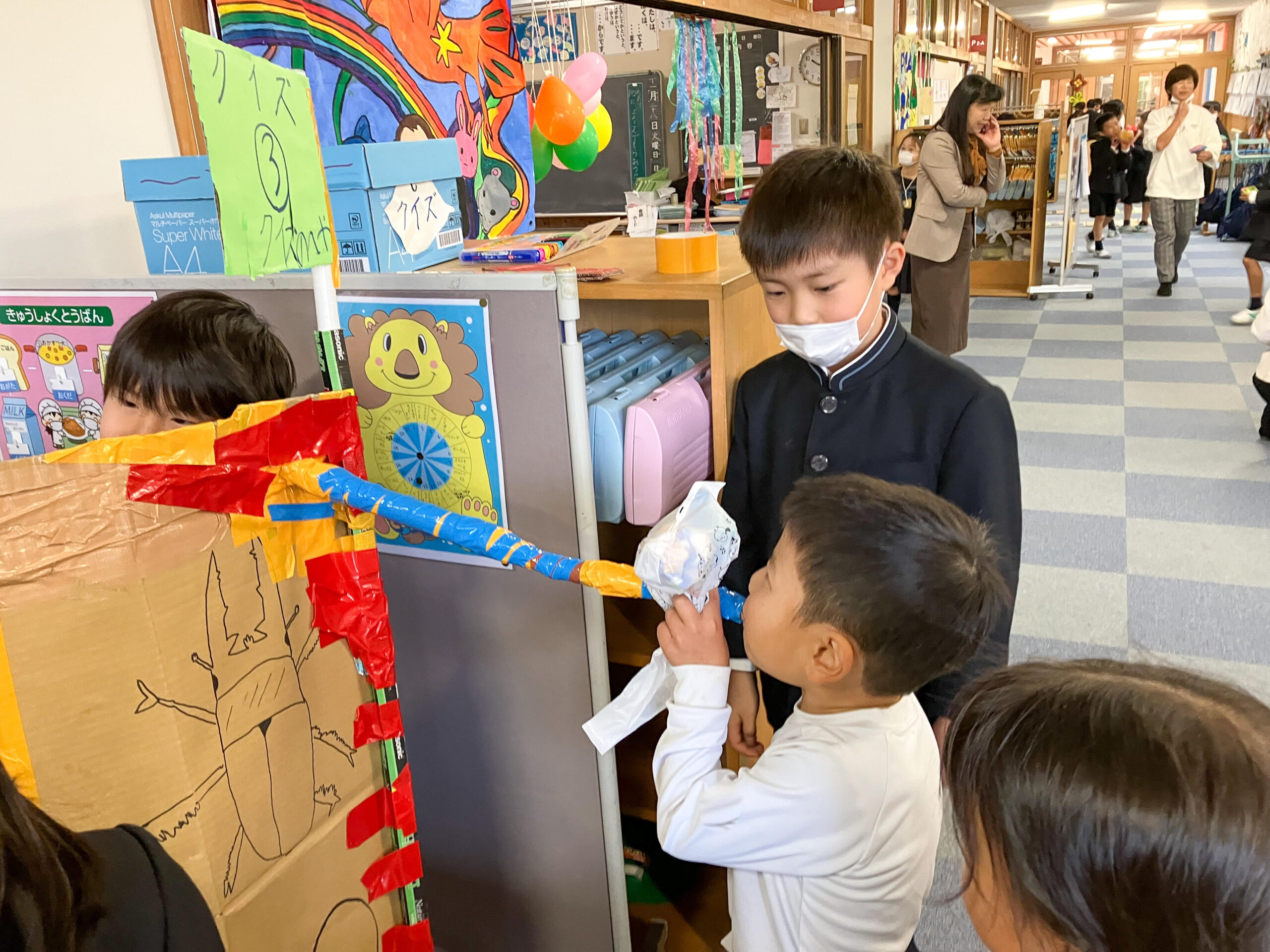 P2教室前に到着すると、輪投げに的当て、ボウリング、クイズ、お化け屋敷などなど、楽しそうな手作りアトラクションがたくさん用意されていました。子どもたちはP2生の説明を受けてから、次々に遊びを体験していきます。遊び終わるとブースごとにプレゼントももらうことができて、満足感いっぱいの交流会になりました。