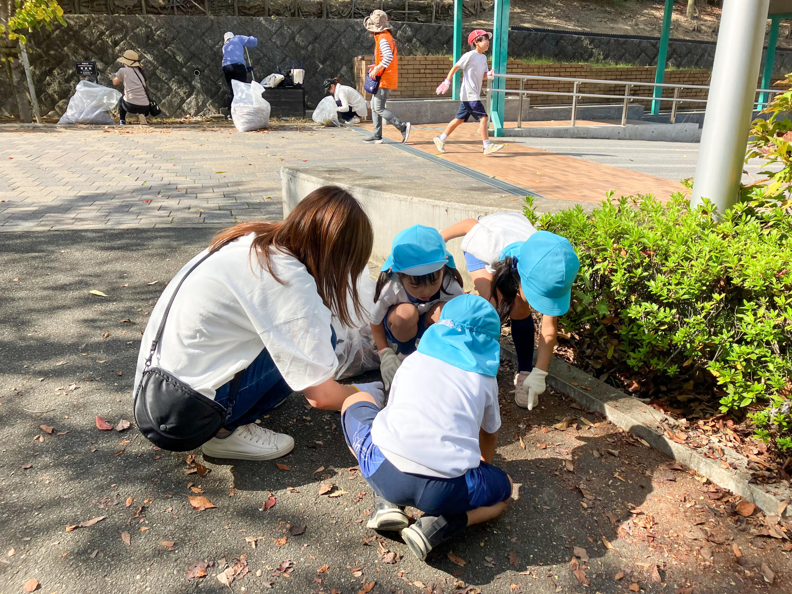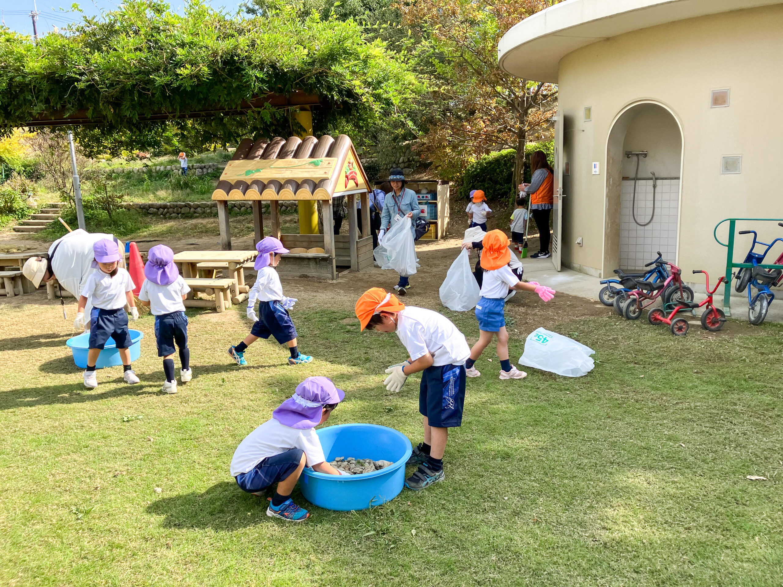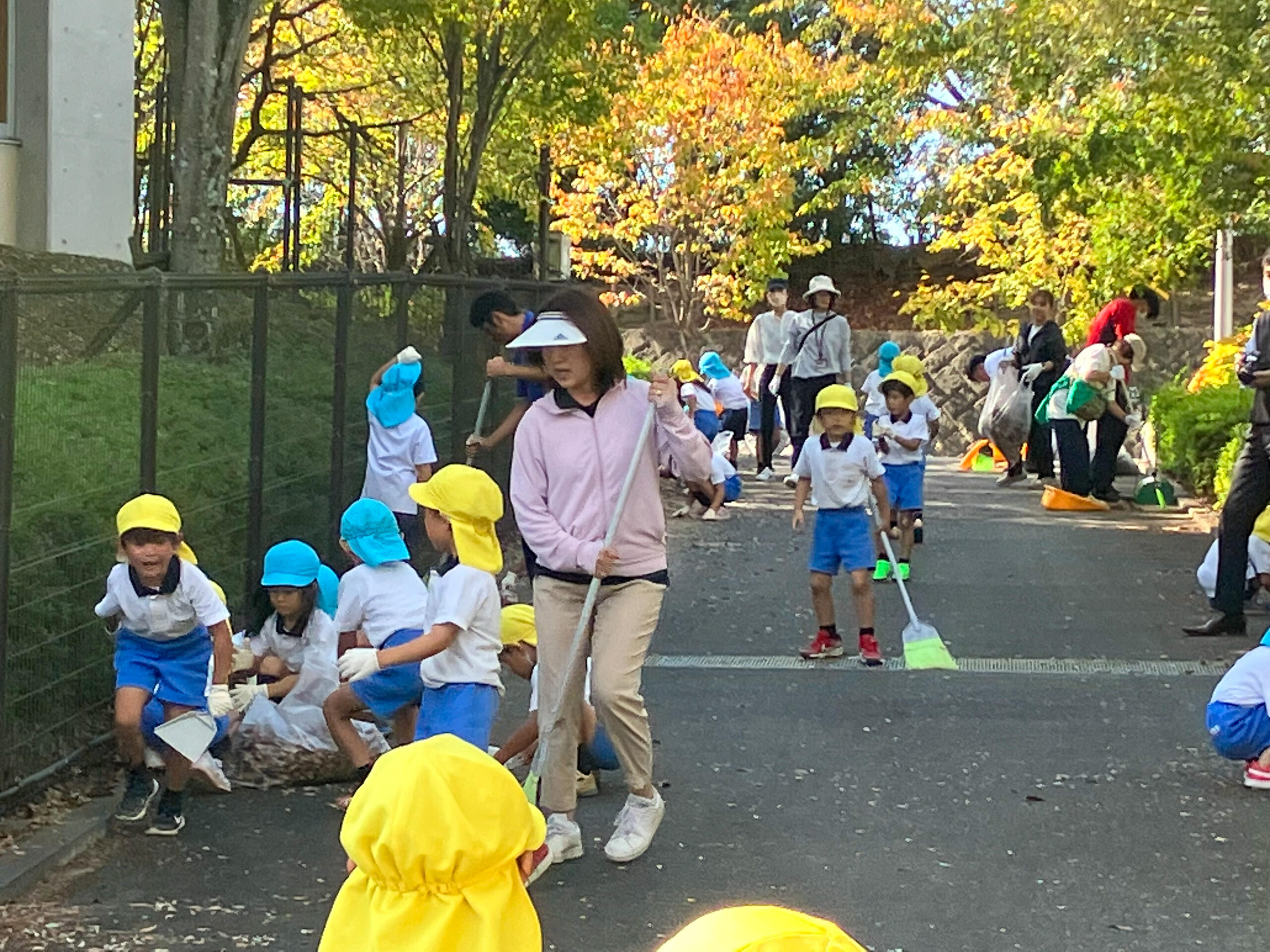 幼稚園では年長組の子どもたちがプロムナード周辺で、年中・年少組の子どもたちが園庭で清掃作業を行いました。