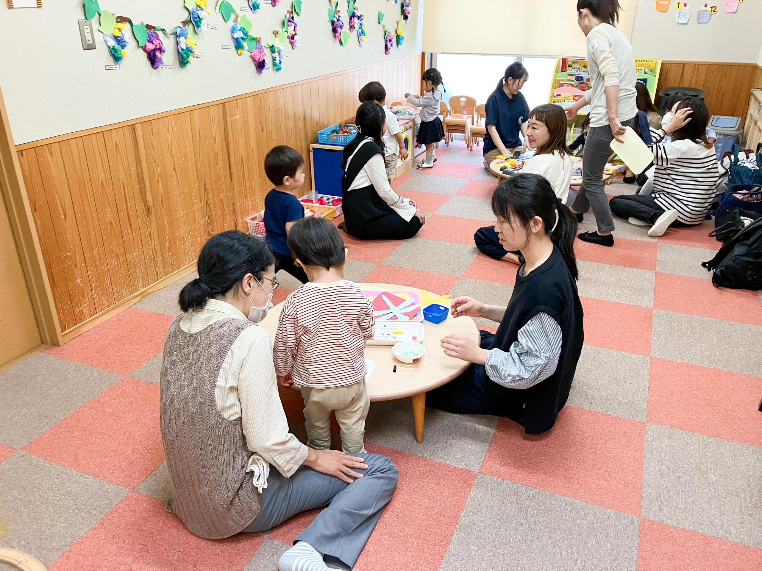 いちご組のお部屋で、お母さんと一緒に保育体験をしていただきました。