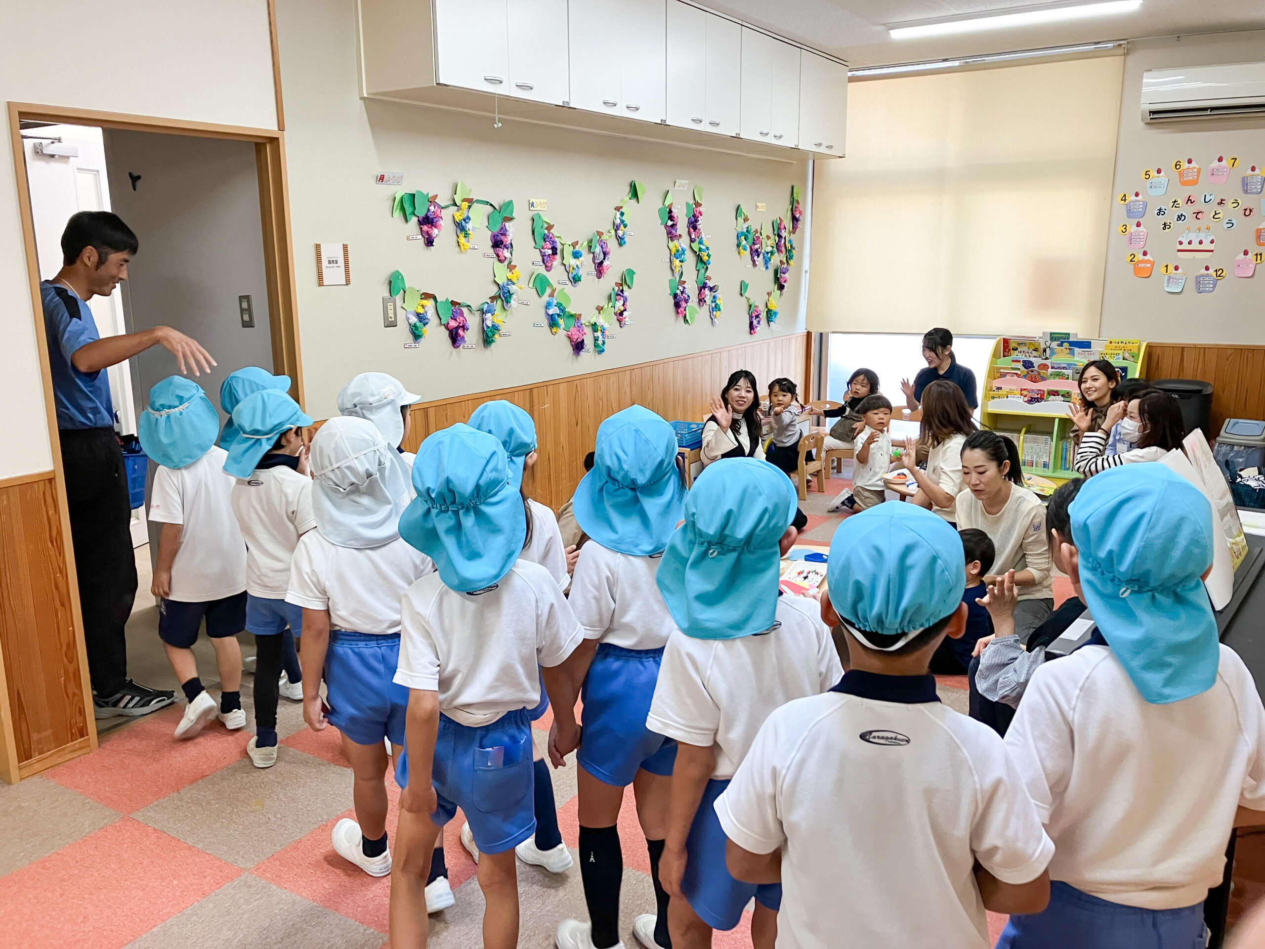 お部屋を通って運動会練習に向かう年中・年長組の子どもたちも、少しだけごあいさつができました。