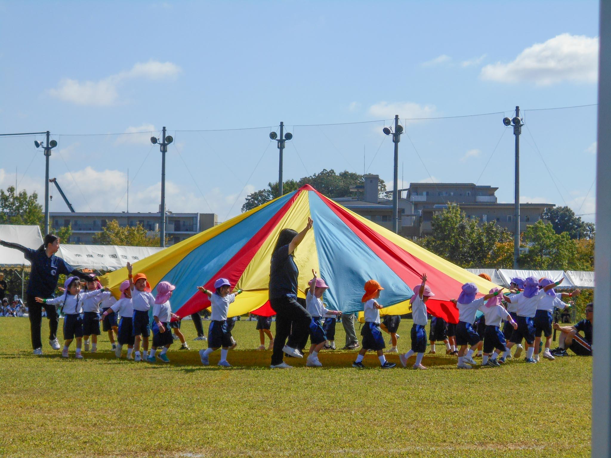 参加種目は幼稚園単独の演技「ダンスホール」(バルーンの演技を見ていただきました)、異学年競技の「はこんで!つないで!レッツゴー!」(ボール運びリレーです)、「バトンをつなげ!とみっこオールスターリレー」(最初に代表の園児が走りました)、「奈良登美弾」(幼小中高合同でのダンスです)の4つ。