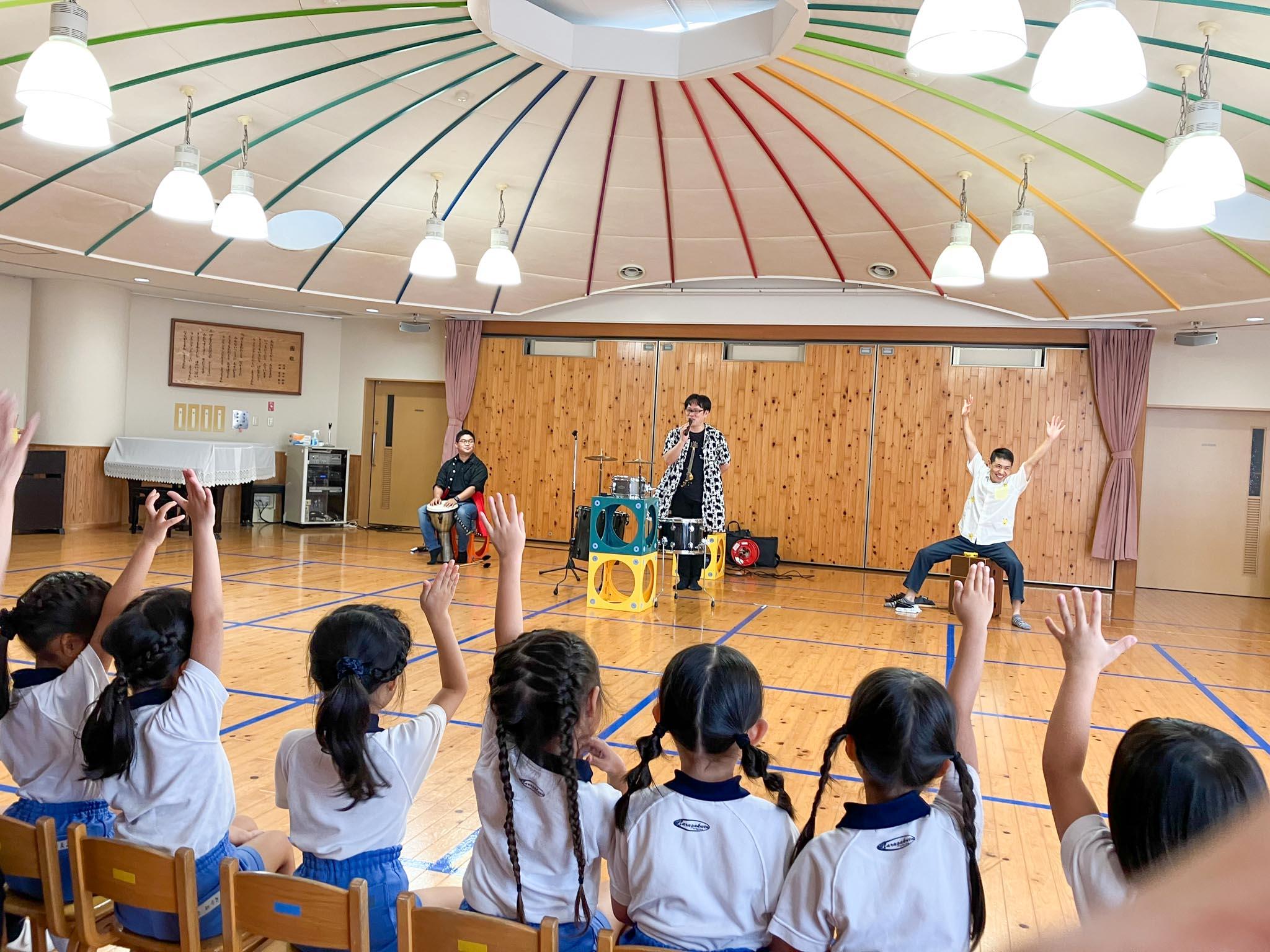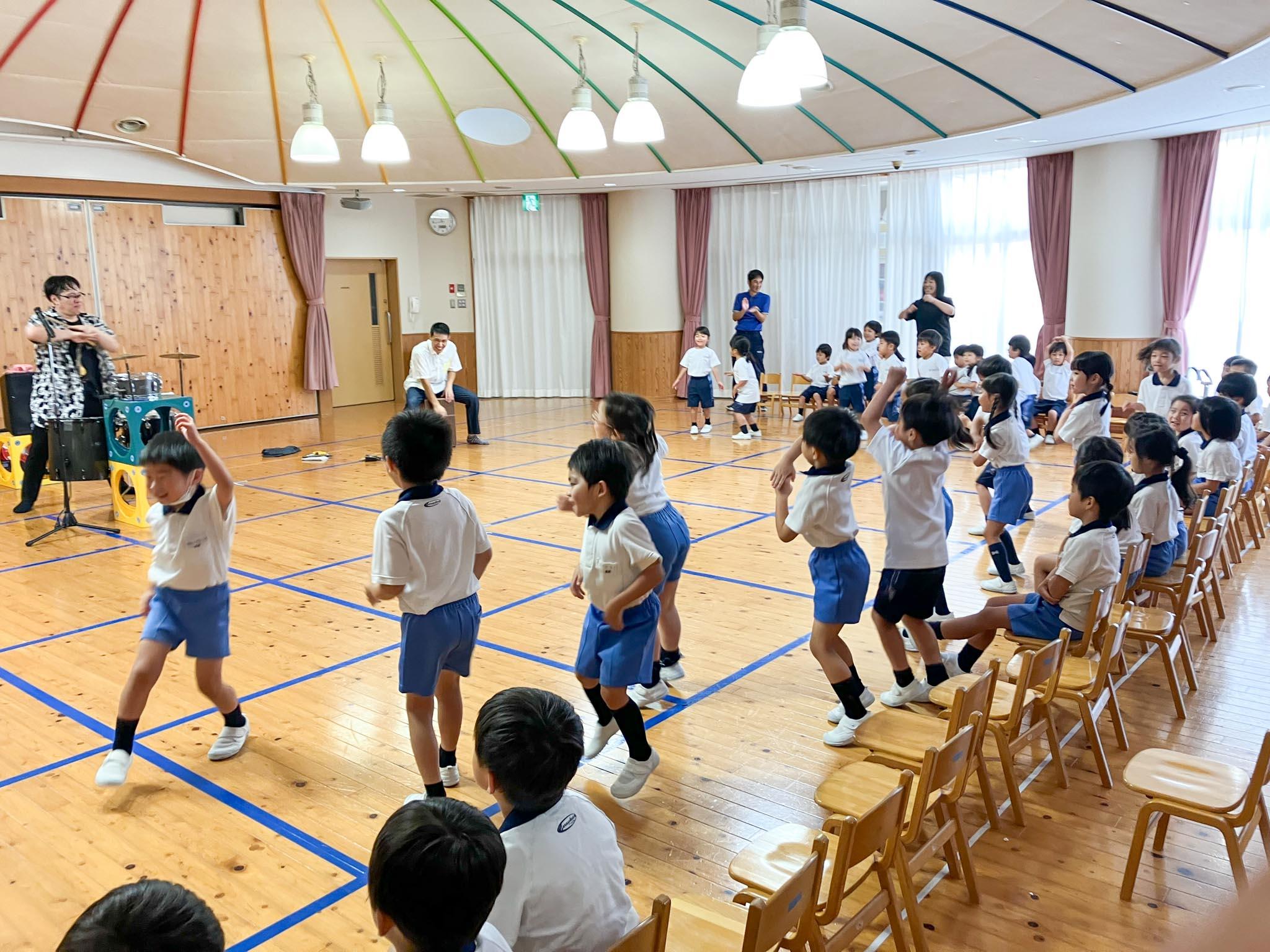 最初は椅子に座って、演奏に耳を傾けていましたが、手拍子・足拍子や、知っている曲を口ずさんだりしているうちに、席から立って踊りだす子が次々に現れました。