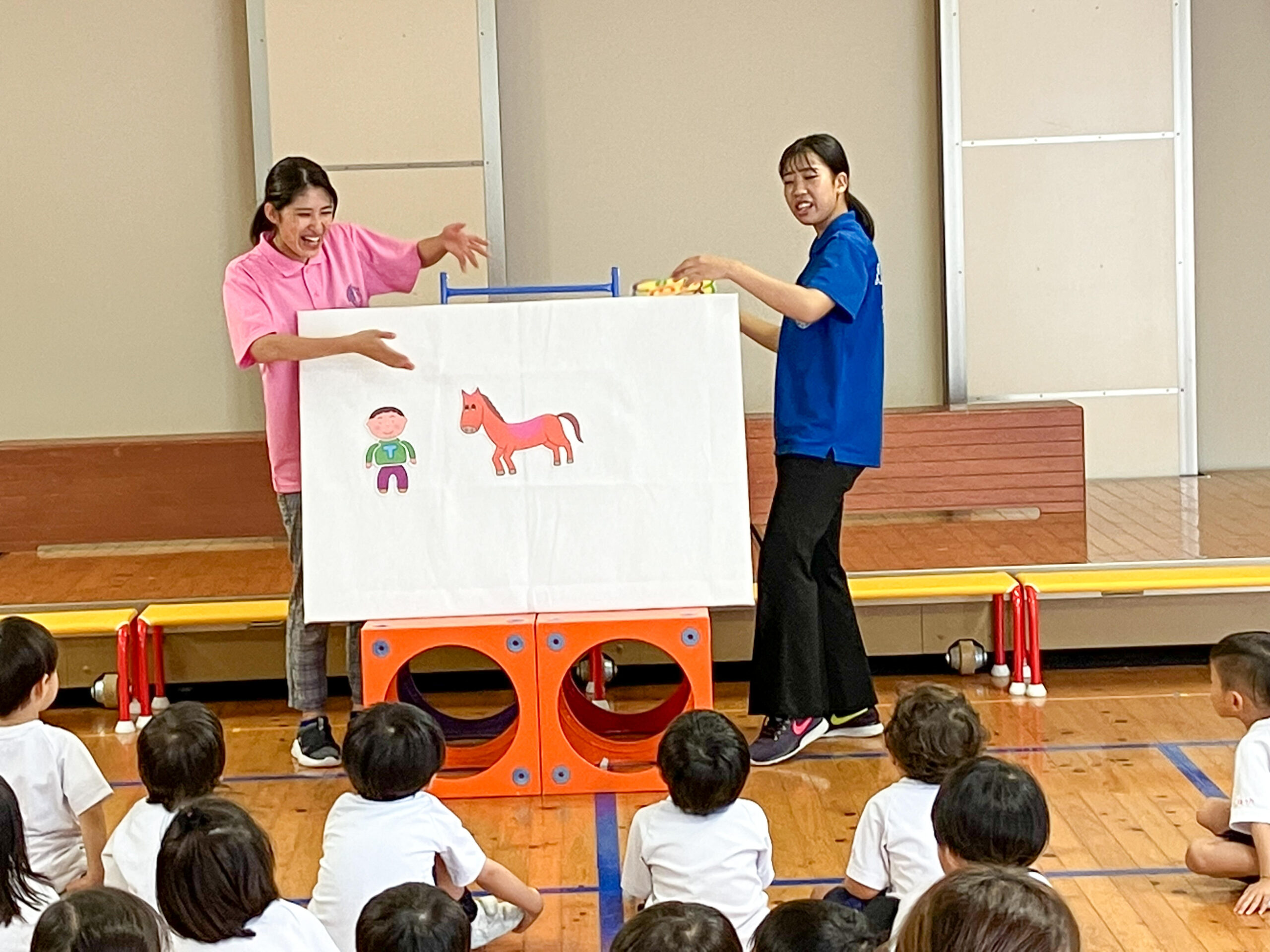 今回は、「在園児と遊ぼう」というテーマで、参加いただいた未就園児の皆さんと、年少組・年中組が交流する形で行いました。
