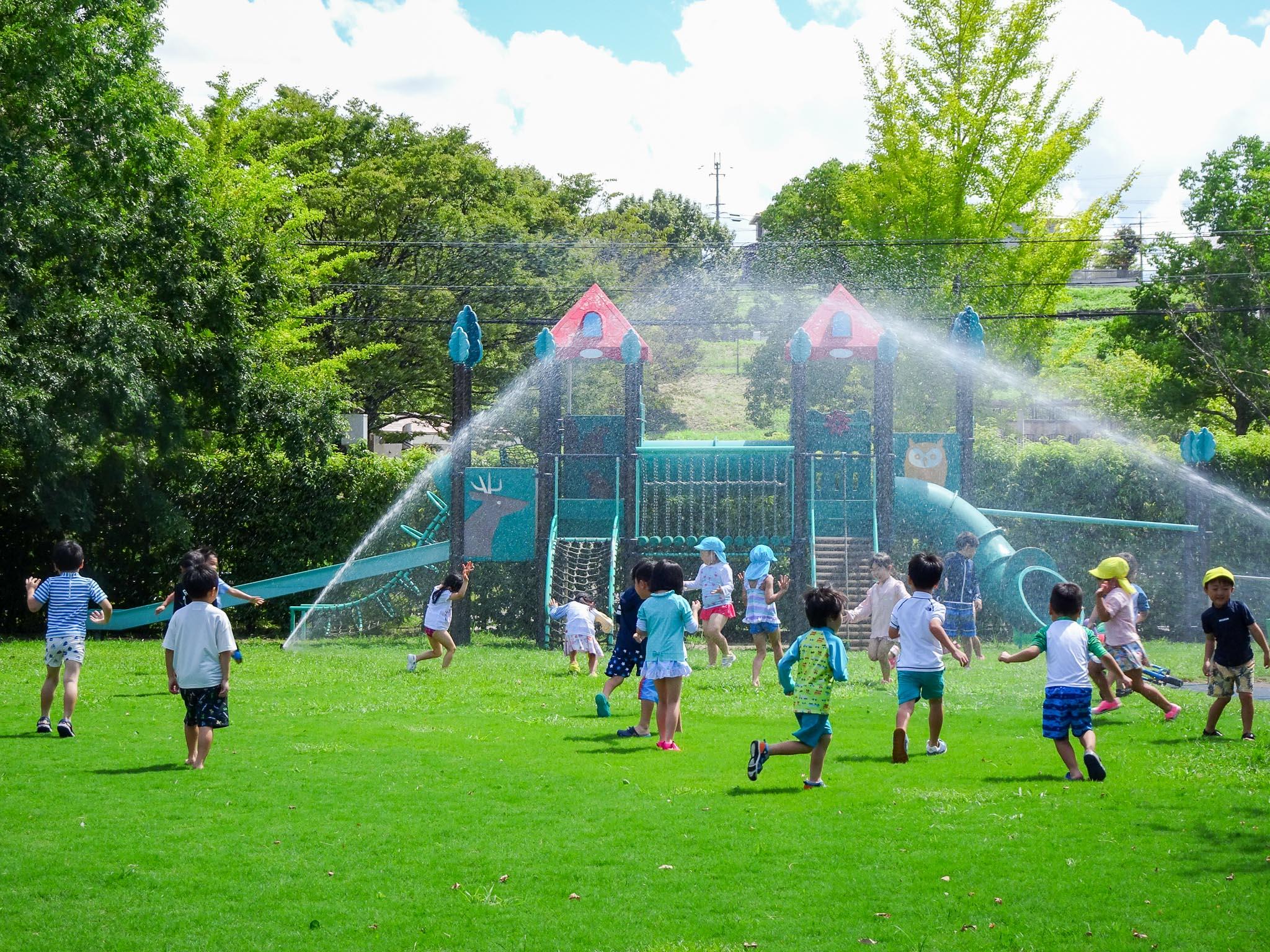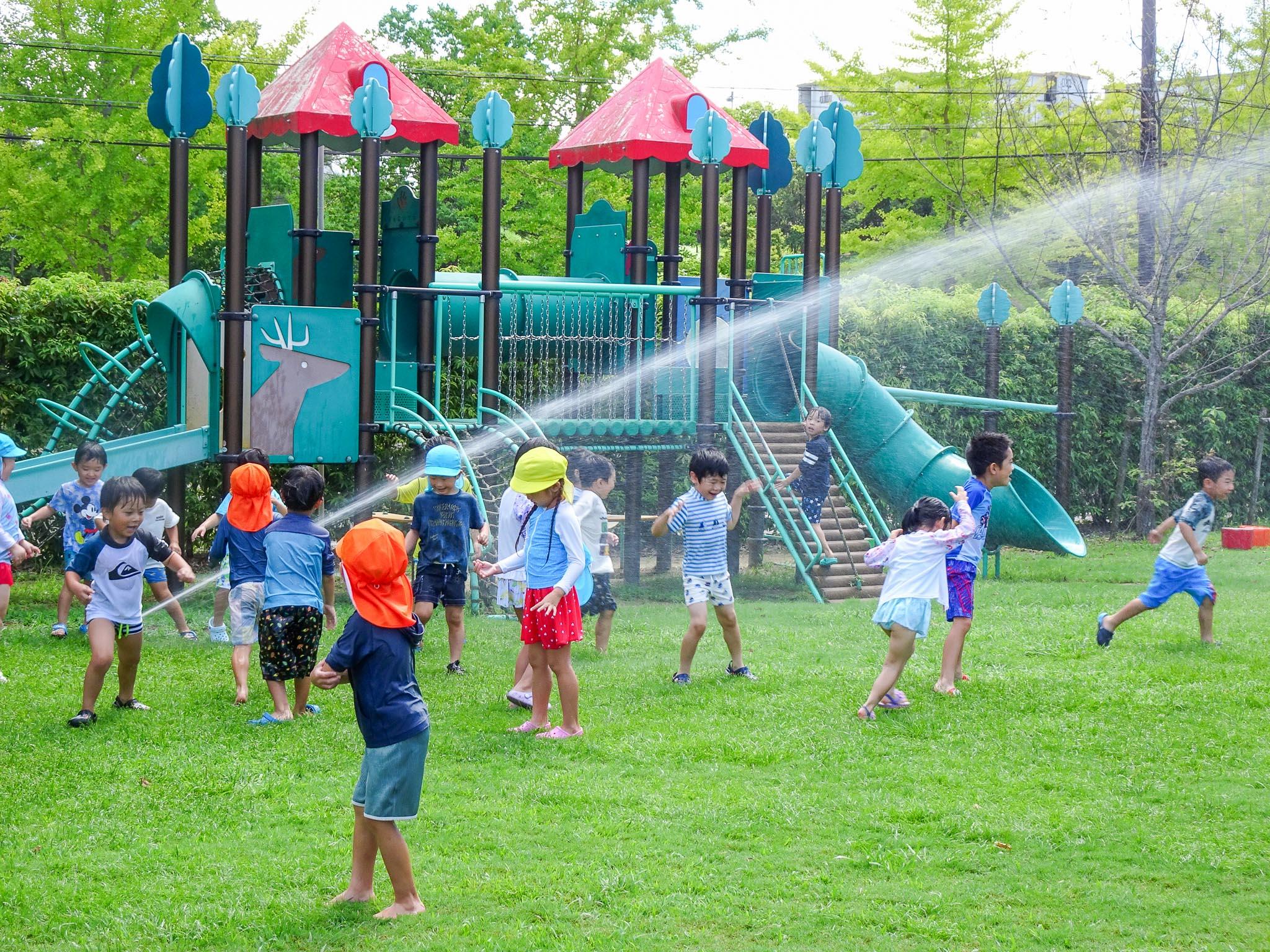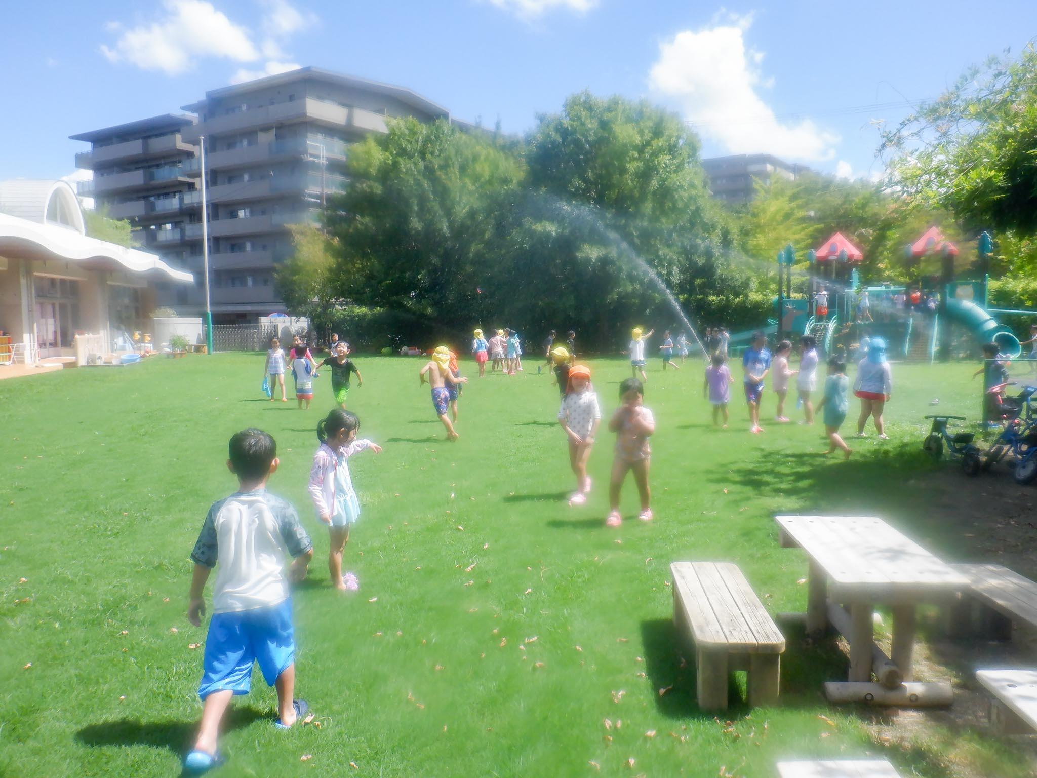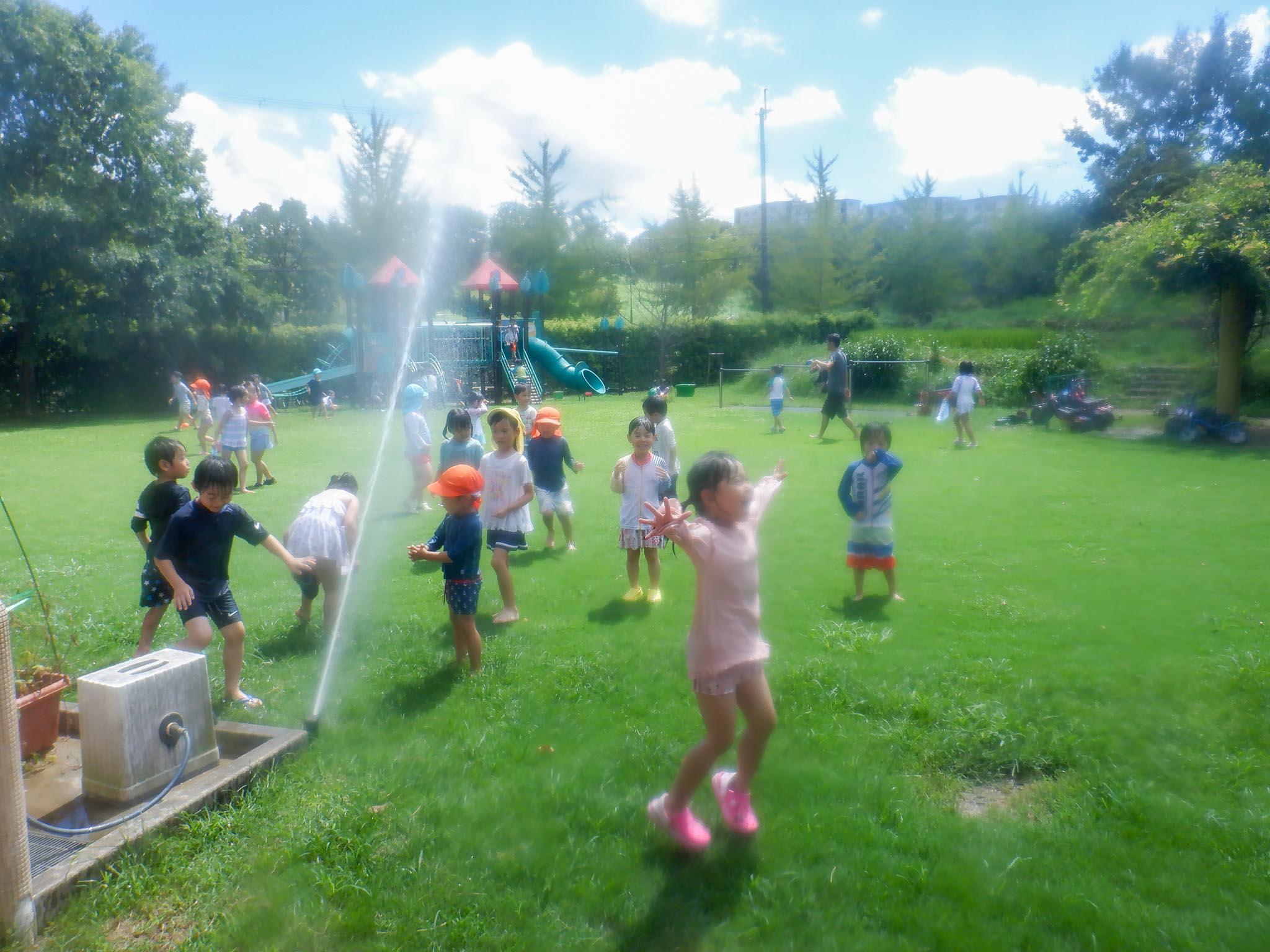 8月25日(金)は夏期保育2日目。園庭でスプリンクラー遊びをしました。水着に着替えて園庭に飛び出した子どもたち。短い時間でしたが、スプリンクラーの水を浴びて、「涼」を楽しみました。