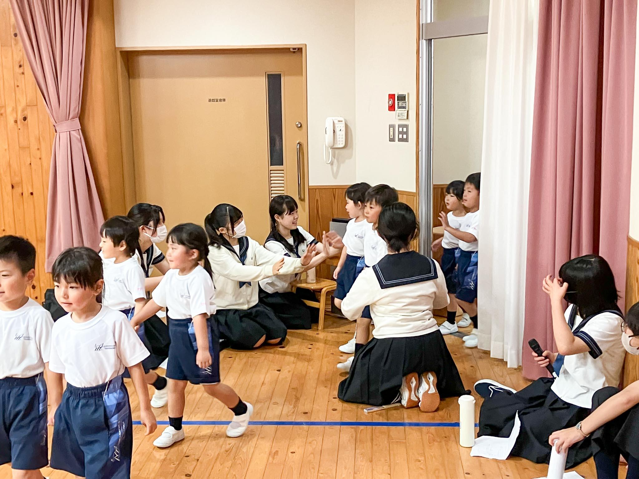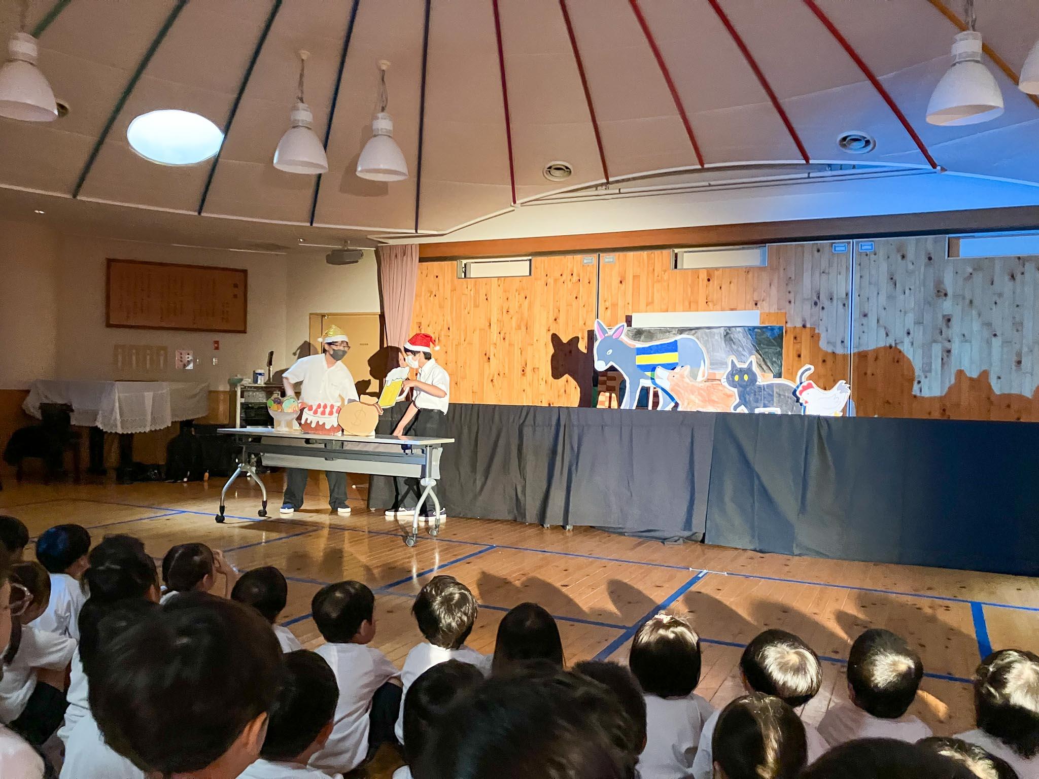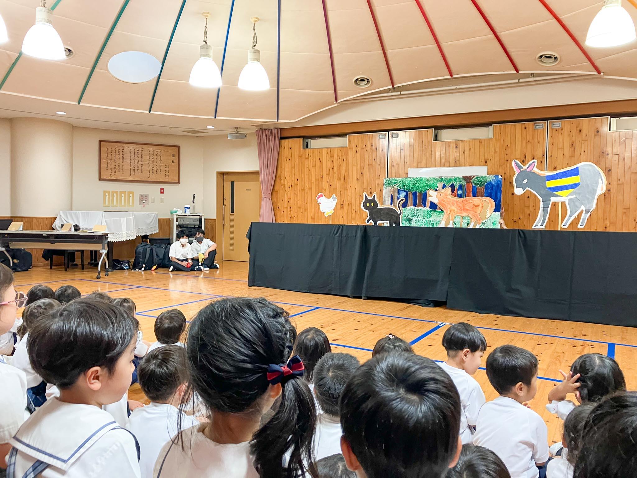 演目は「ブレーメンの音楽隊」。動物のペープサートを操作する人と声を担当する人、前で泥棒の役を演じてくれる人、照明や舞台転換などの裏方を担当している人。総勢19名の生徒さんが、園児たちのためにチームワーク良く熱演してくれました。