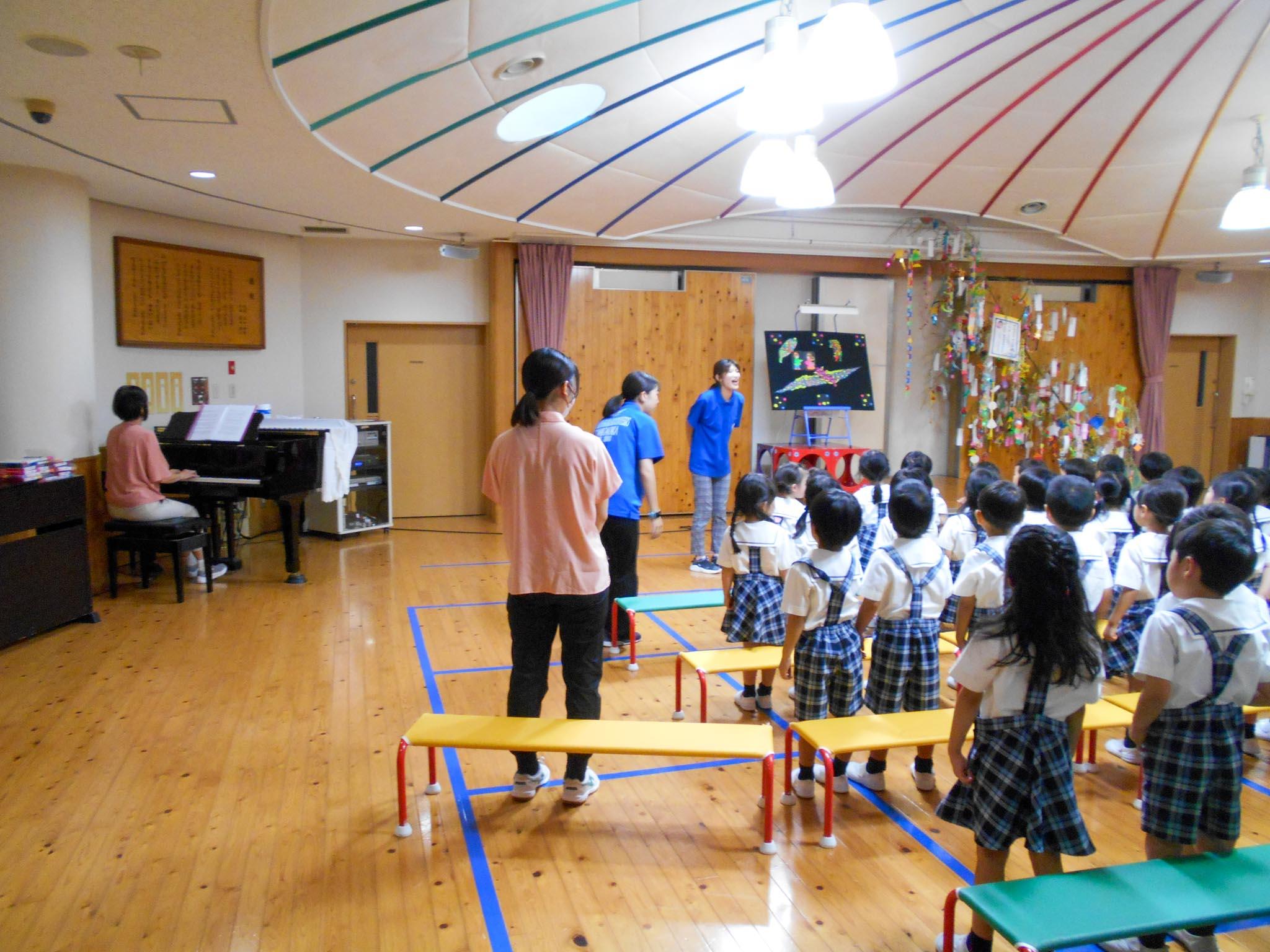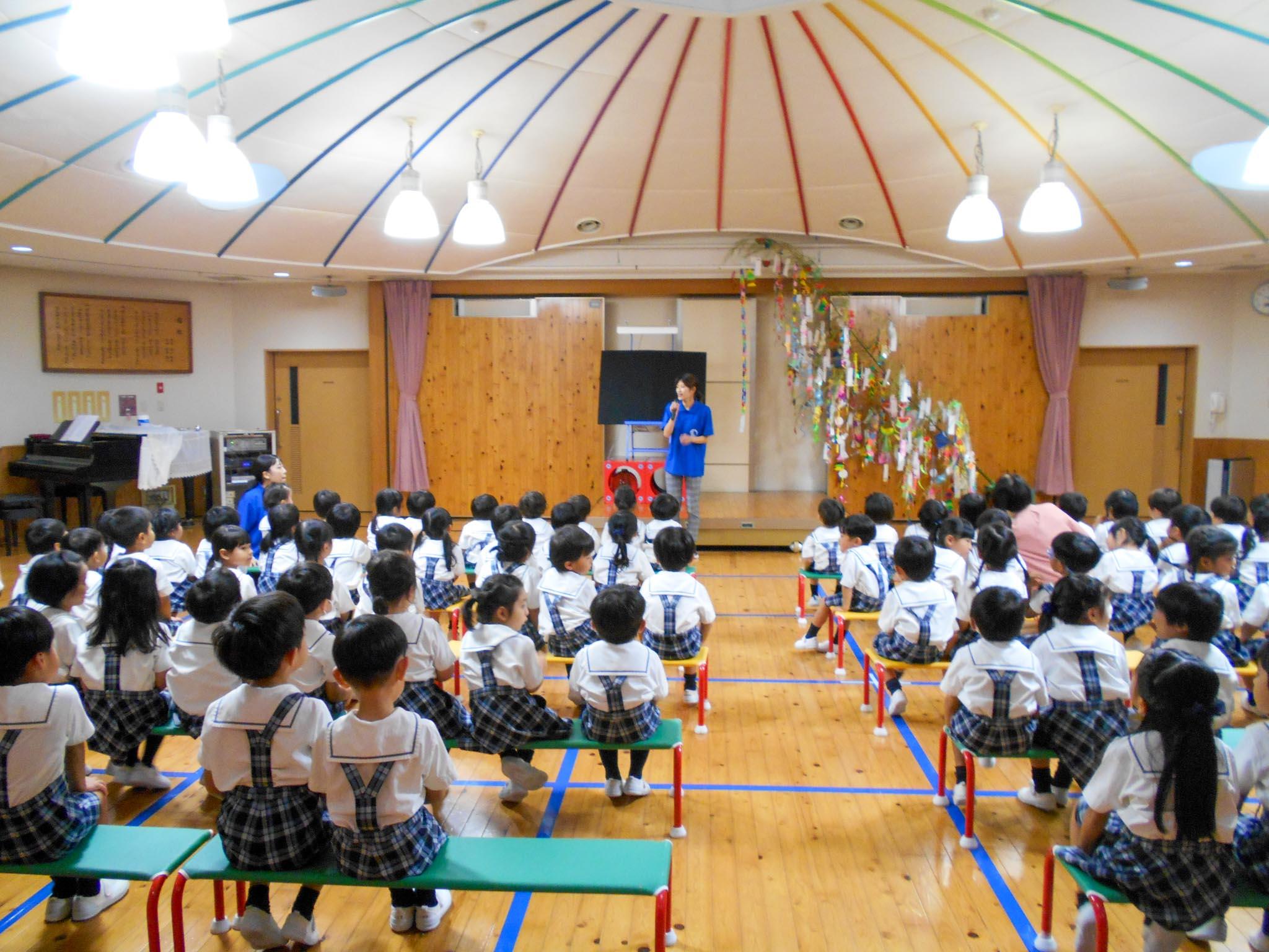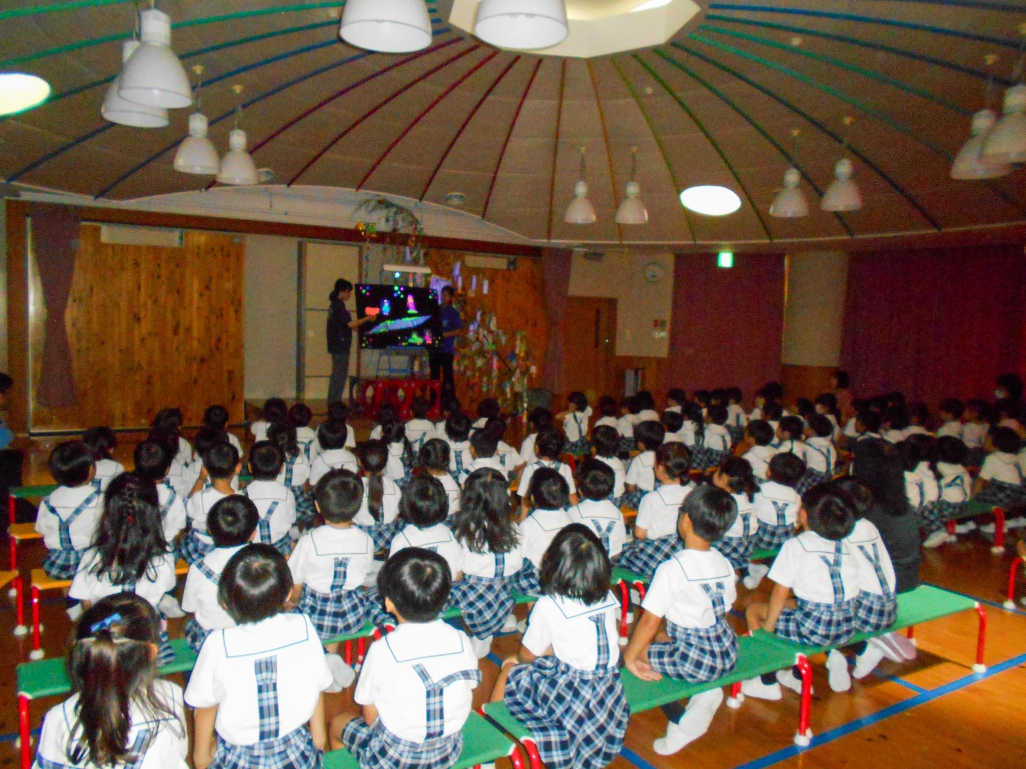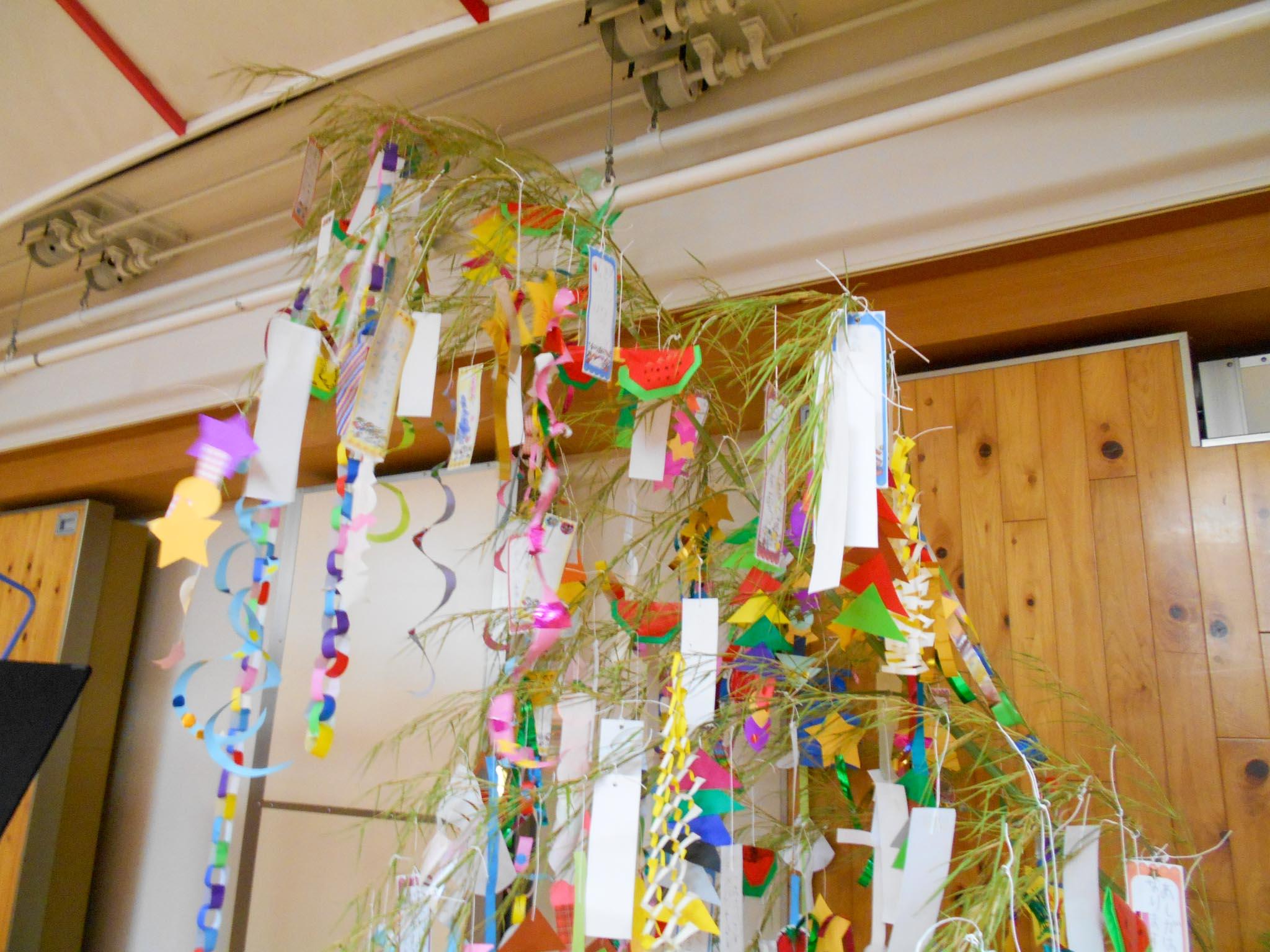七夕の会 2023.07.07(金) Post 7月7日は七夕の日。幼稚園では1日早く、「七夕の会」を行いました。 昨日までに子どもたちは、それぞれの願いを書いた短冊や七夕飾りを、用意された大きな笹につけました。 「園長先生も短冊を用意しました。」とみんなに紹介して、その短冊も一緒に飾ってもらいました。 ブラックライトシアター「七夕さまのおはなし」を静かに鑑賞したあと、みんなで願いを込めて「たなばたさま」の歌を歌いました。 明日の夜は好天に恵まれて、ひこぼしさまとおりひめさまが無事に逢えると良いですね。 « 年中組 コスモスの種まき 年長組お泊り保育 1日目 »