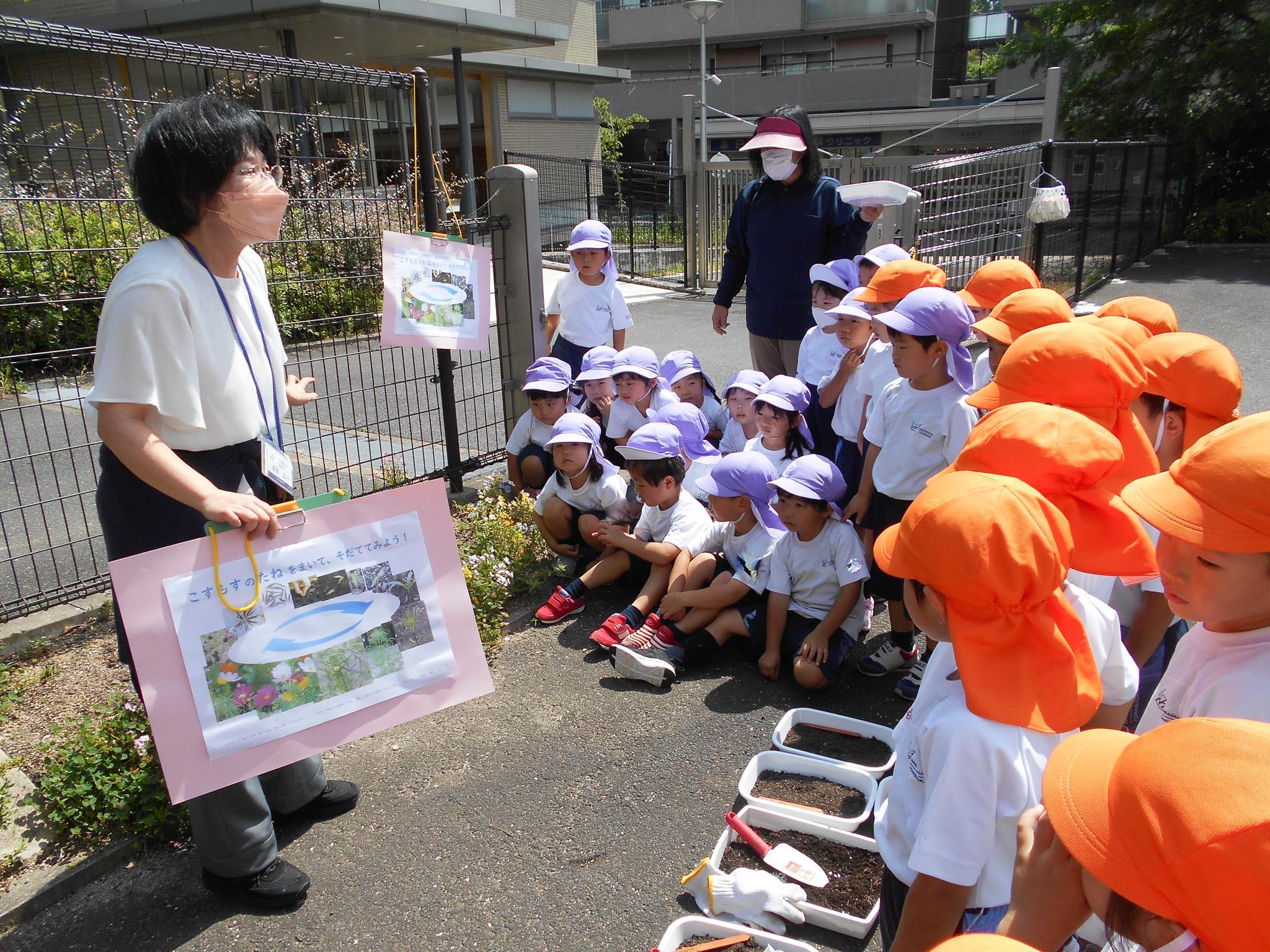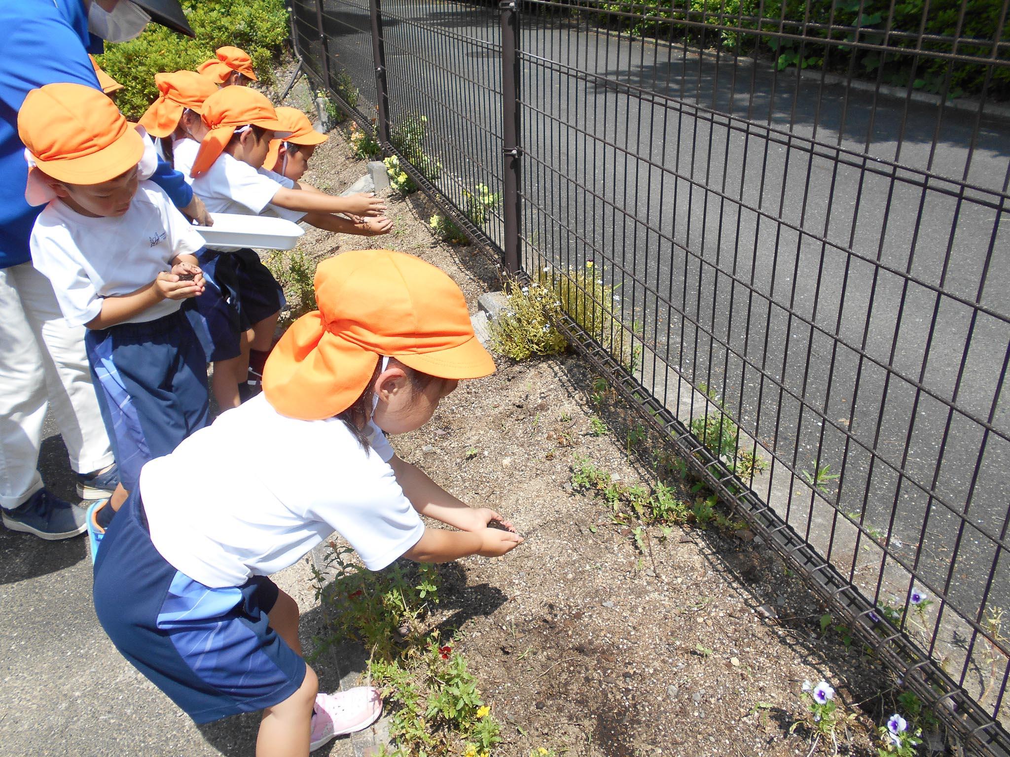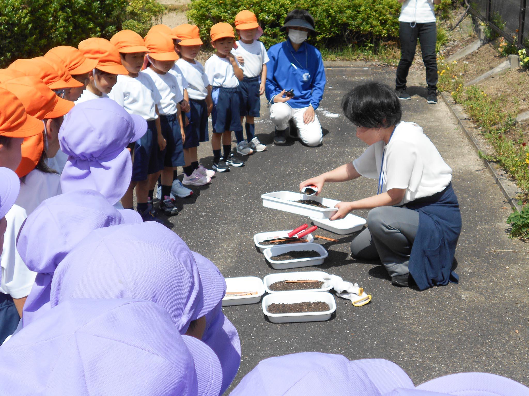 今日は、年中組の子どもたちのために、コスモスの種まきを計画してくださいました。