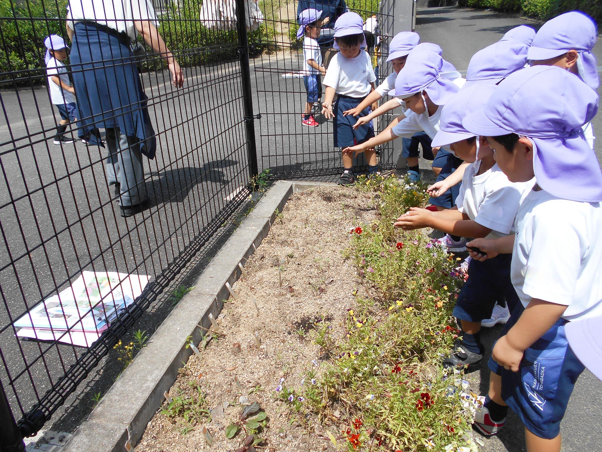 奈良学園大学 人間教育学部の高岡昌子先生が、共同研究の一環として、昨年度から幼稚園玄関前のフェンスそばの一角にお花などを育ててくださっています。