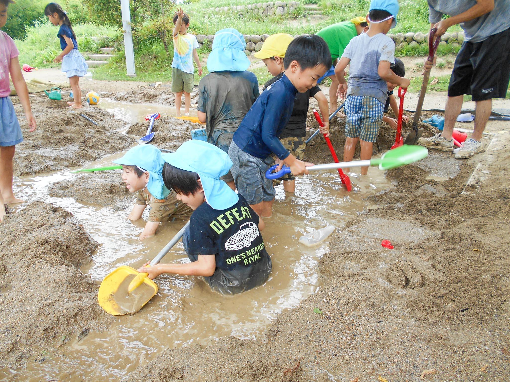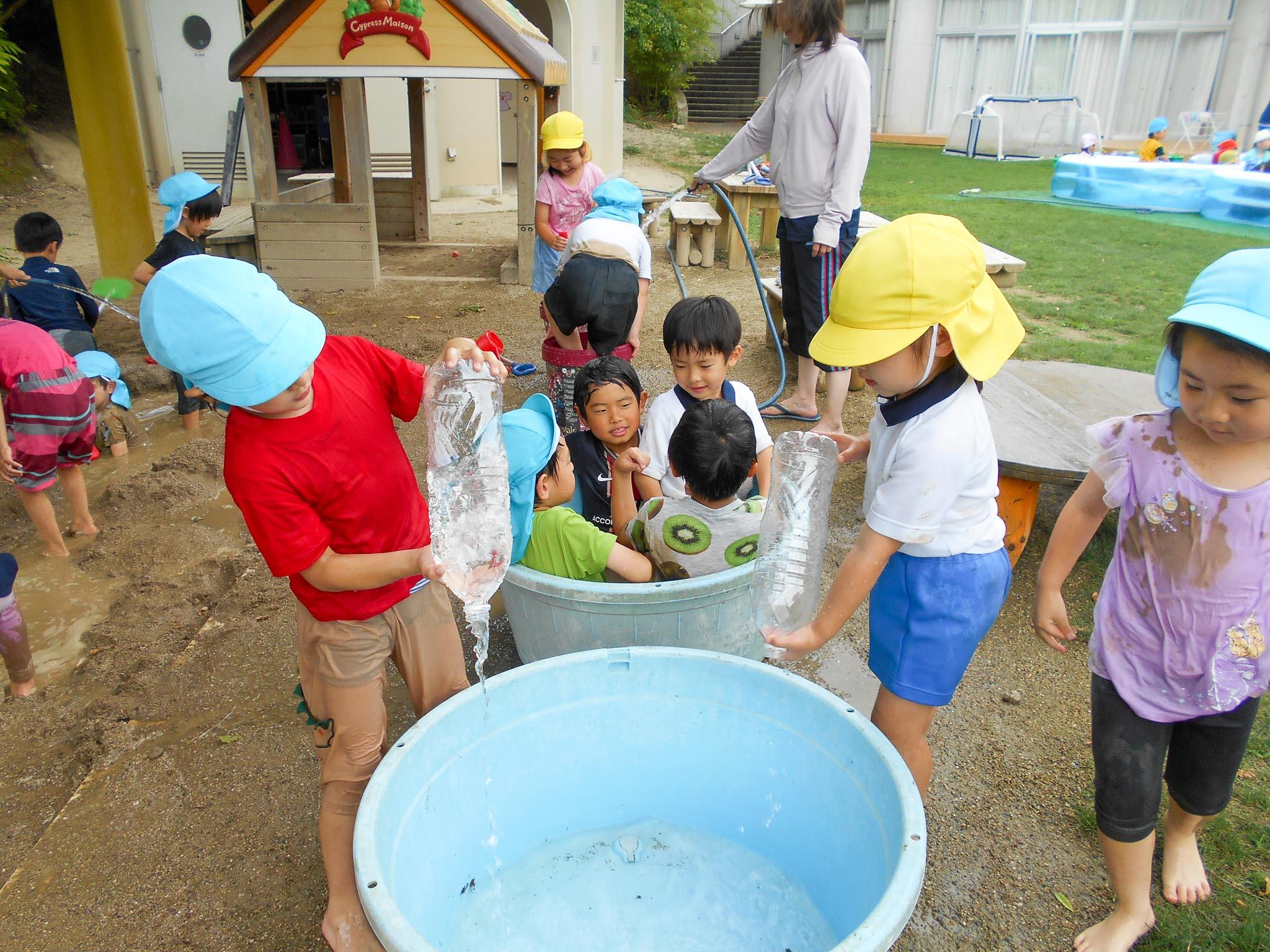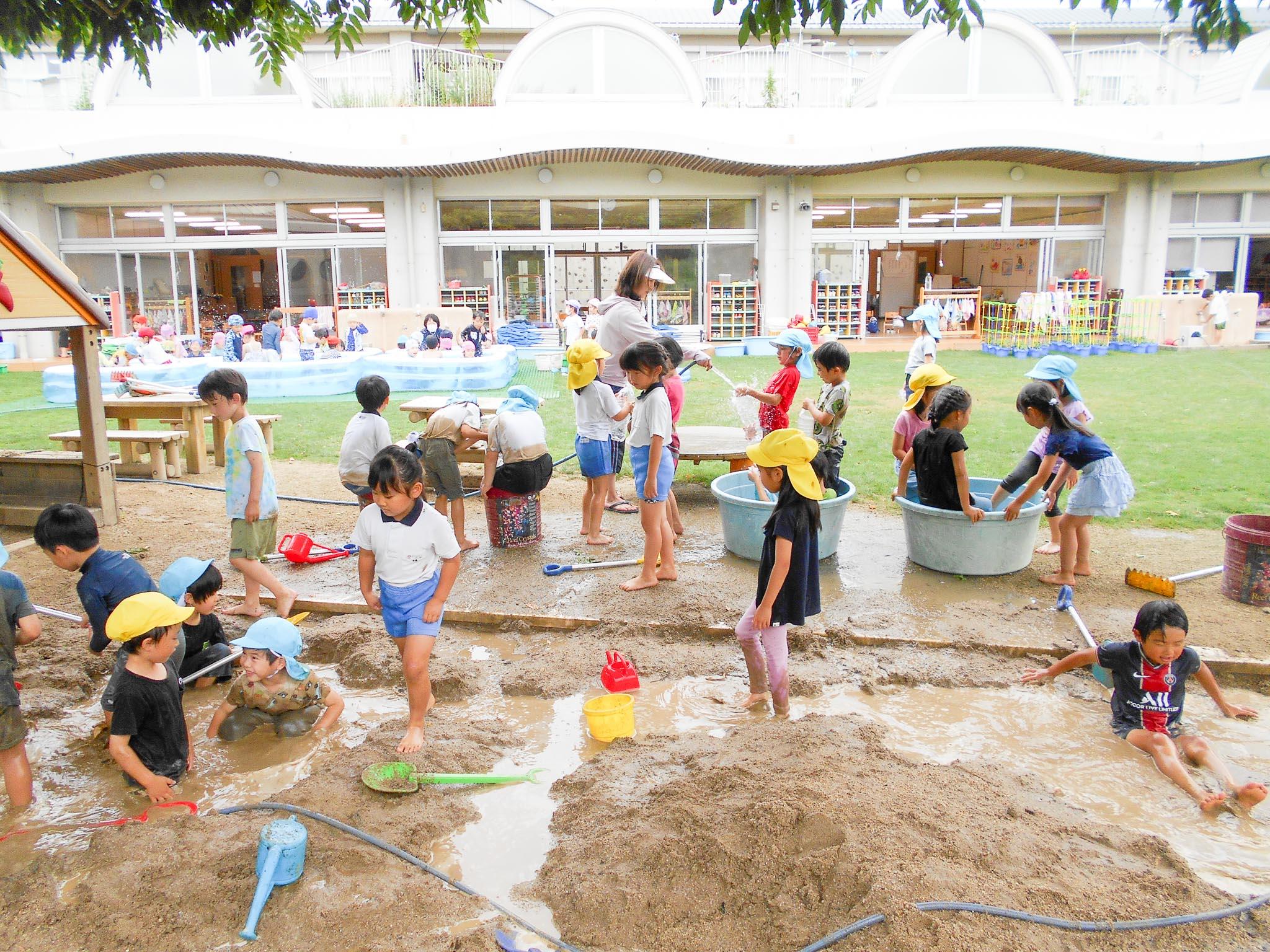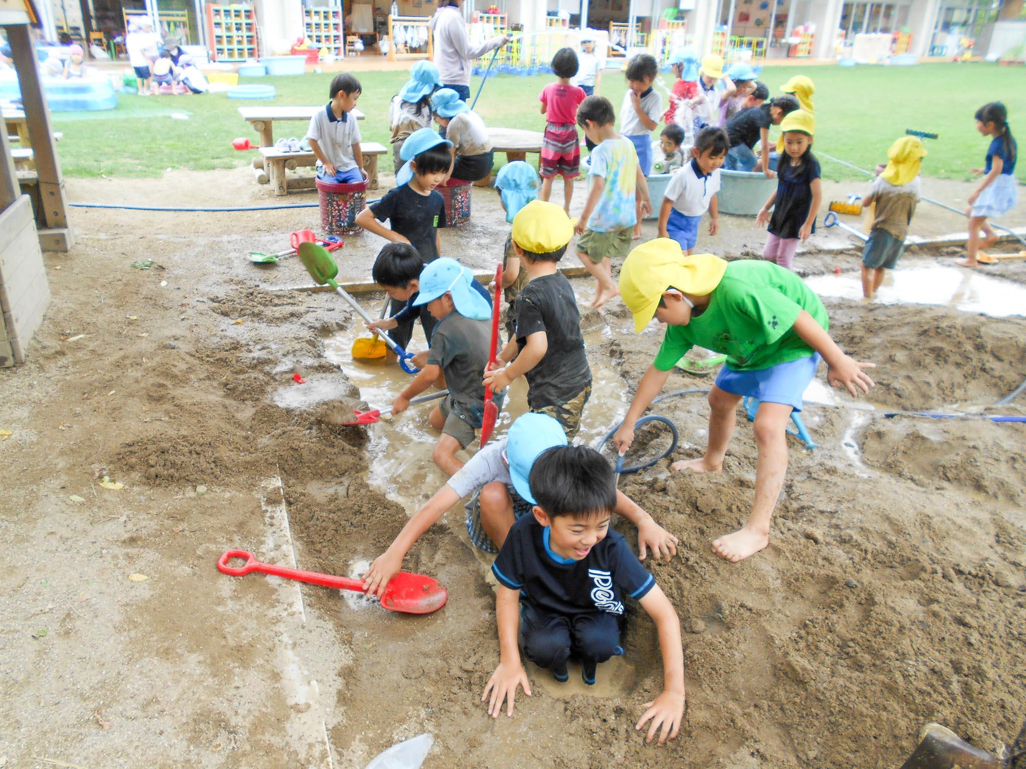 スコップで大きな穴を掘り、山を作って水をそそいだり、露天風呂のように水の中につかって楽しんだり。ペットボトルなどを使って水をため、大きな桶の中に入って楽しんでいる子もいました。土の感触や水の感触など、体全体で思う存分味わうことができたと思います。