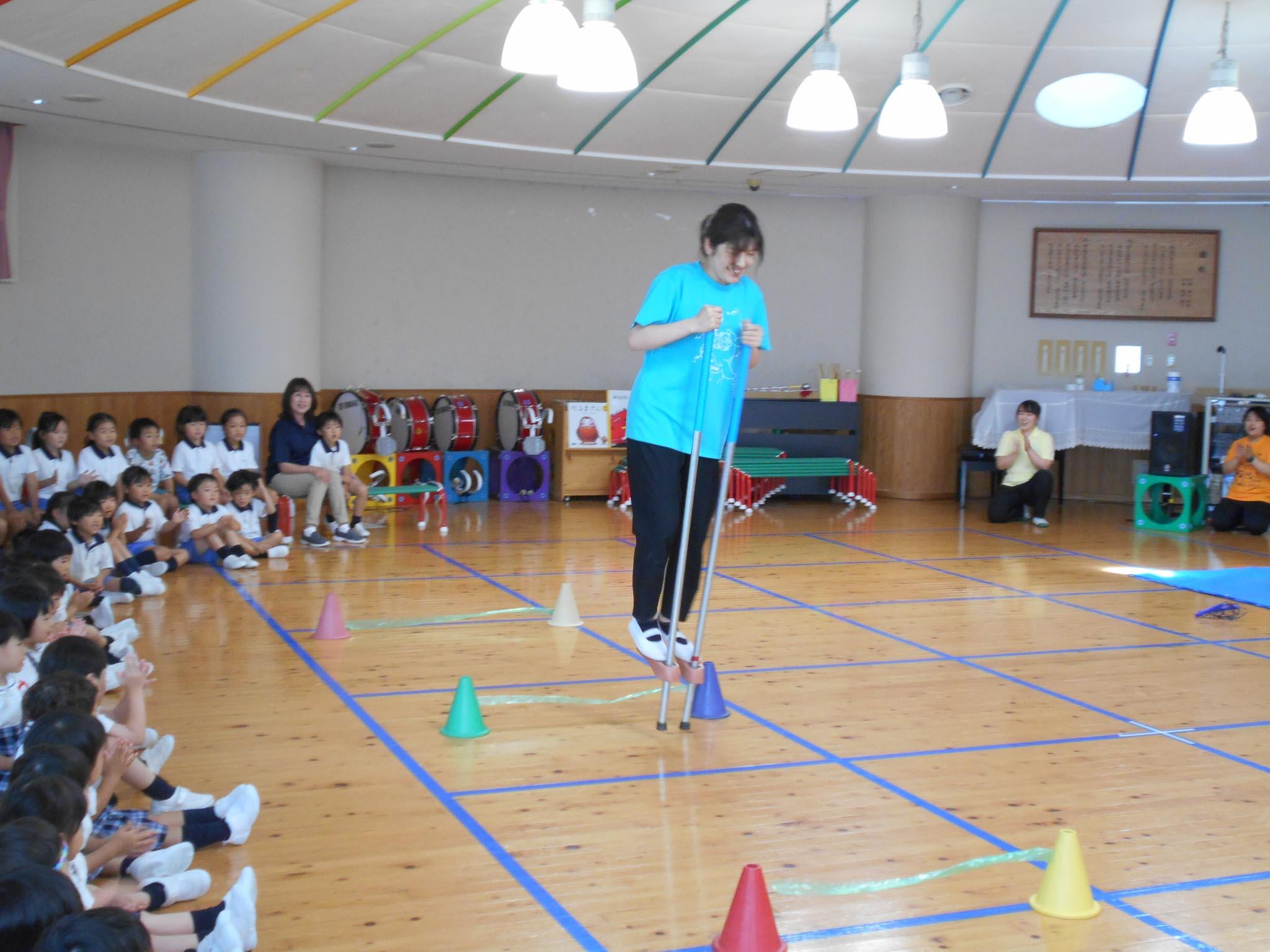 竹馬に縄跳び、折り紙、書道。3人の個性あふれる発表に、子どもたちはくぎ付けです。