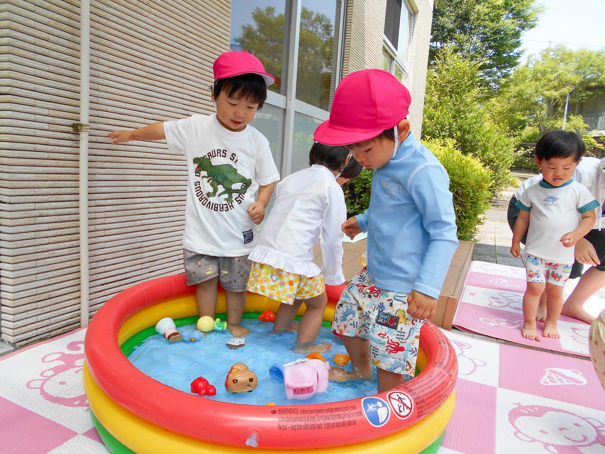 今週の2歳児保育「いちご組」では、玄関前のひさしがある場所に遊具などを用意して、プールで水遊びをすることになっています。