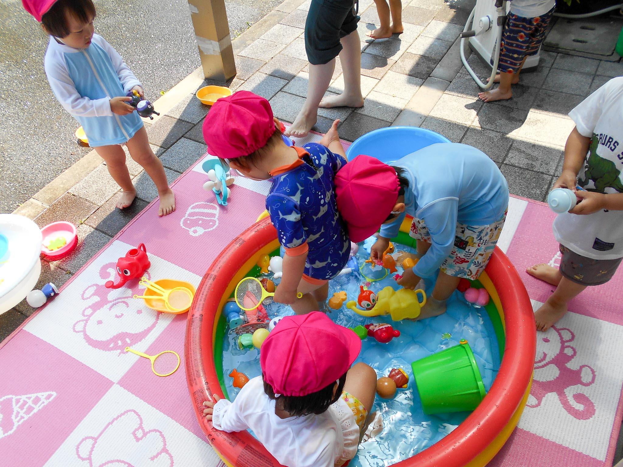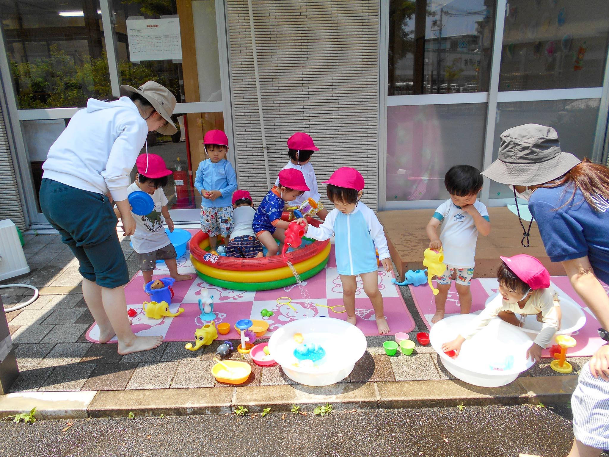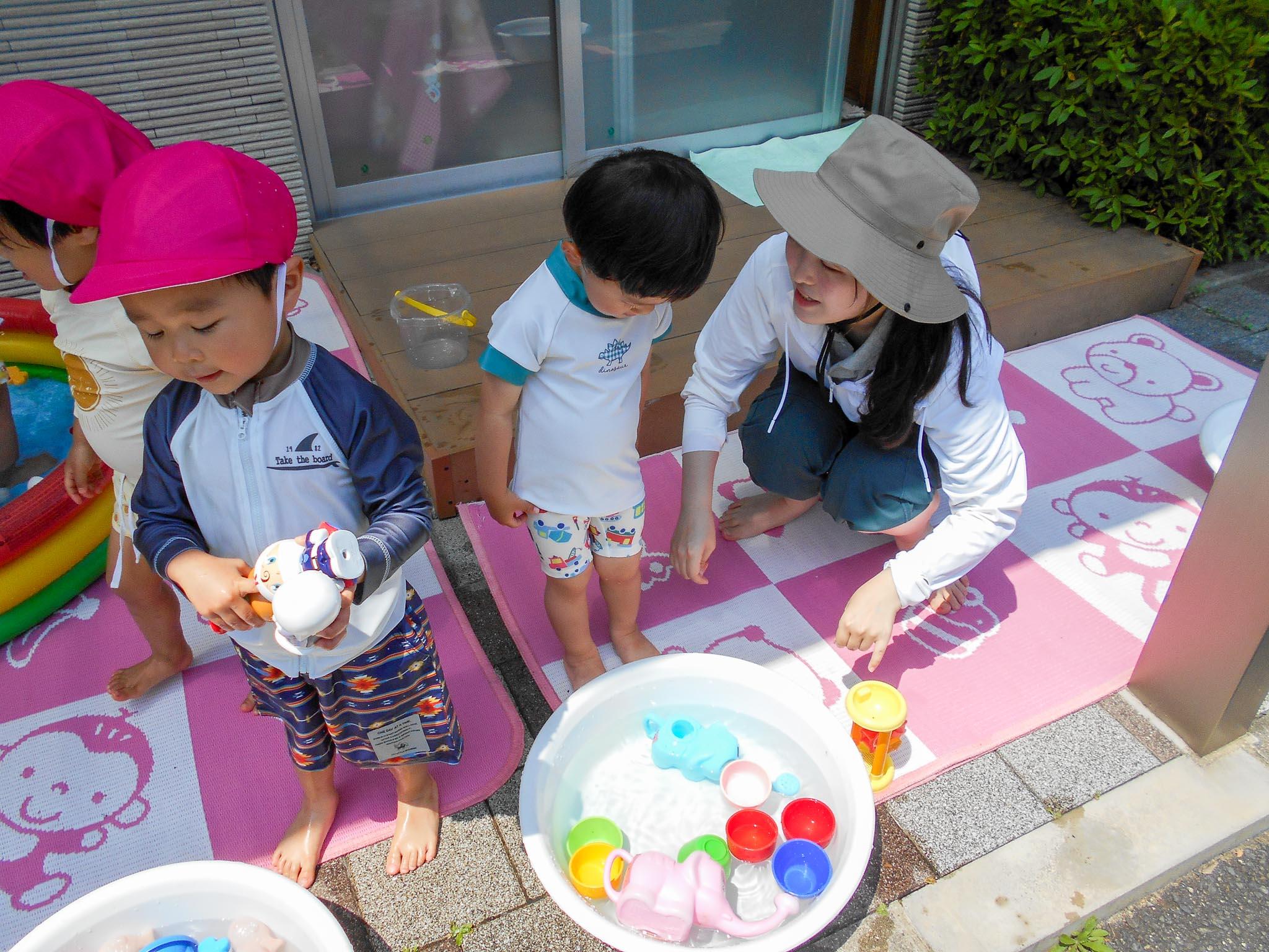 お家で用意いただいた水着に着替え、最初は慣れないことに少しおっかなびっくりの様子だった子どもたちですが、一緒にプールに入って遊びを楽しんだり、じょうろやホースで水まきを楽しんだりしているうちに、どんどん自分のしたい遊びに夢中になっていく様子が見られました。