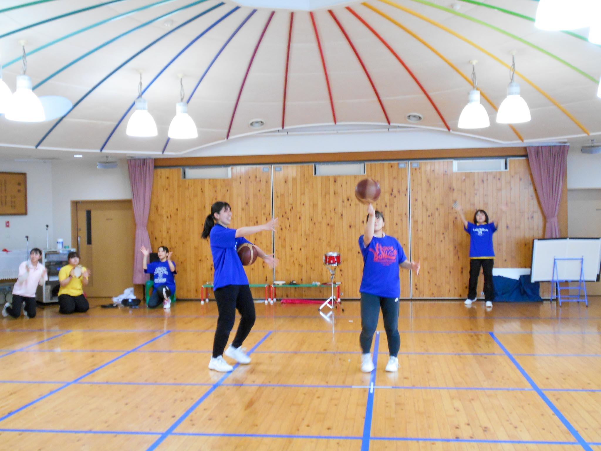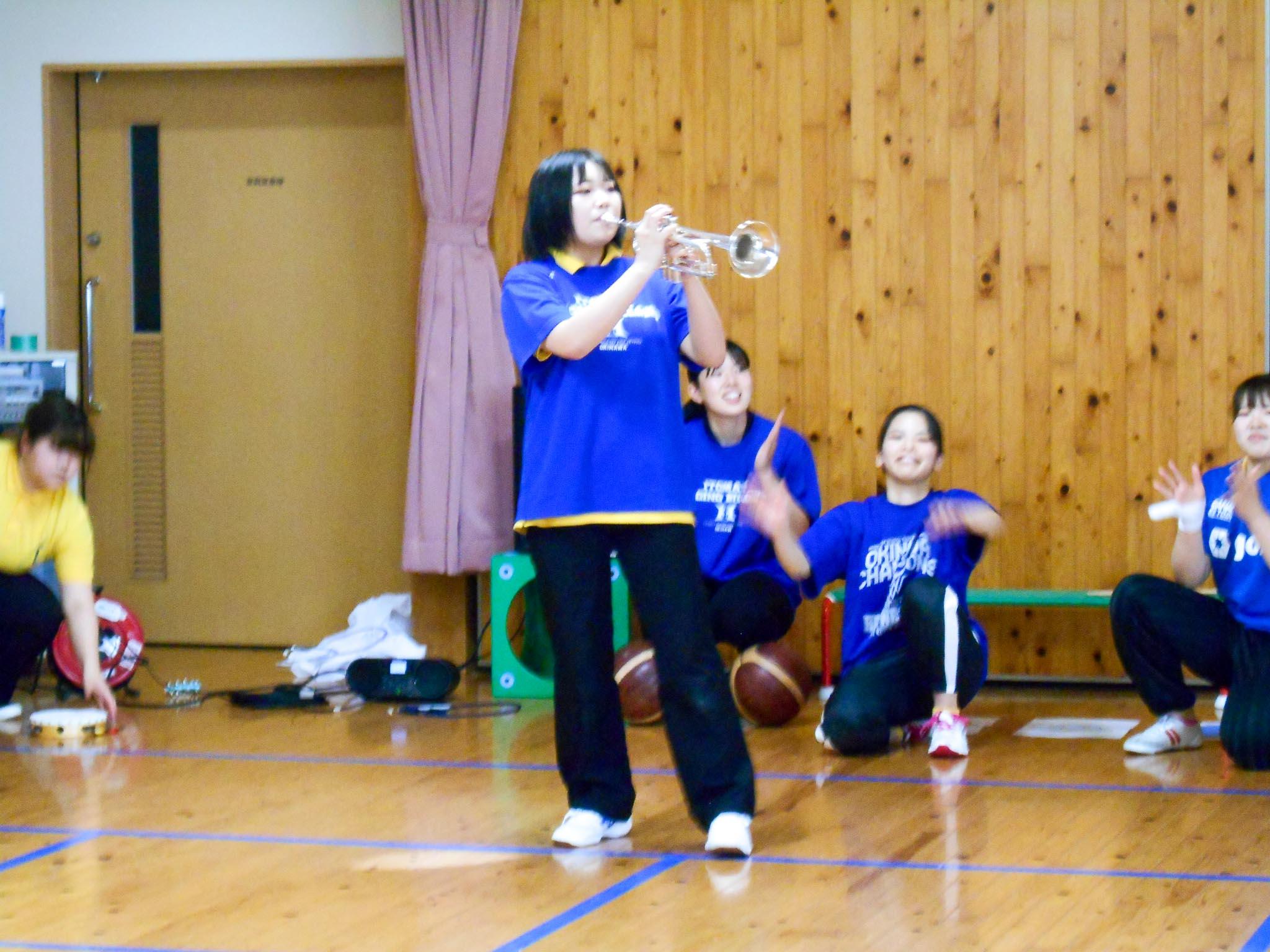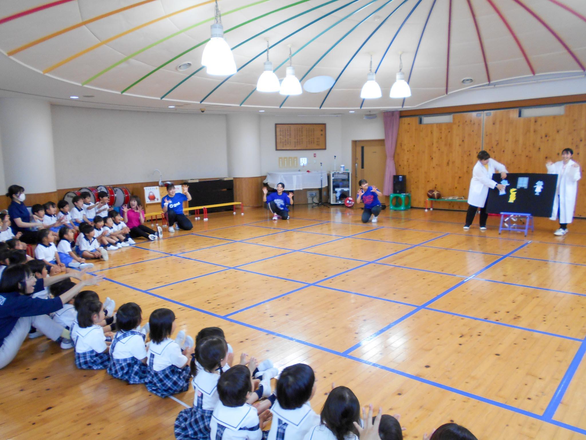 「ねこのおいしゃさん」のパネルシアターで子どもたちは大喜び。続いてトランペットやスネアドラムの演奏、バスケットボールやフラッグの実演など、それぞれの特技が次々飛び出し、みんな目を丸くしていました。締めくくりは息の合ったダンス。大きな喝さいを浴びていました。