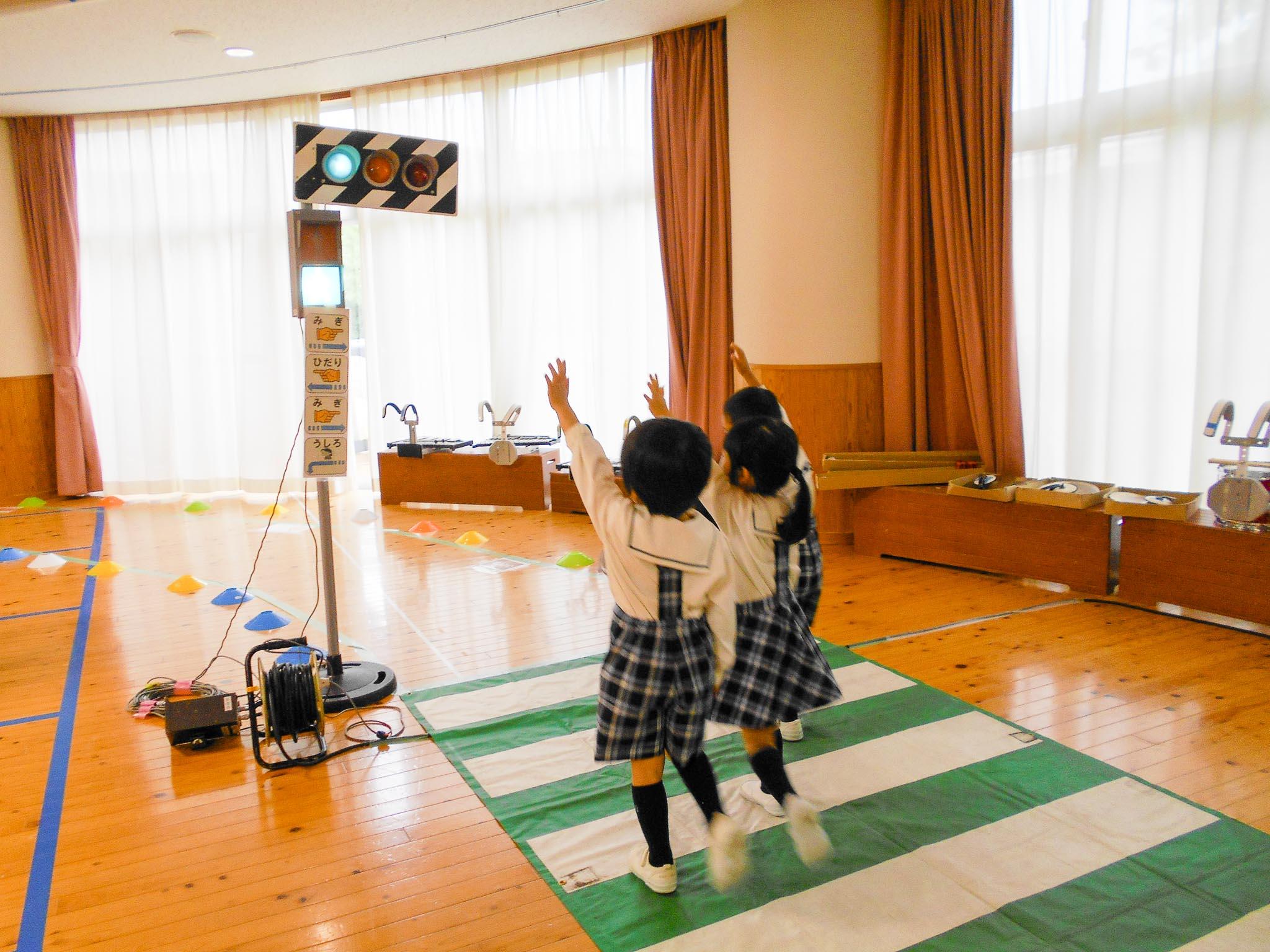 次は歩行時の交通ルールについてです。信号や標識の意味を知り、横断歩道などを渡るときの注意点「右見て・左見て・右見て・後ろ見て・手をあげる」をみんなでやってみました。そのあと、用意していただいた信号機や踏切のあるルートを、少人数で順番に歩行する体験をしました。