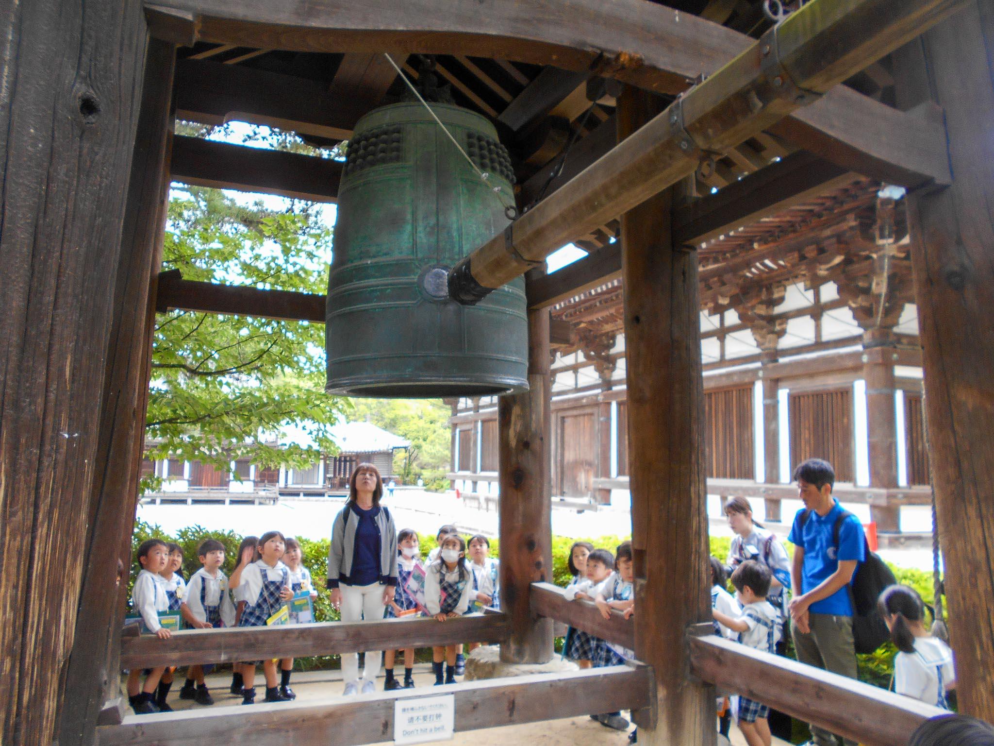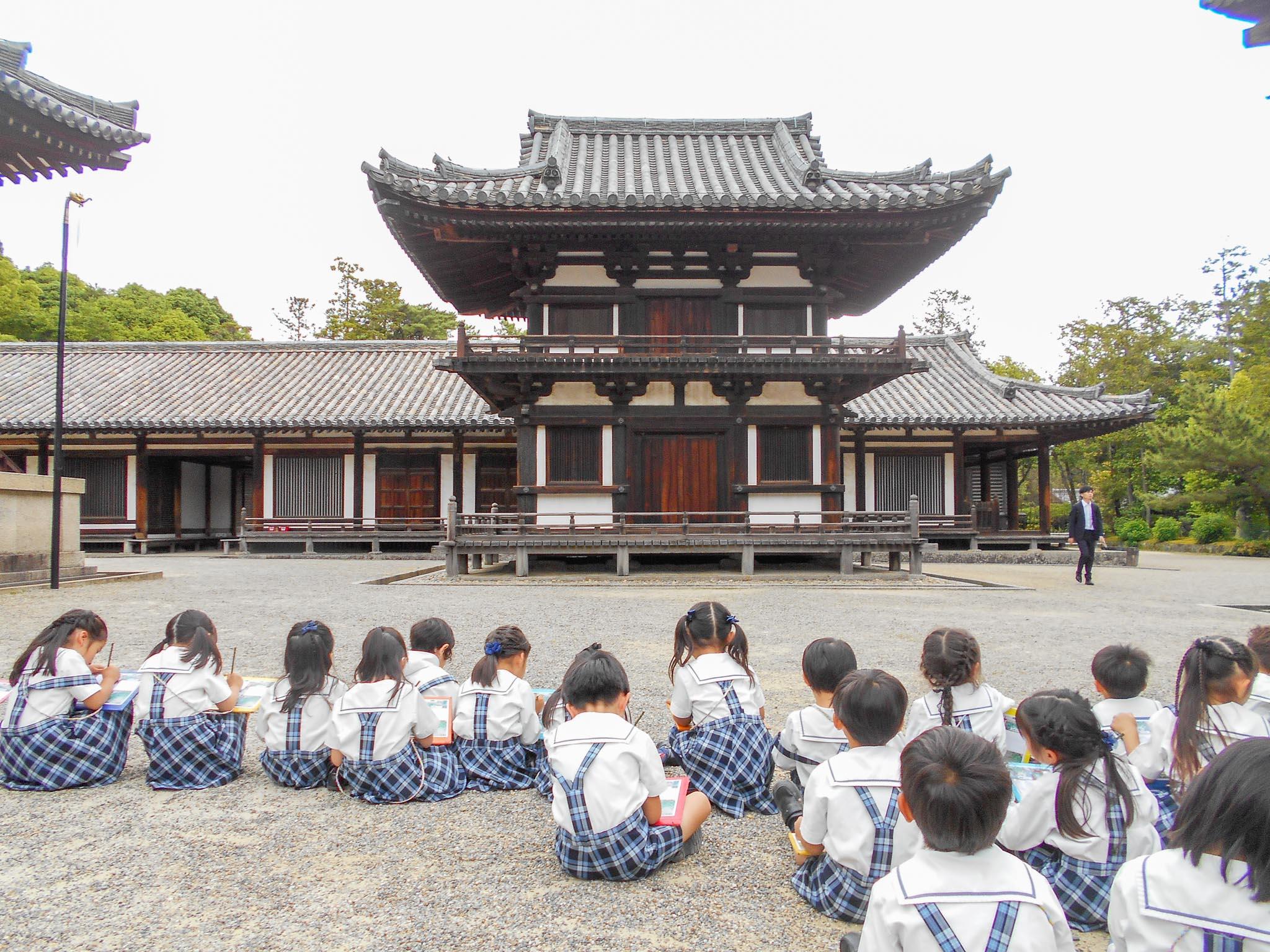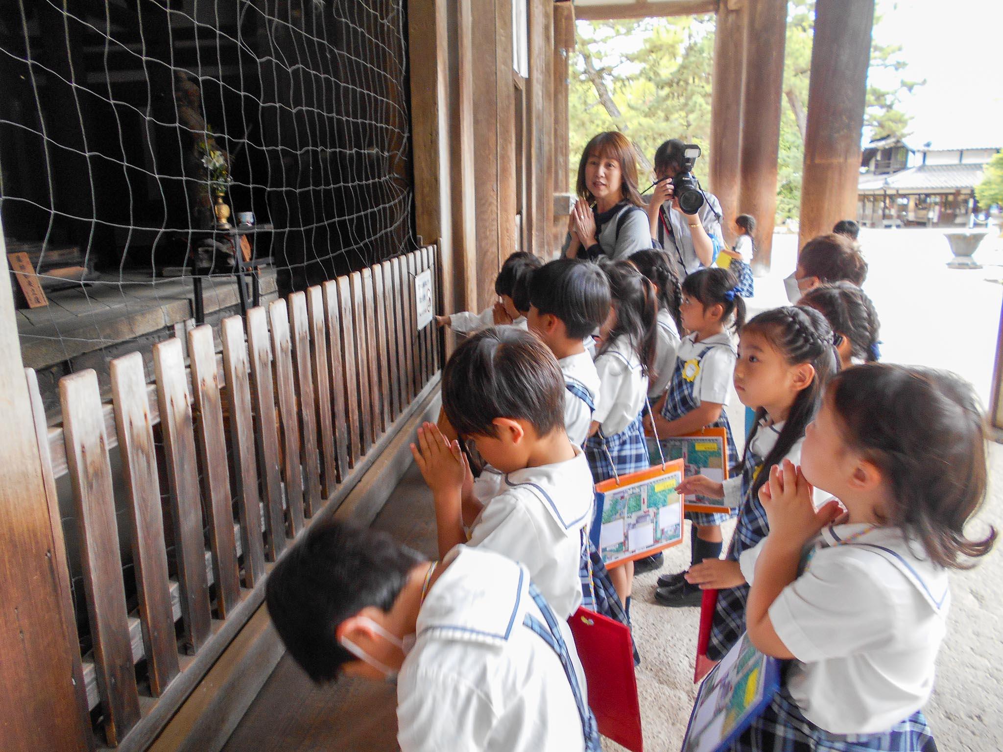 クラスごとに記念撮影をしたあと、最初に金堂へお参りしました。廬舎那仏さま・薬師如来さま・千手観音菩薩さまの像をまじまじと見つめ、多くの発見があった子どもたち。手を合わせ祈る姿がとてもかわいかったです。
