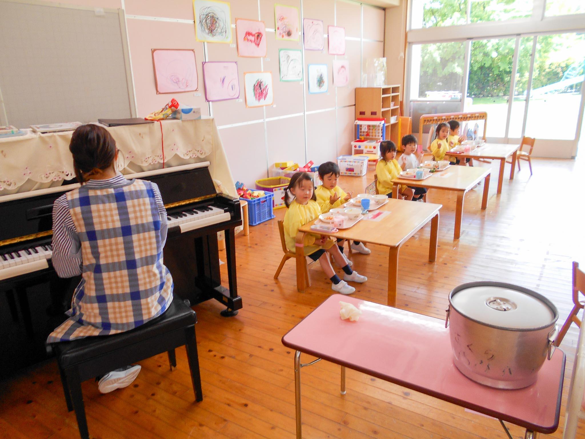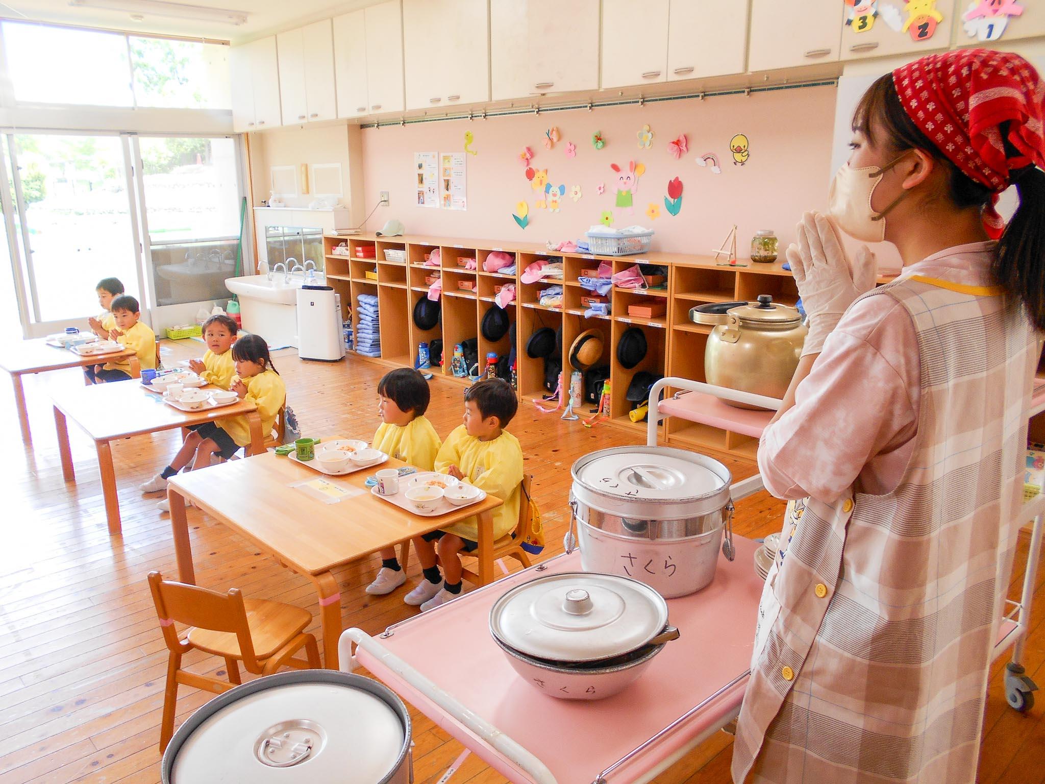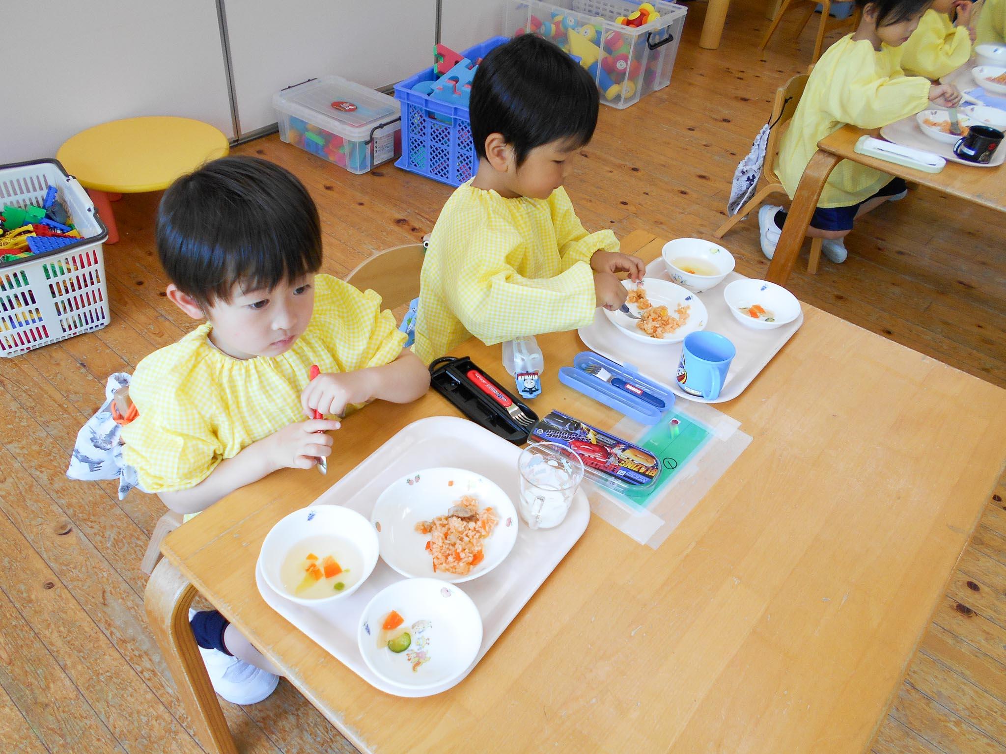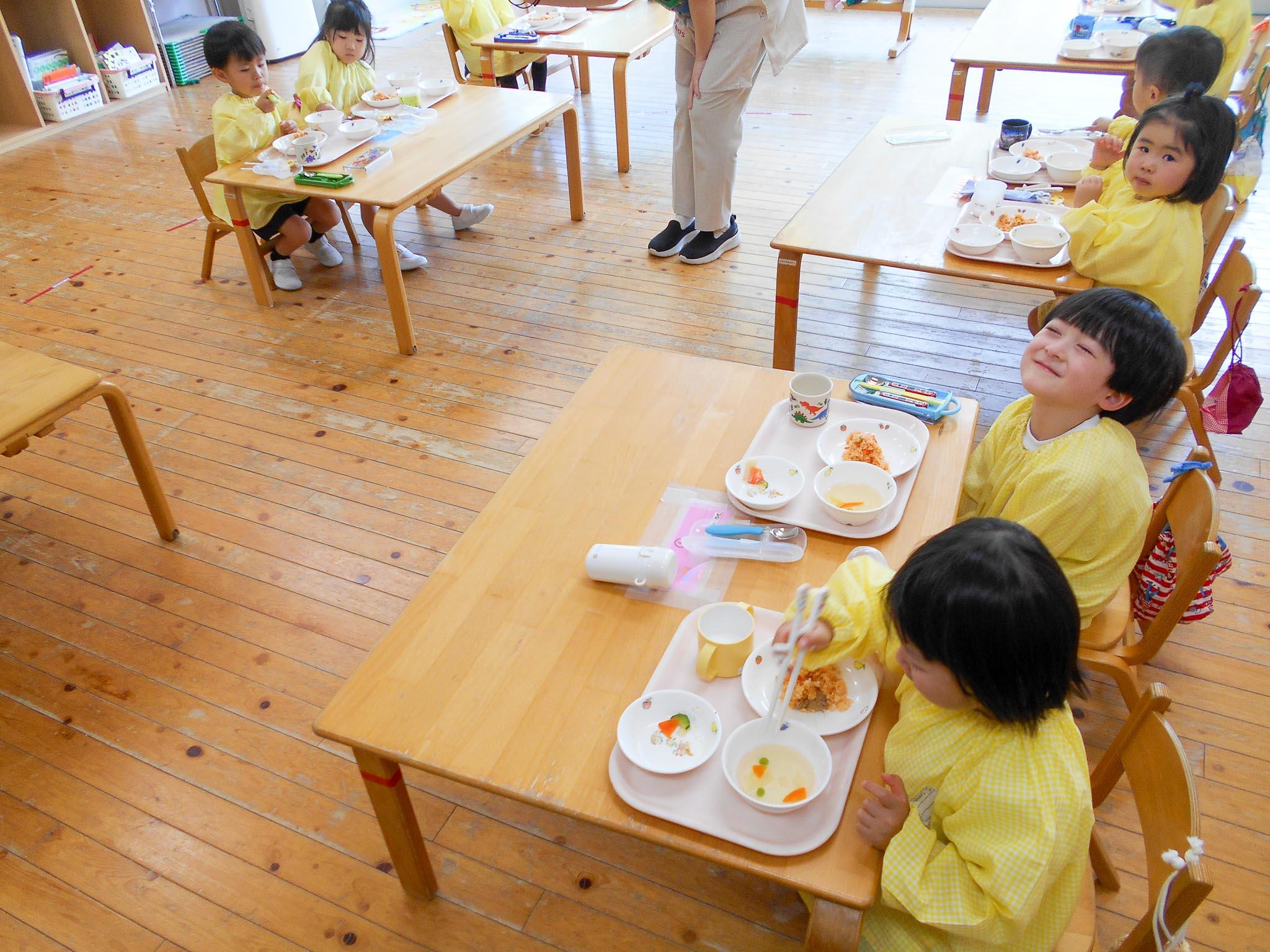 先週から1日保育が始まった、年少組の子どもたち。これまではお家の方にお弁当を用意していただいていましたが、5月15日(月)から、いよいよ給食が始まりました。