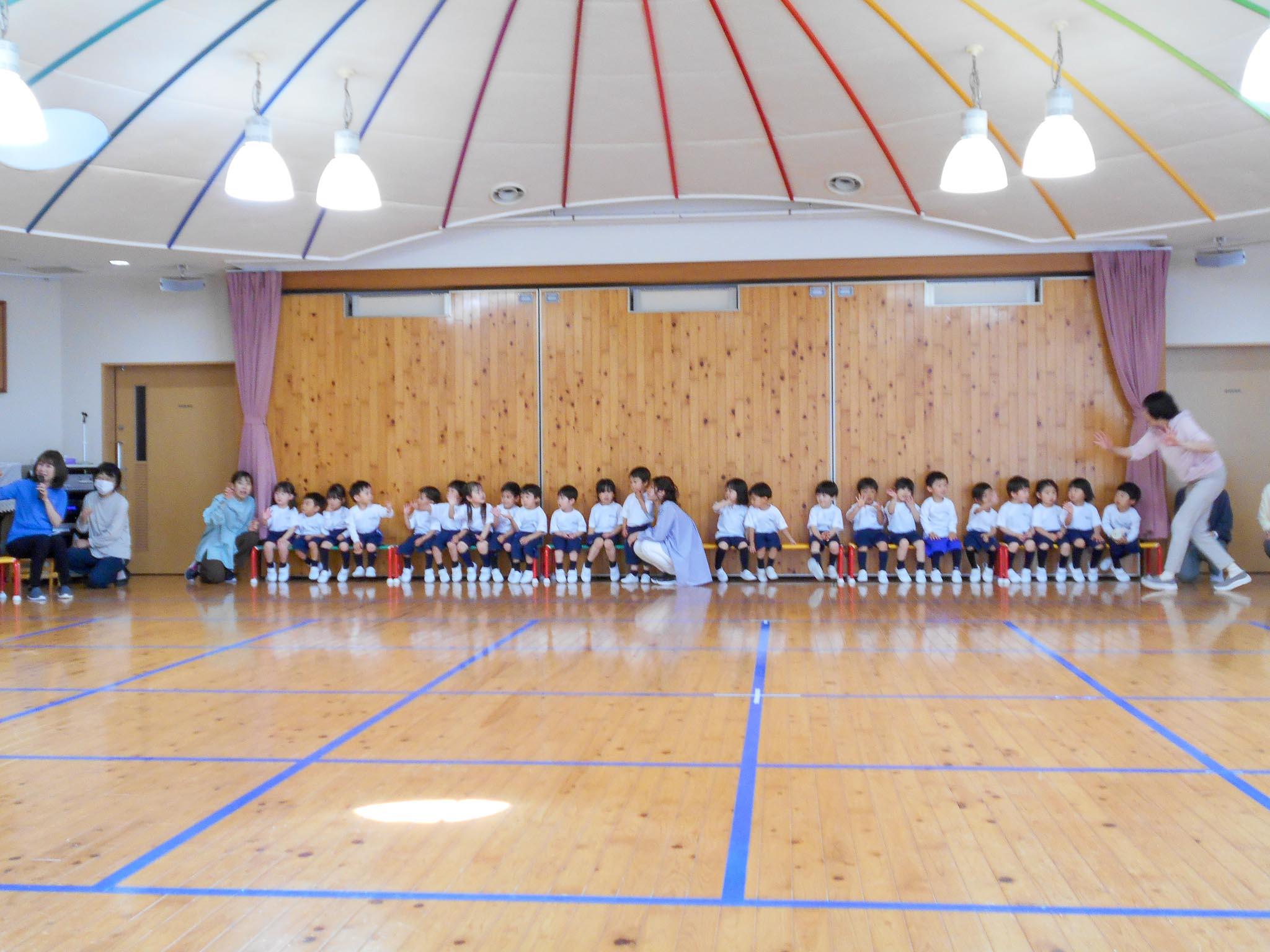 遊戯室に先に入って、よい姿勢で待ち構える年長・年中組のお兄さんお姉さんたち。入場してきたもみじ組・さくら組のお友達を、温かい拍手で迎えました。
