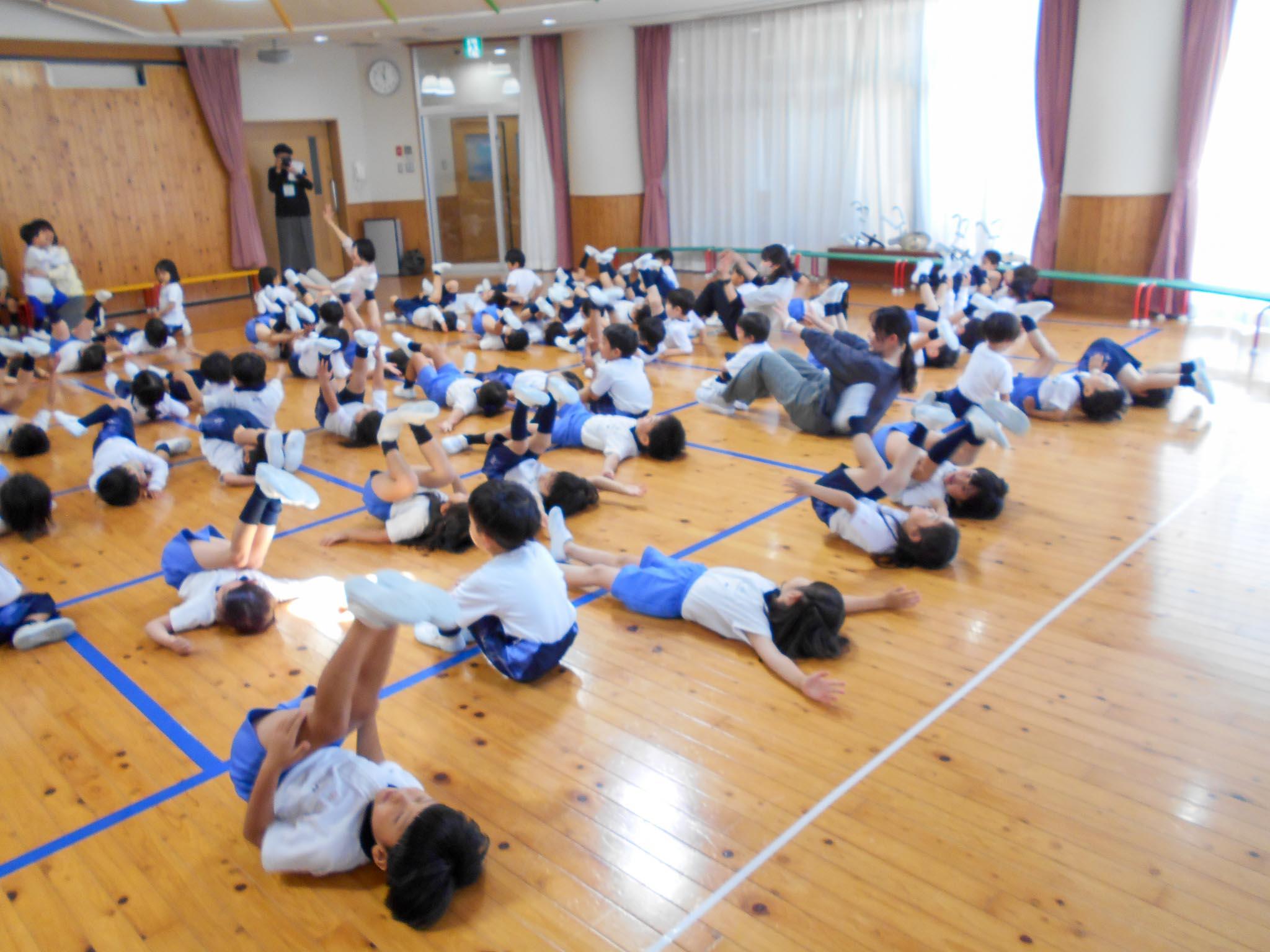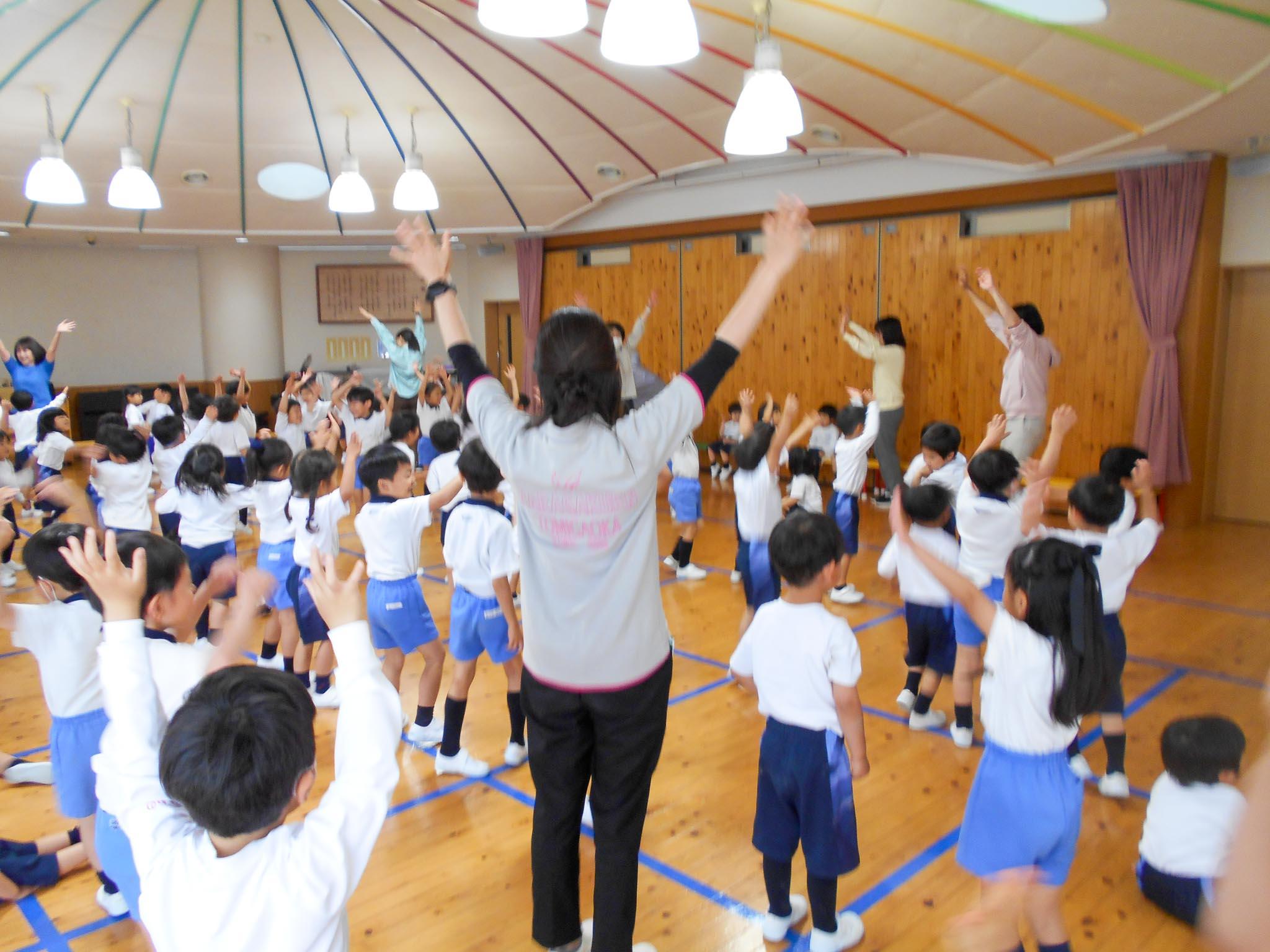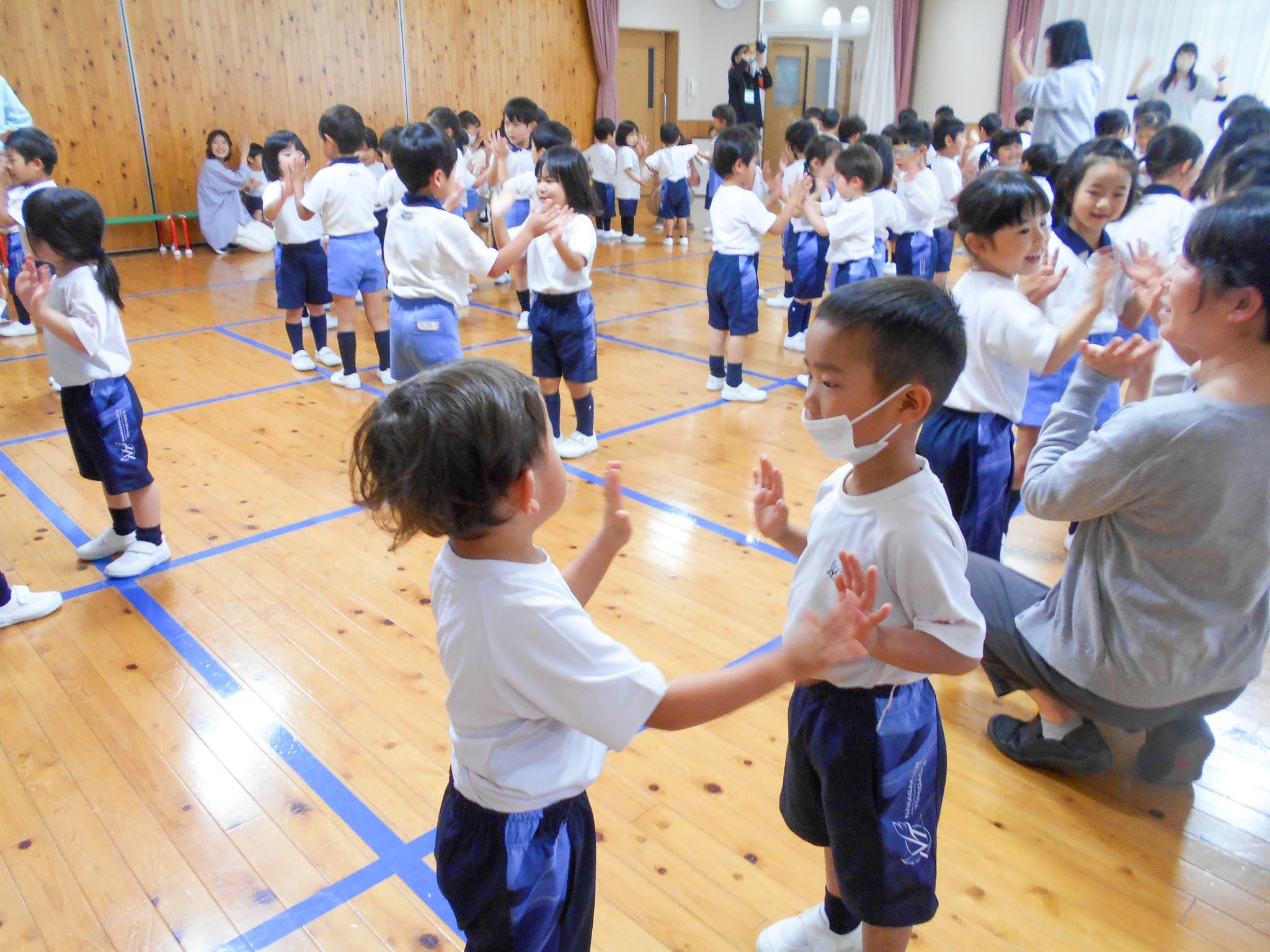 「おへんじのうた」で、クラスと先生方の紹介をしてから、「風がよんでいる」「おさんぽロック」など、音楽に合わせて体をいっぱい動かし、みんなで楽しく交流しました。