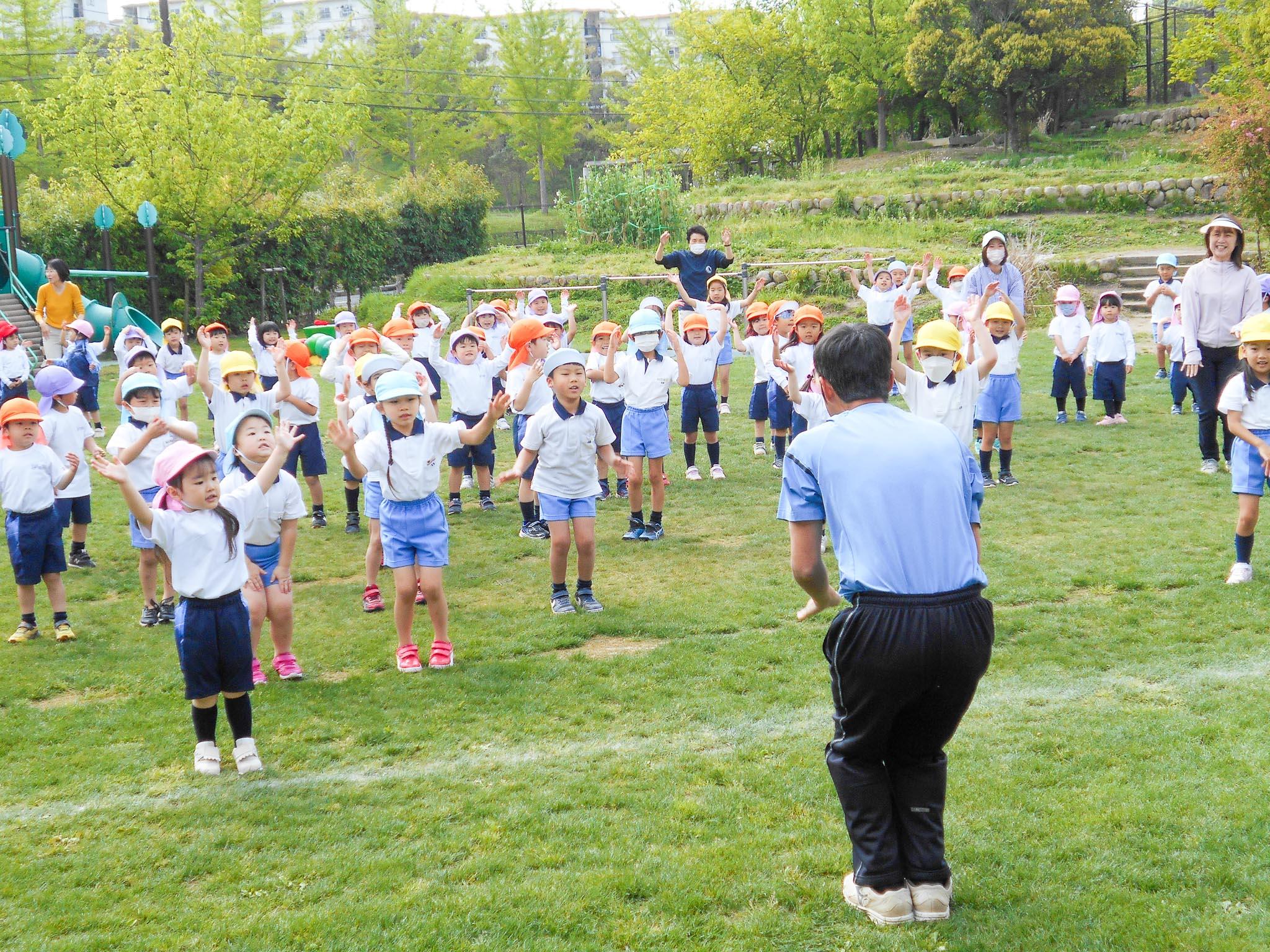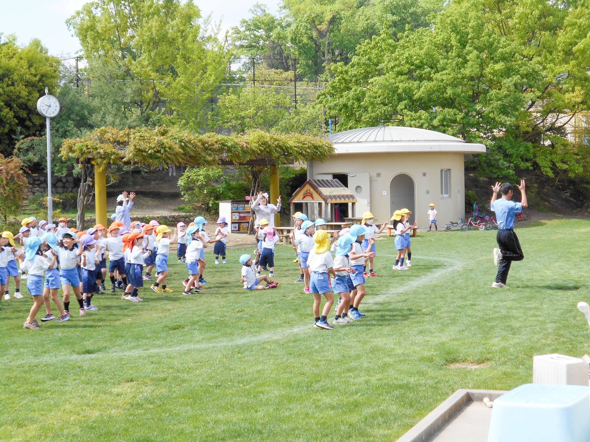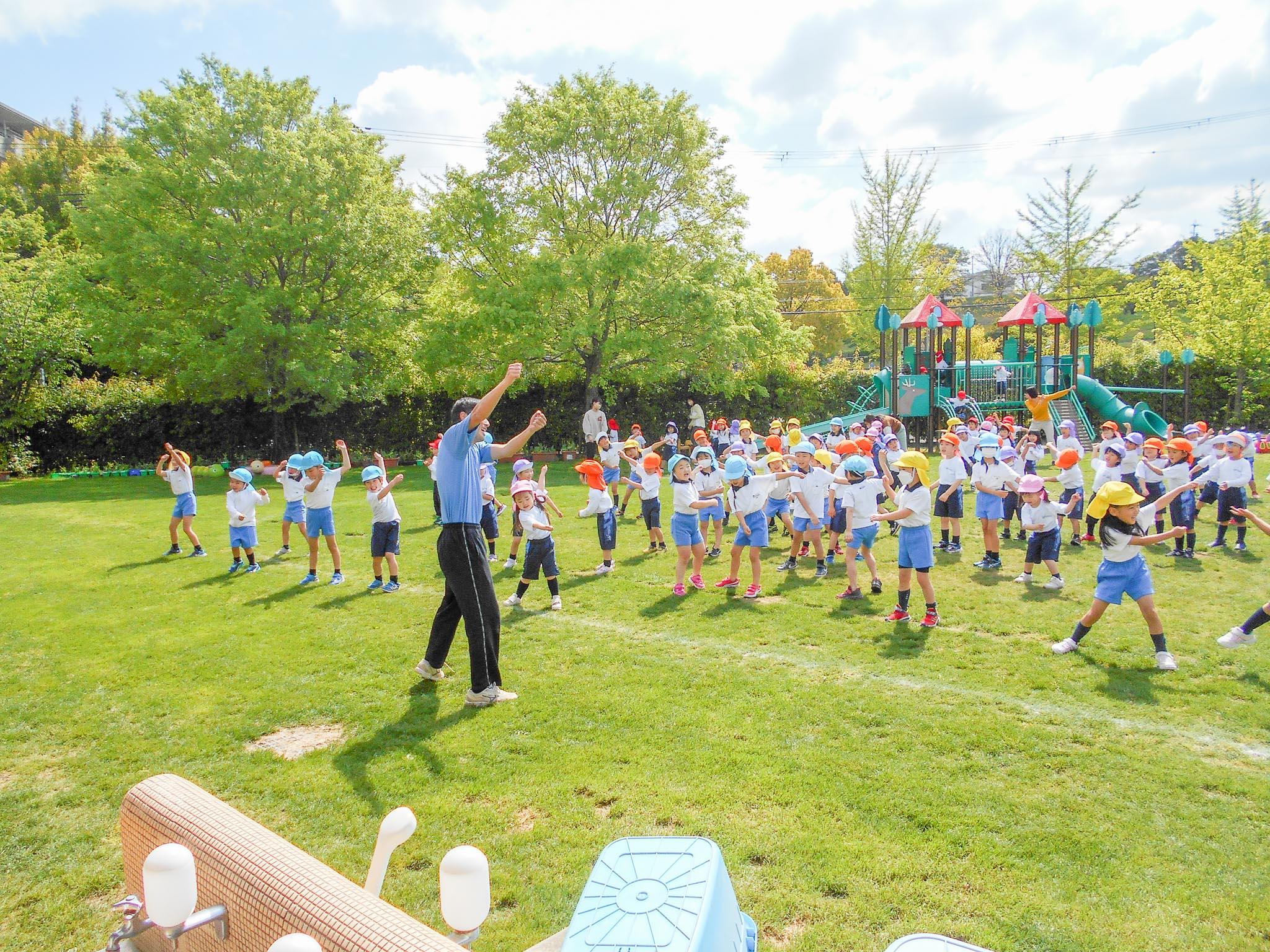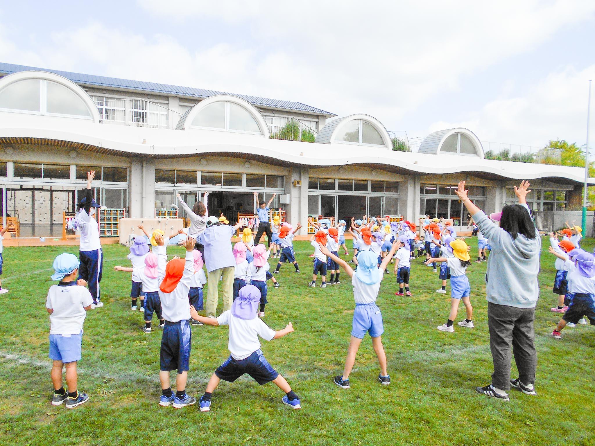 年少組・年中組・年長組のお友達が、全員園庭に集合して、一緒に体を動かします。