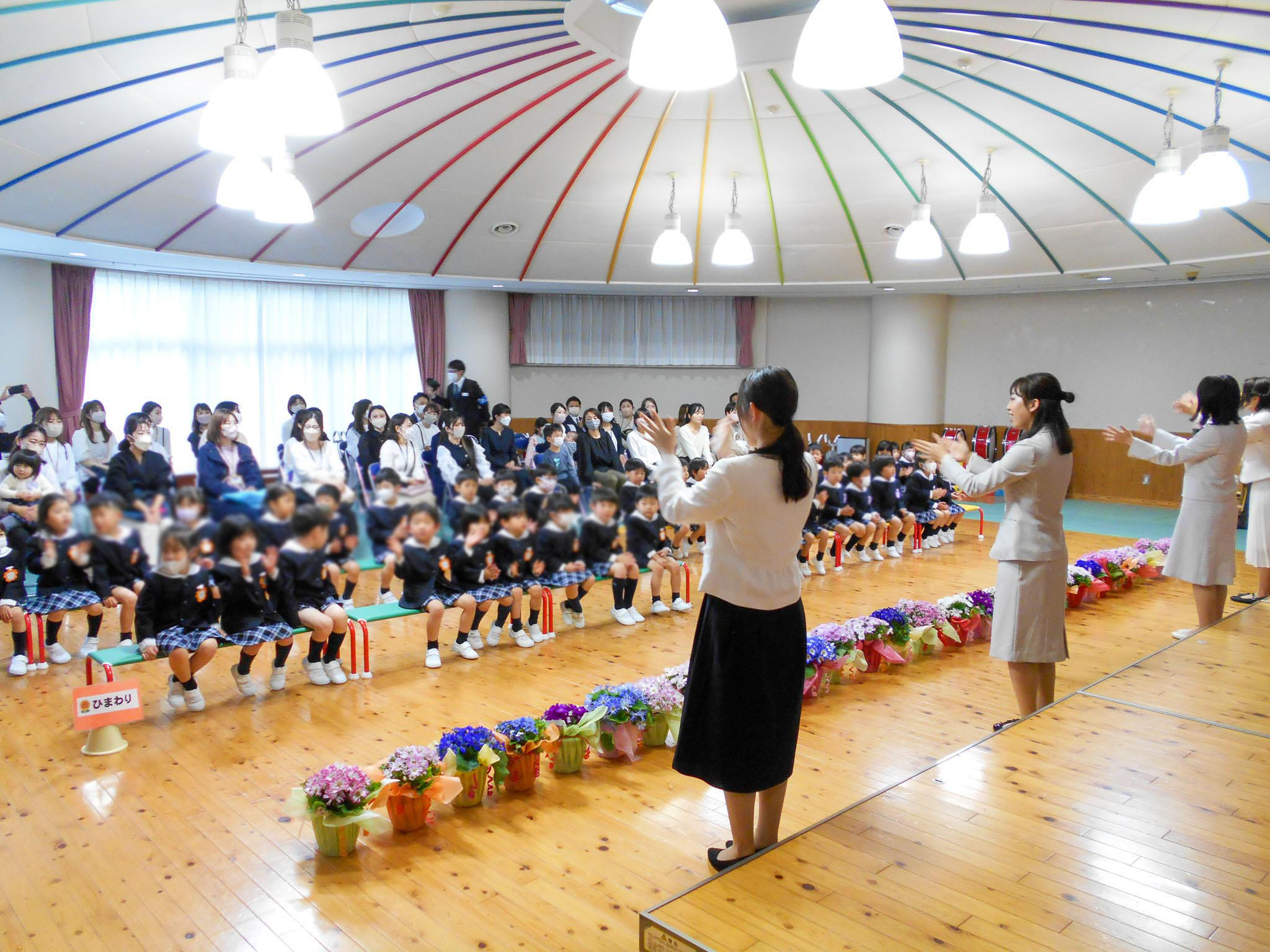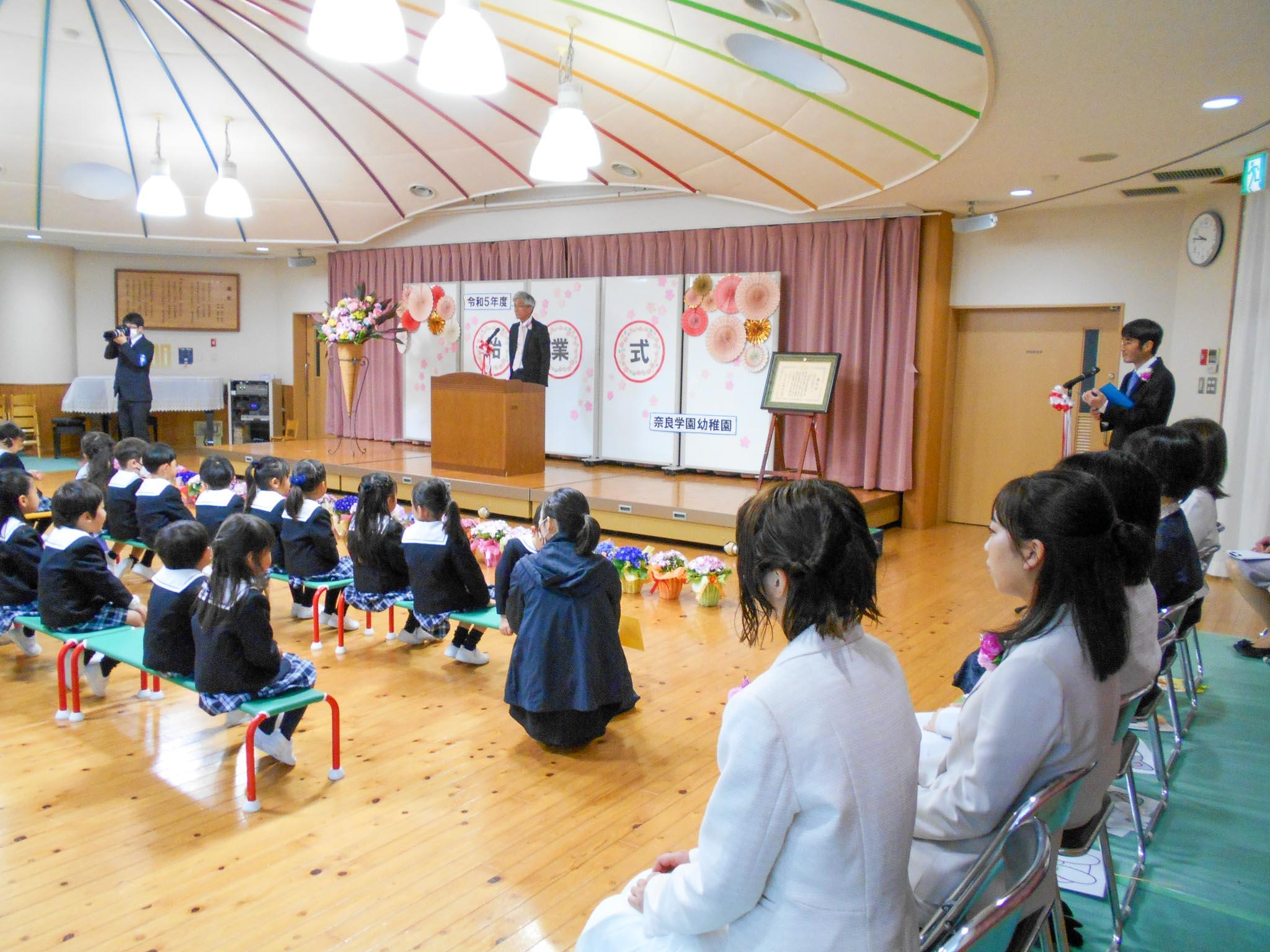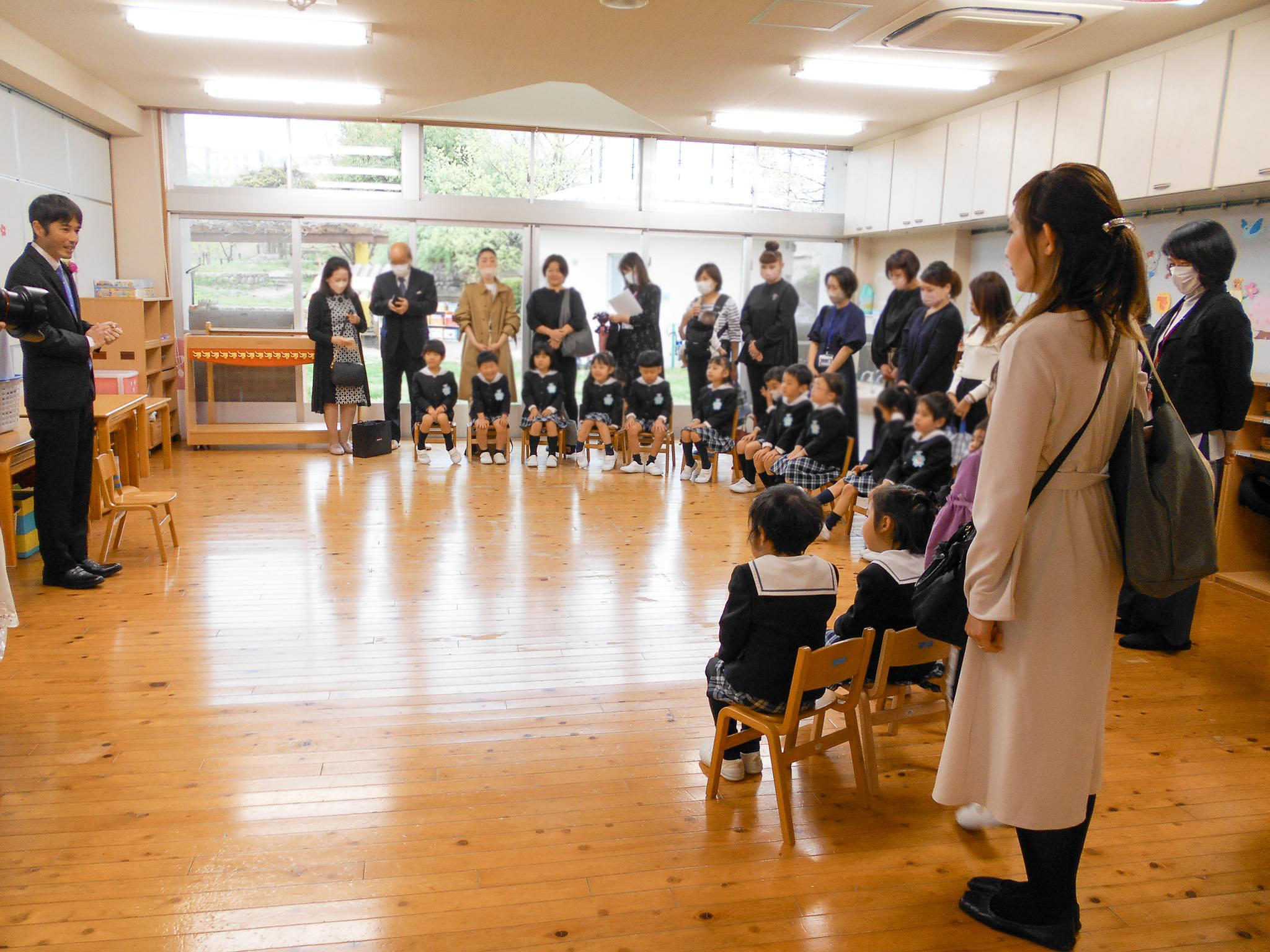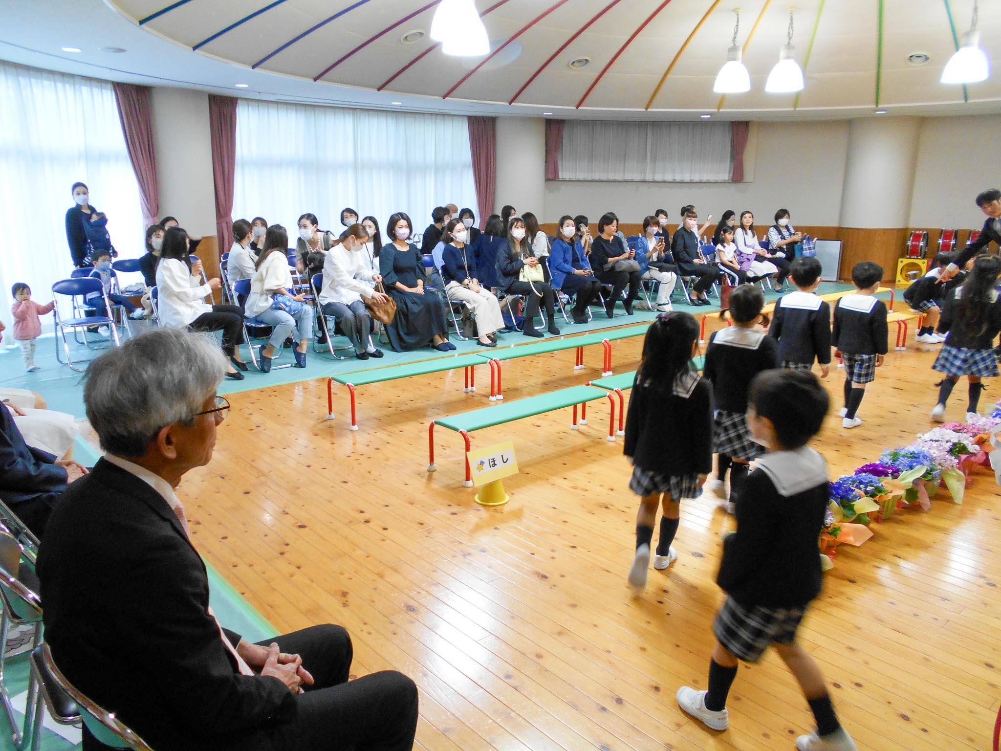 入園式と同様に園庭での実施を予定していましたが、あいにくの空模様でしたので、遊戯室に会場を移して実施することにしました。