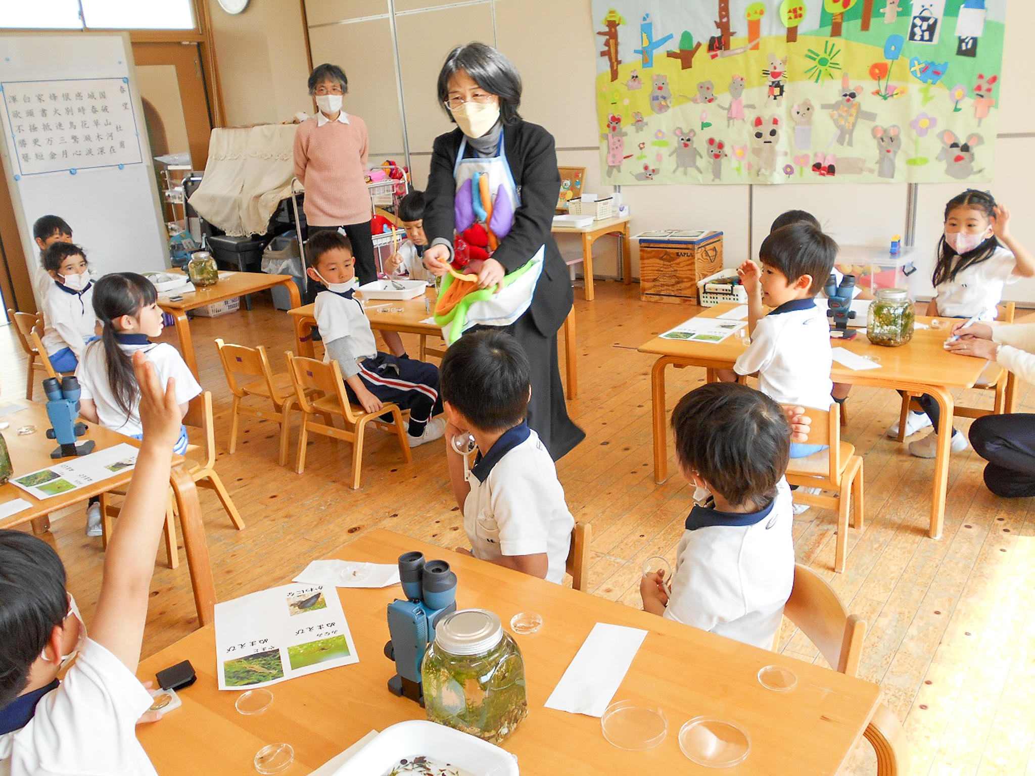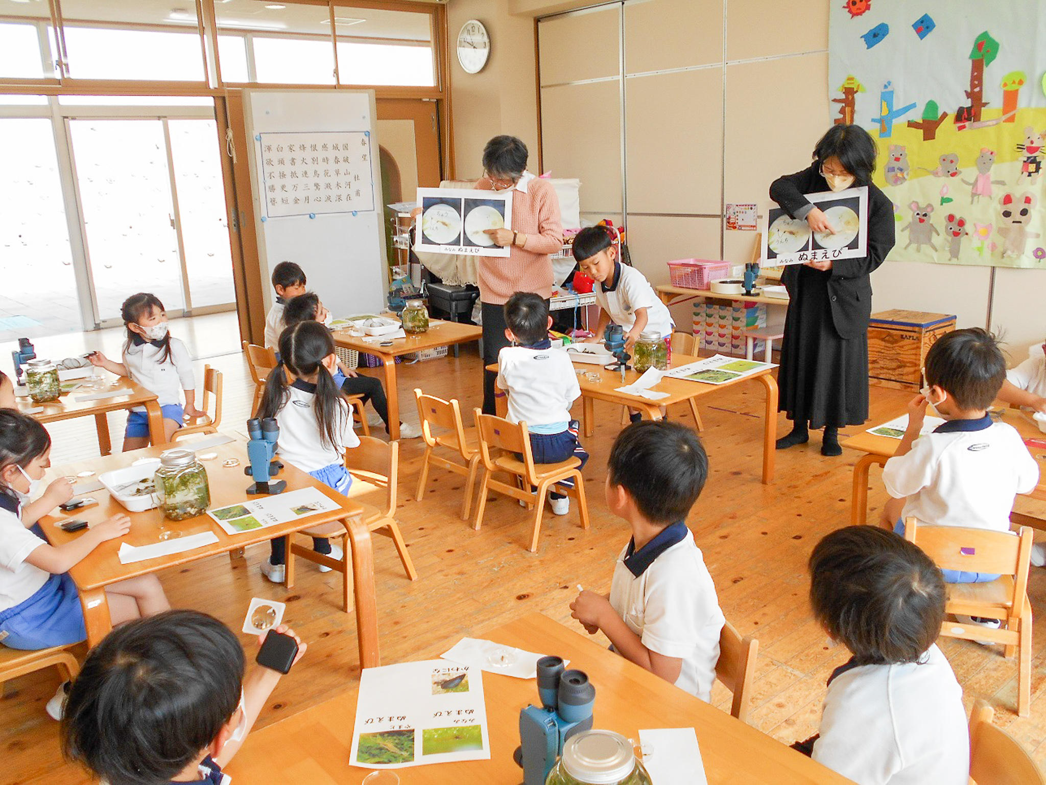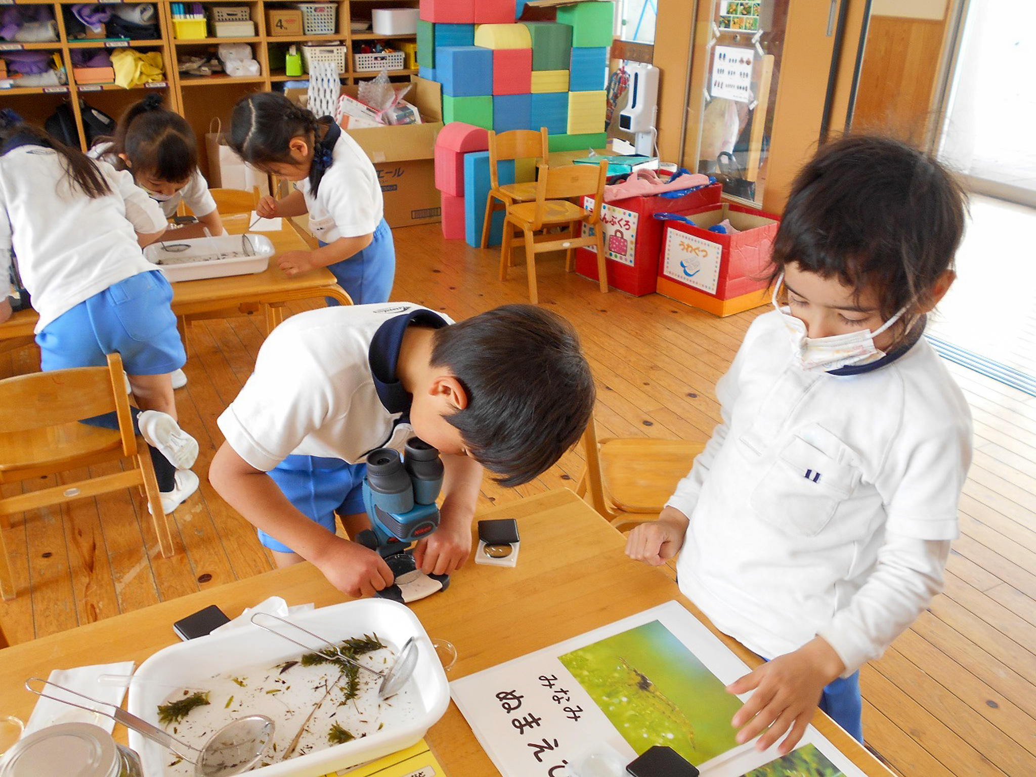 今日は、年中組が水中動物のえびを双眼顕微鏡を使って観察する体験をさせてもらいました。