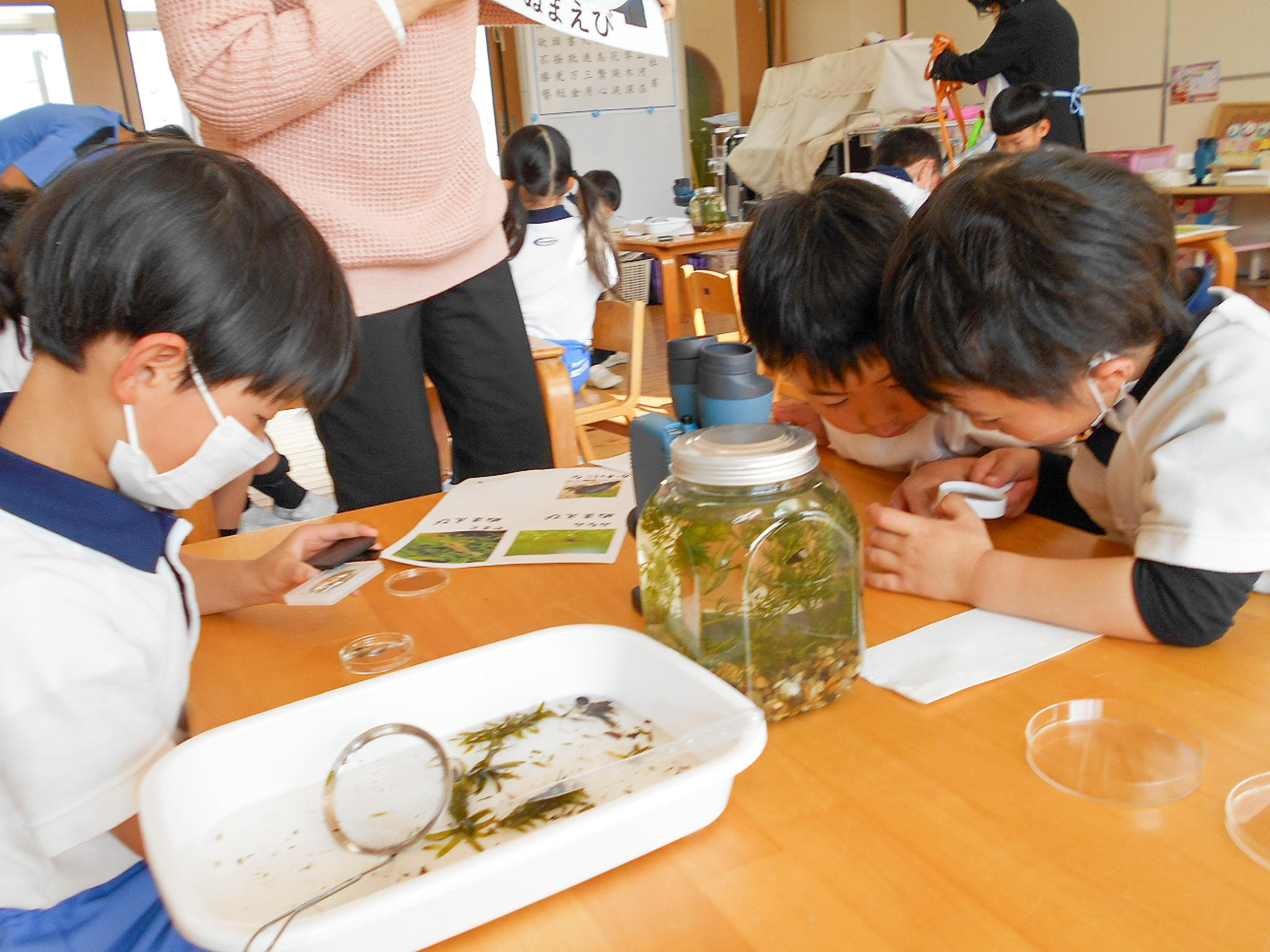 それぞれのシャーレーの中のえびを虫眼鏡でみていきます。その後、双眼顕微鏡でみていくとえびが透けているのがよく見えて、綺麗な模様も見えます。「見えた!見えた!」と驚いて大喜びです。