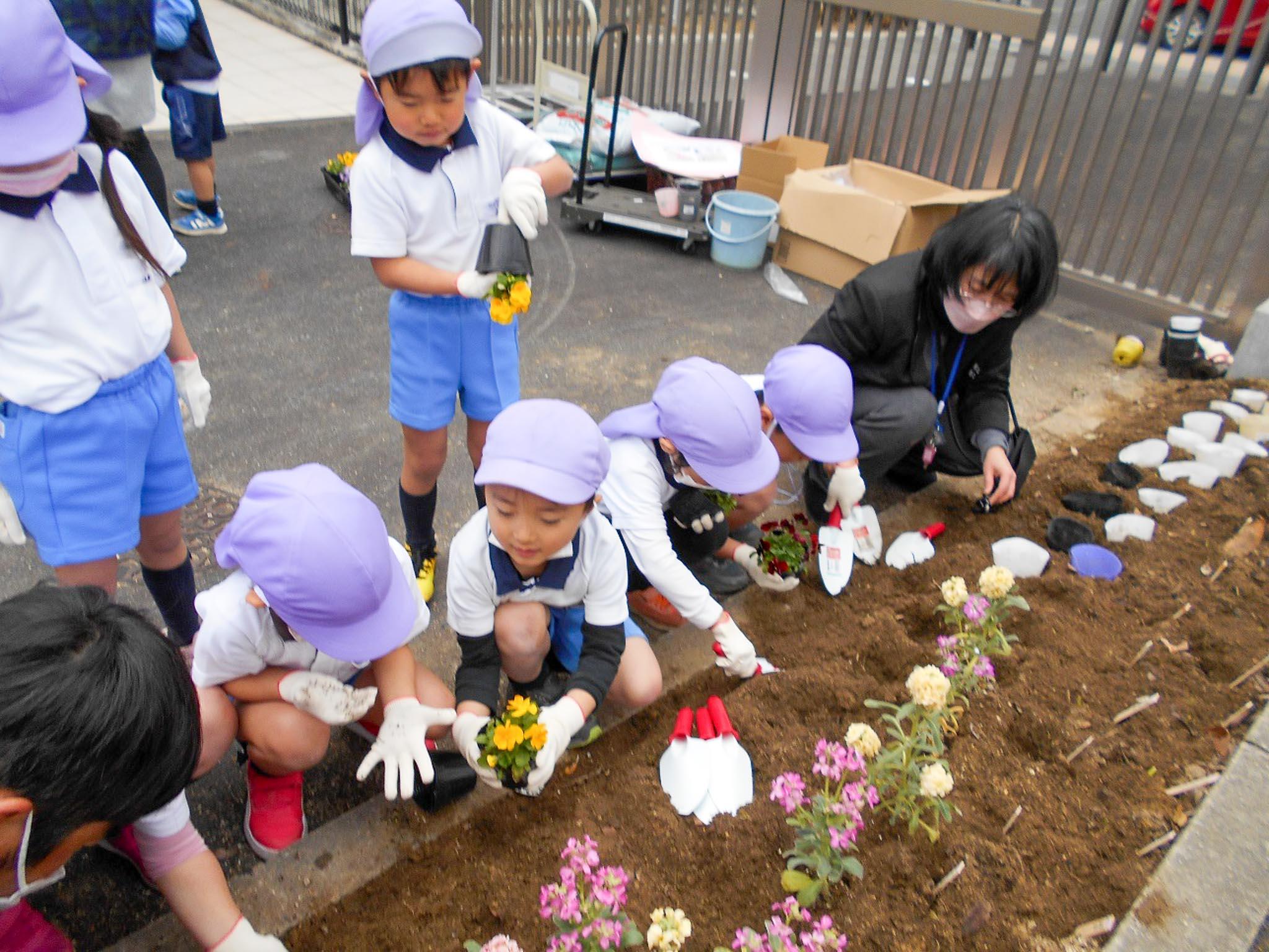 1人一鉢のチューリップや苺は植えていますが、幼稚園の玄関に植える事で、皆のために綺麗に出来たことは、とても嬉しく心の成長に繋がっていると思います。