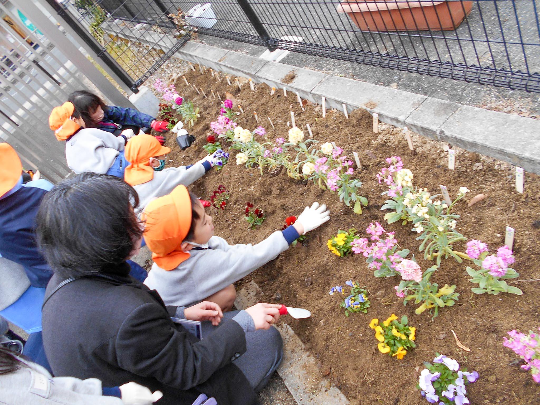 奈良学園大学と幼稚園で共同研究に取り組んでいます。幼稚園では、自然環境を活かした取り組みをしているところですが、この度奈良学園大学との共同研究として、花の苗を植えて育てるということを通して、自分で育てた苗が育って綺麗に花咲くところまでお世話をすることを体験します。