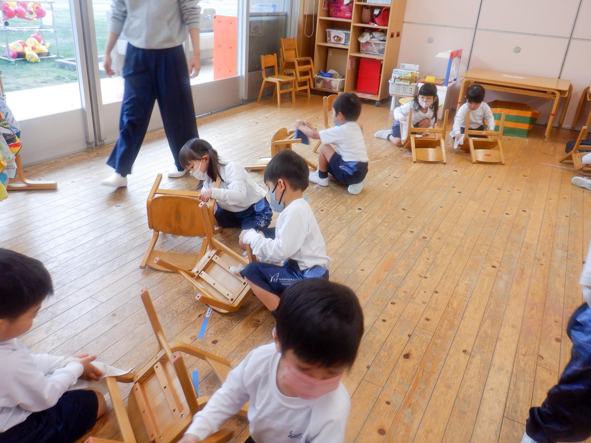 先生達が、子ども達の様子を見ながら「わぁすごい!ピカピカになってきた。皆のお手々は魔法みたい。お手伝い上手です。」と話しかけるとますます頑張っておそうじしていました。