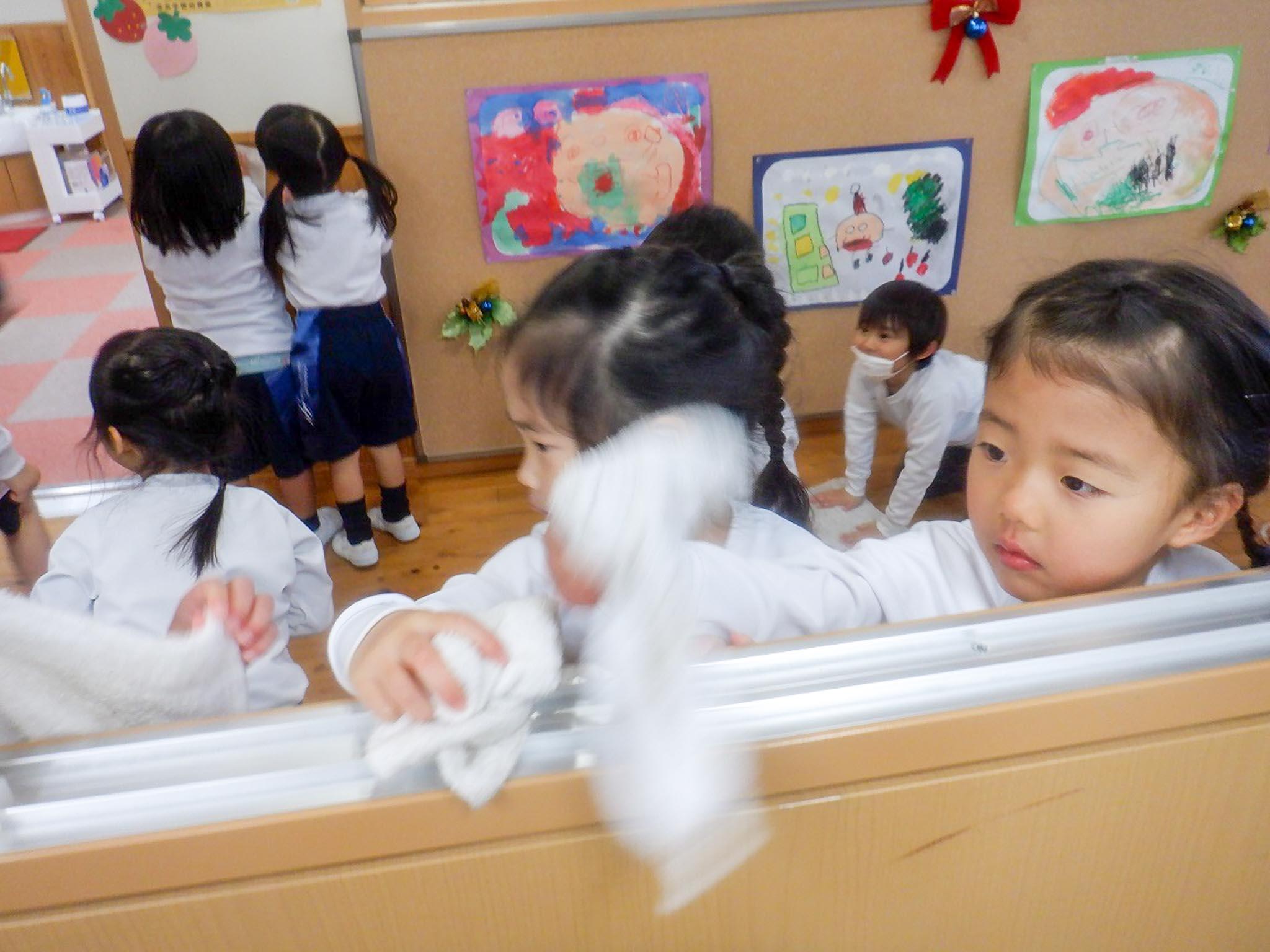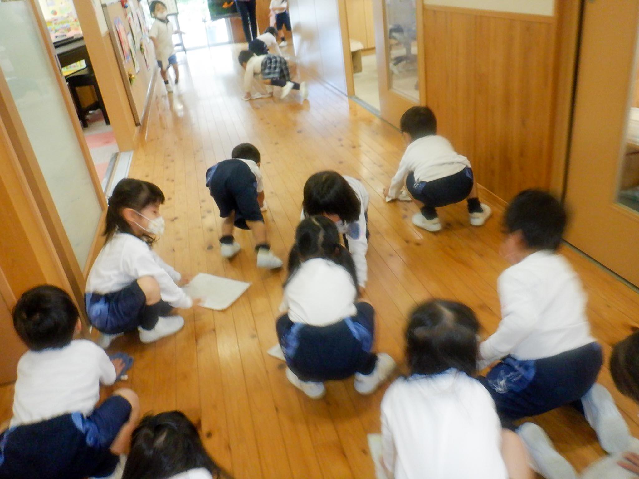 みんな、可愛い手で雑巾をにぎりしめて、ゴシゴシ拭きました。