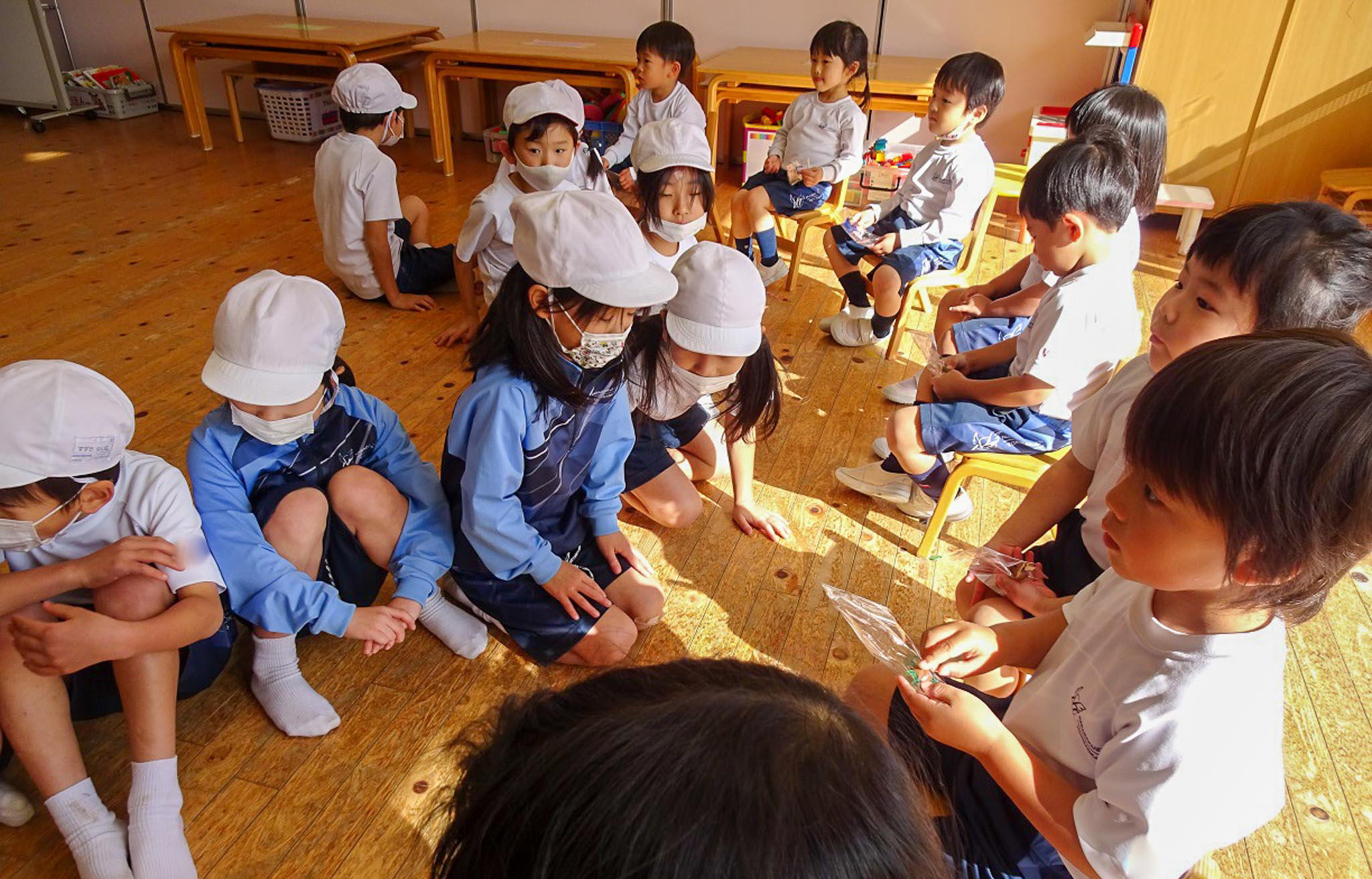 クラスでご挨拶をしてプレゼントも用意してきてもらったので、年少組さんは嬉しそうにもらっていました。