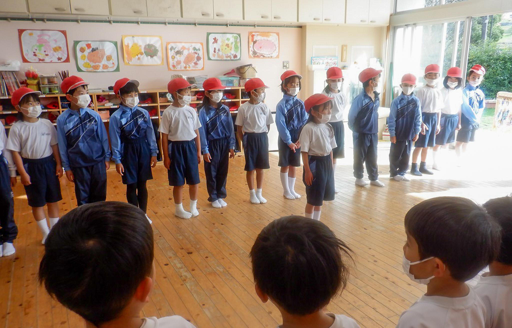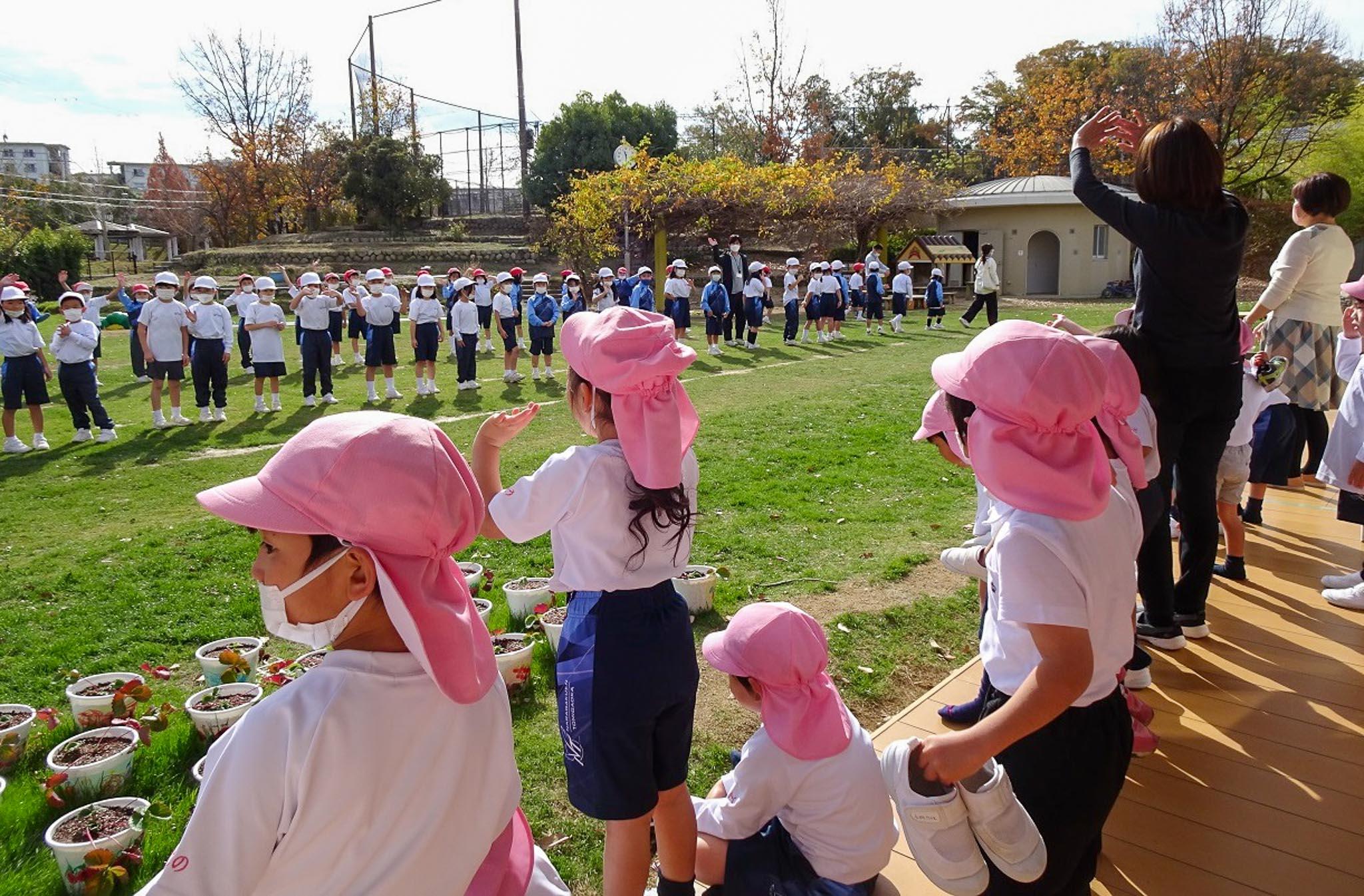 年少児達はお部屋から園庭にいる1年生のお兄ちゃんお姉ちゃんに「またきてね~」「おべんきょうがんばってね~」と手を振りながら見送りました。