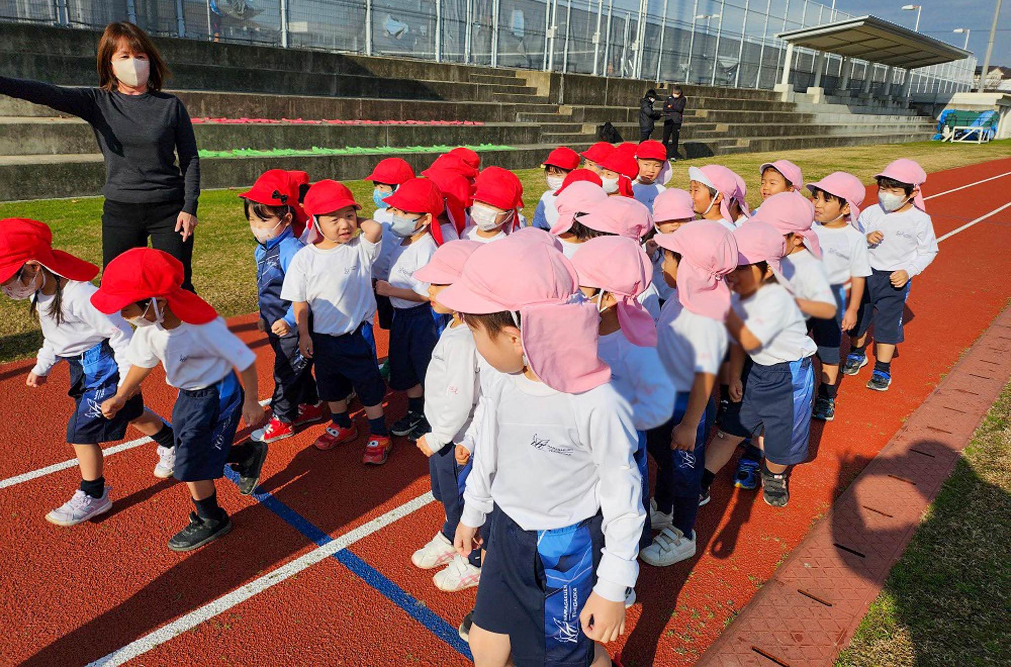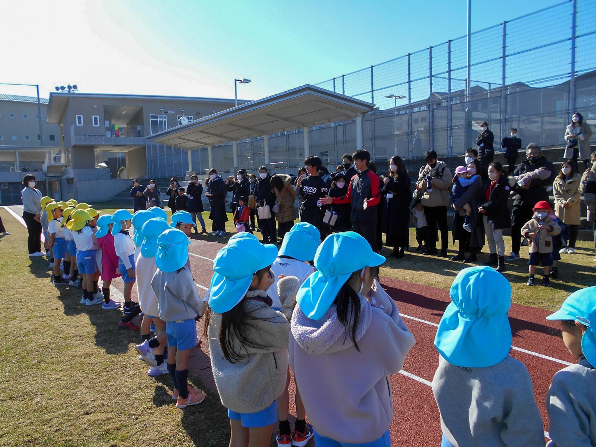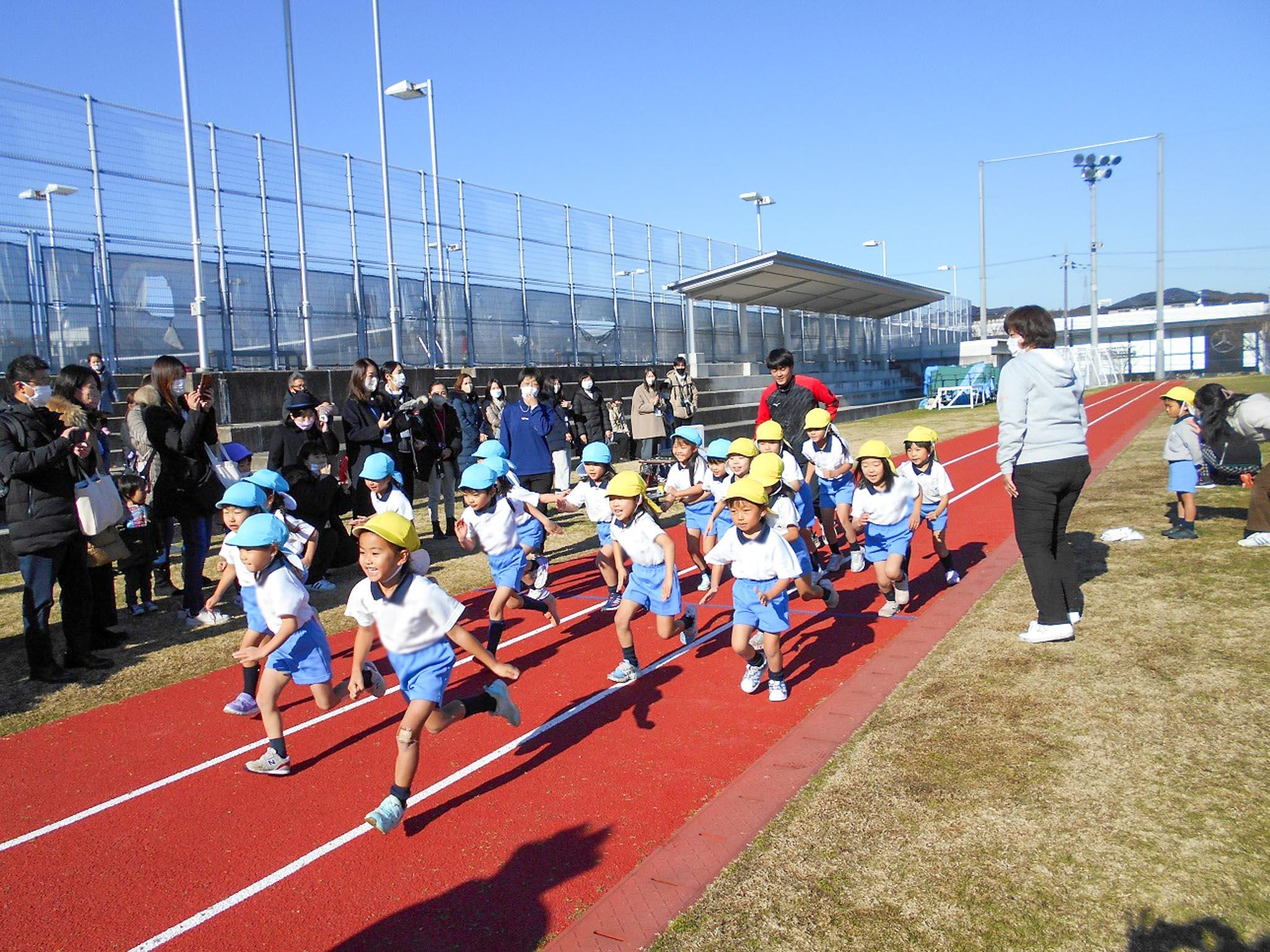 年少組から、学年ごとで総合グランドのタータンを駆け抜けました。年少組は1周・年中組は1周半・年長組は2周です。