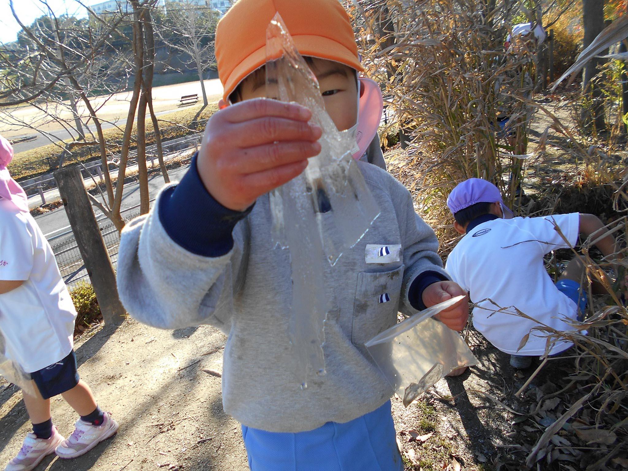 氷を取ってきてはお部屋に持って入ったり、「おうちに持って帰る」と言って袋に入れたりしていました。帰る頃には、すっかり溶けて水になっていたのですが、それでも「持って帰る」と言っておうちの人に見せると、それを見て苦笑しながらも「氷張ってたのね。溶けちゃったのねえ。」とすっかり水になったビニールの袋を持って帰って下さるので、子どもの思いを受け止めてくださっているなあと感心しました。