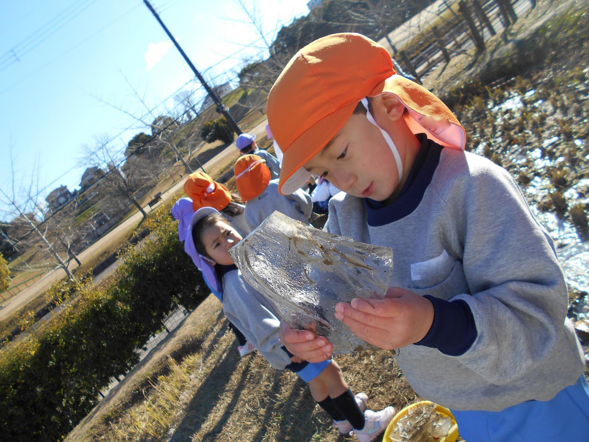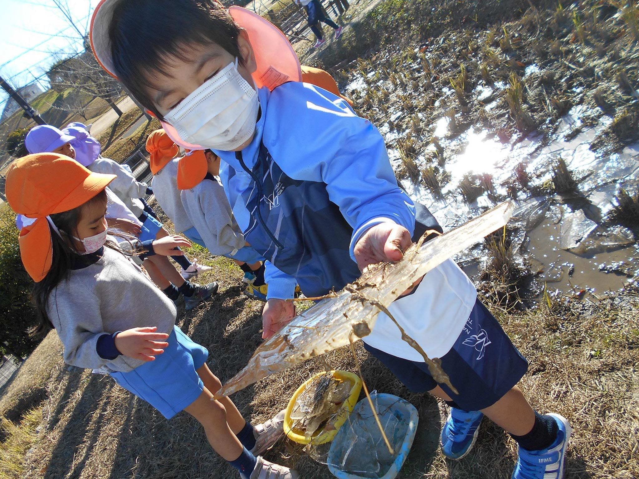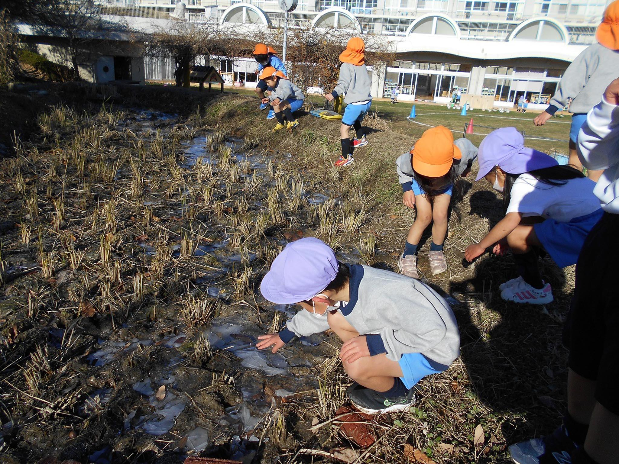 棚田の水やビオトープの水が分厚く張っていたので、「すごい氷いっぱい!いっぱい!」と知らせてくれていました。
