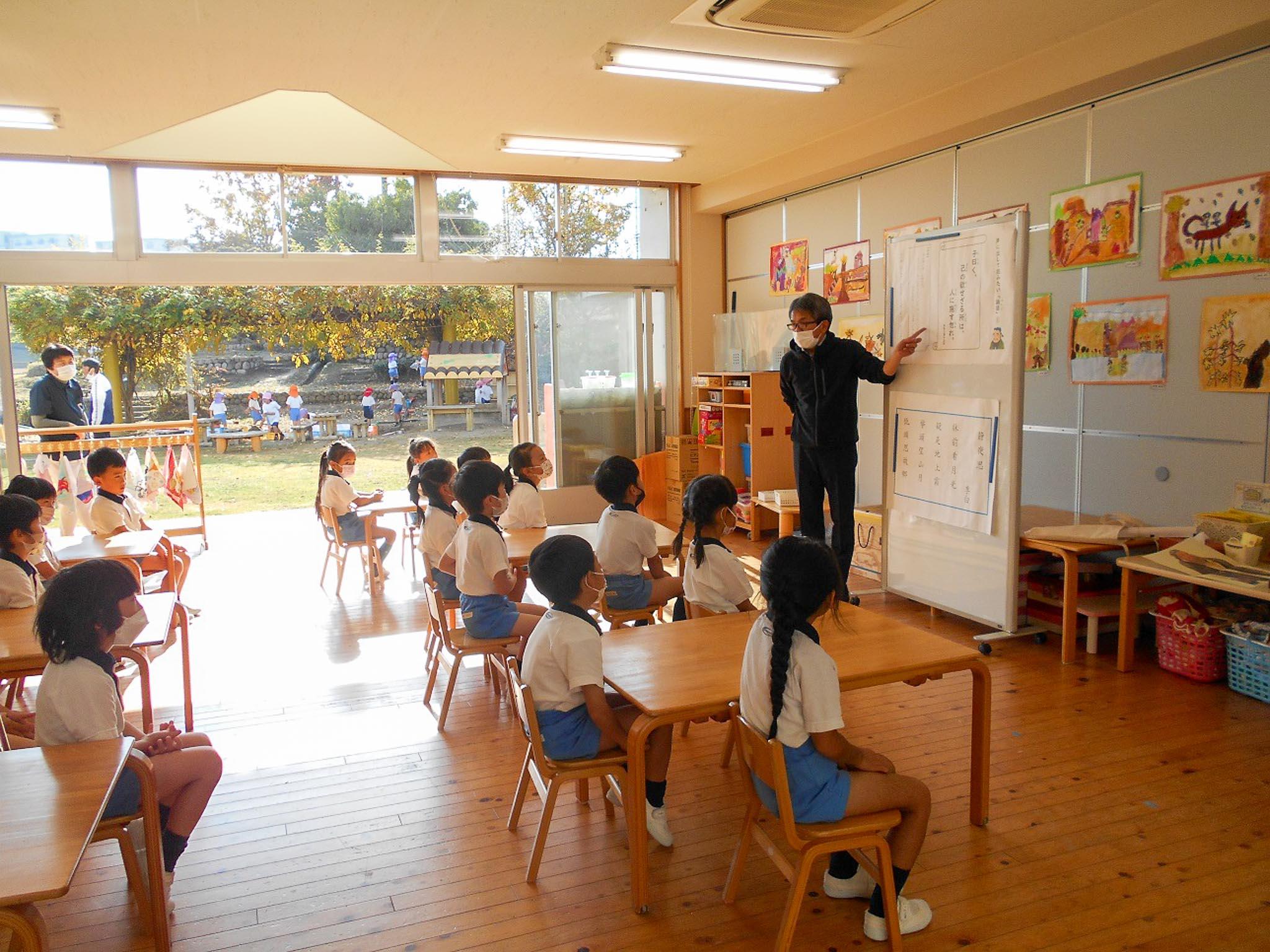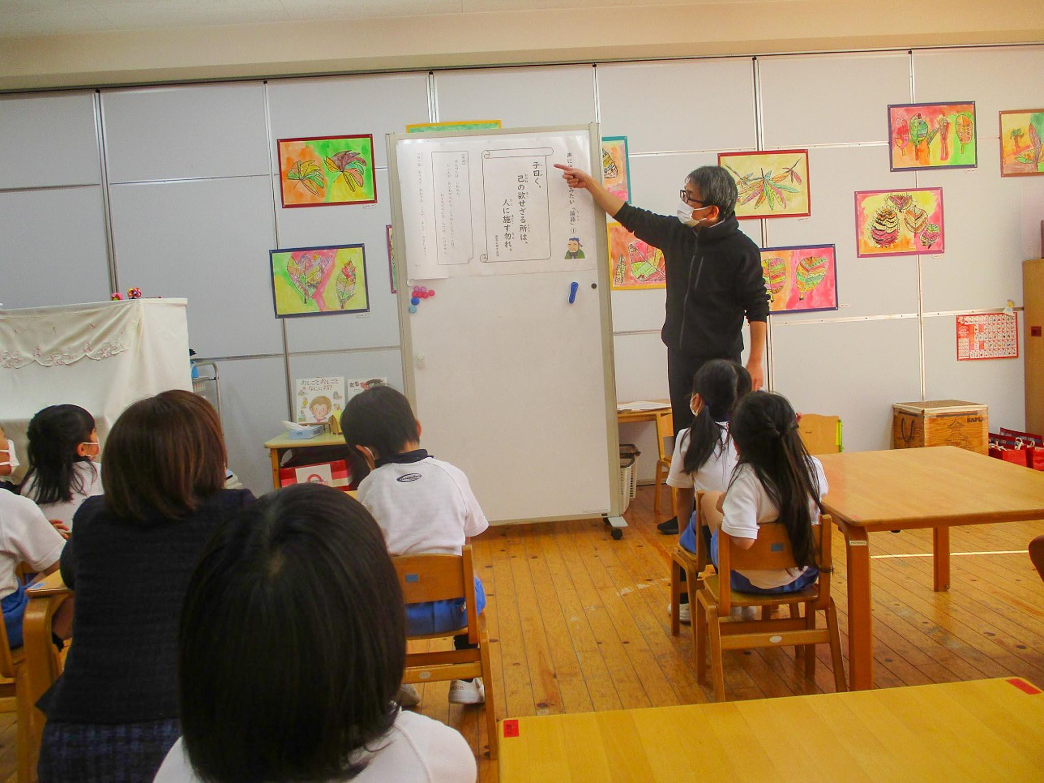普段している素読では、言葉のリズム感を大切にして、一月ひとつの漢詩を覚えて友達と声を合わせて素読しますが、文章の意味までは、読みません。保護者の方には、えんだよりでお知らせしているので、わかってくださっていると思いますが、子ども達は、あくまでも漢詩の美しい言葉のリズムを素読で唱和する繰り返しです。論語の場合は、今の子ども達に必要な深い意味が語られているので、子ども達も真剣に聴いて真剣に唱和していました。幼稚園の間に、考えて身につけて欲しい意味の言葉でした。